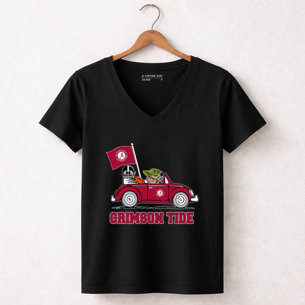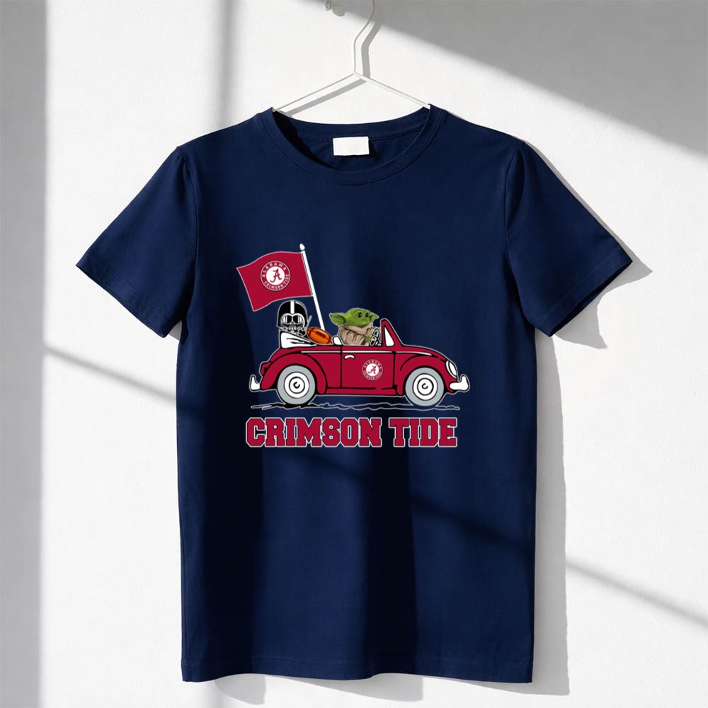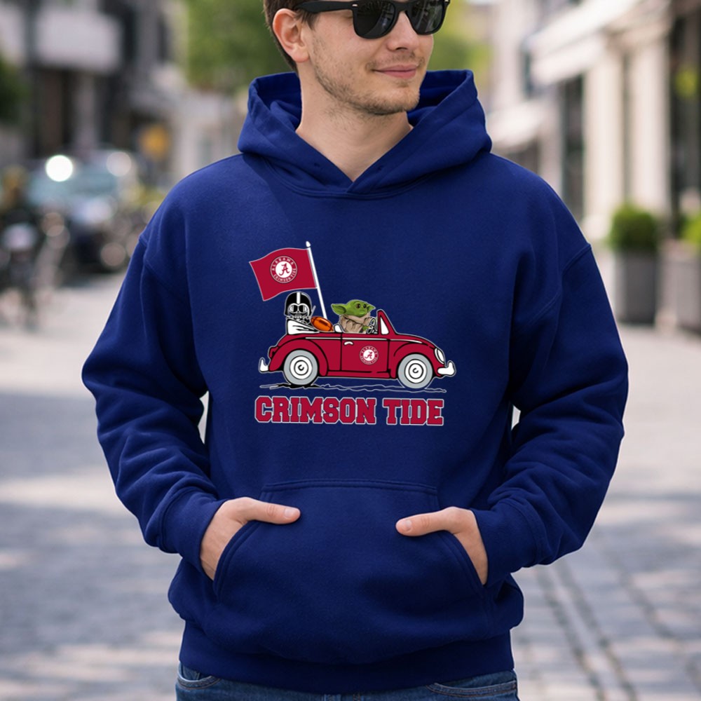This unique mashup captures the essence of fandoms colliding, featuring Darth Vader and Baby Yoda joyfully cruising in a classic red car, proudly waving the Alabama Crimson Tide flag. The playful style and vibrant colors evoke a sense of nostalgia and community, inviting fans to express their love for both college football and the beloved Star Wars universe. It’s a celebration of shared passions and spirited camaraderie.