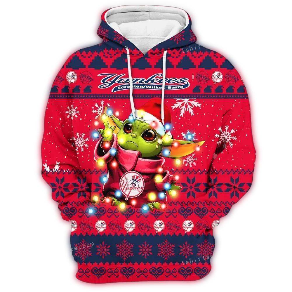 This enchanting hoodie captures the whimsical charm of Baby Yoda nestled among Christmas lights and snowflakes, all while proudly displaying the New York Yankees logo. It embodies the joy of the holiday season, merging sports pride with the playful spirit of fandom. Every detail reflects a celebration of both nostalgia and the festive cheer that comes with being a dedicated Yankees fan.