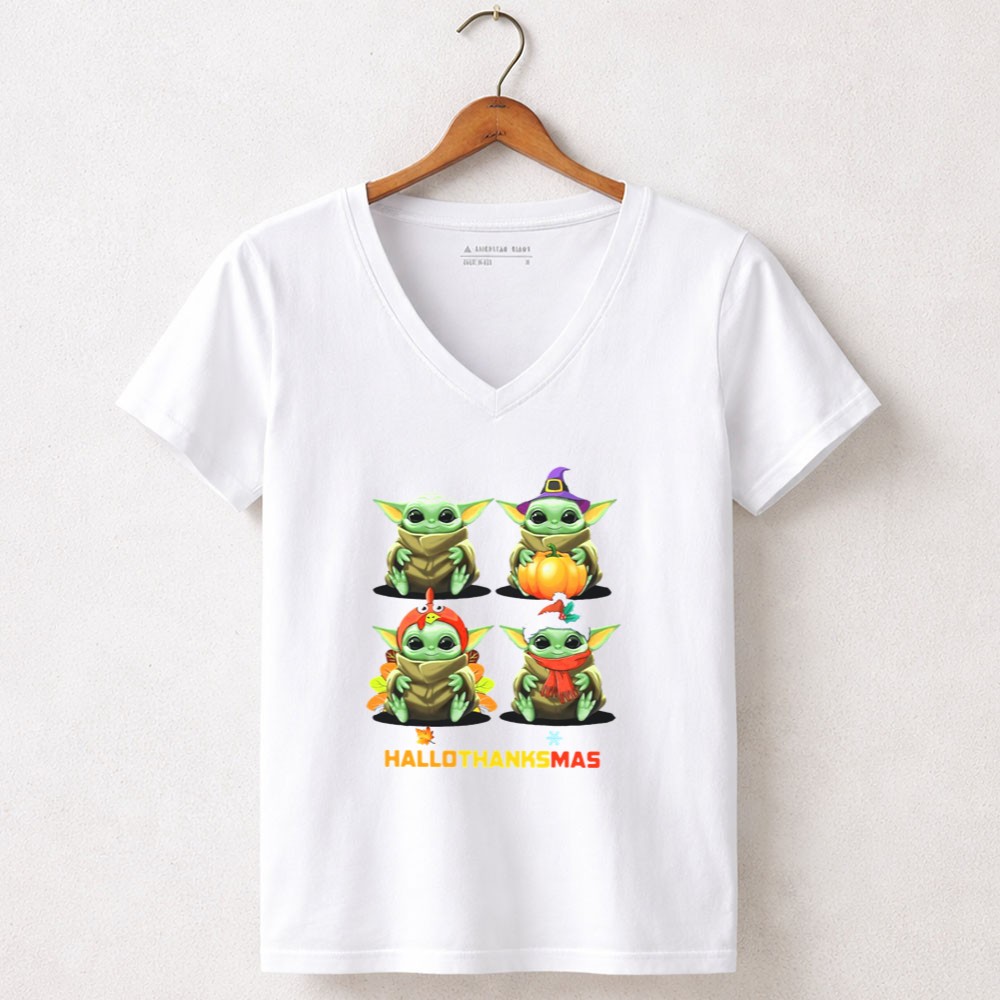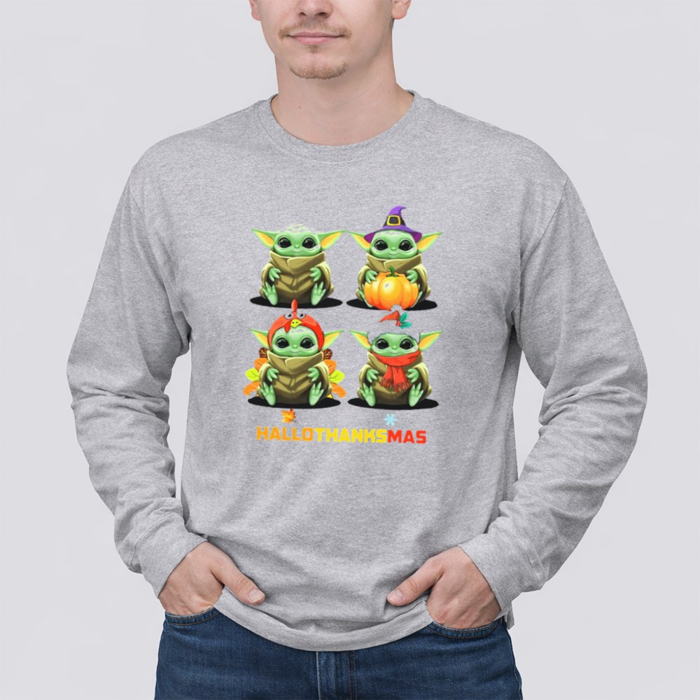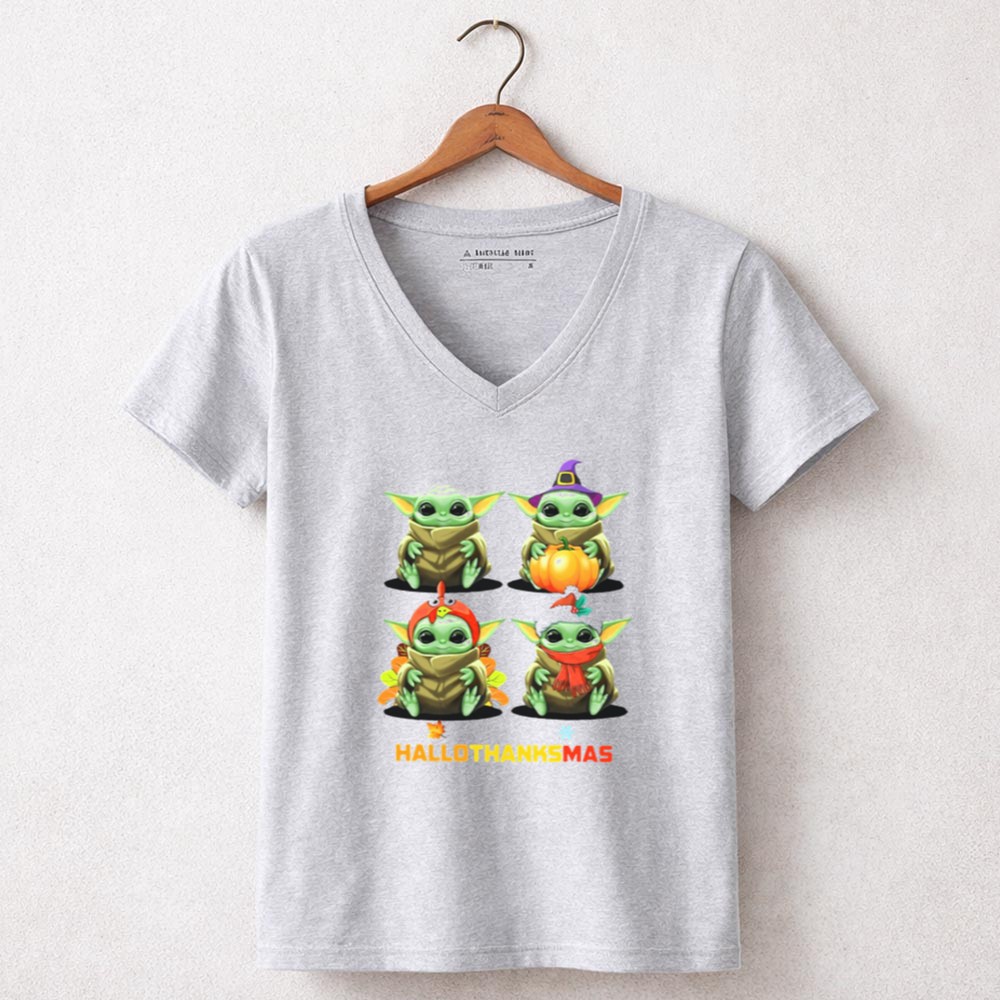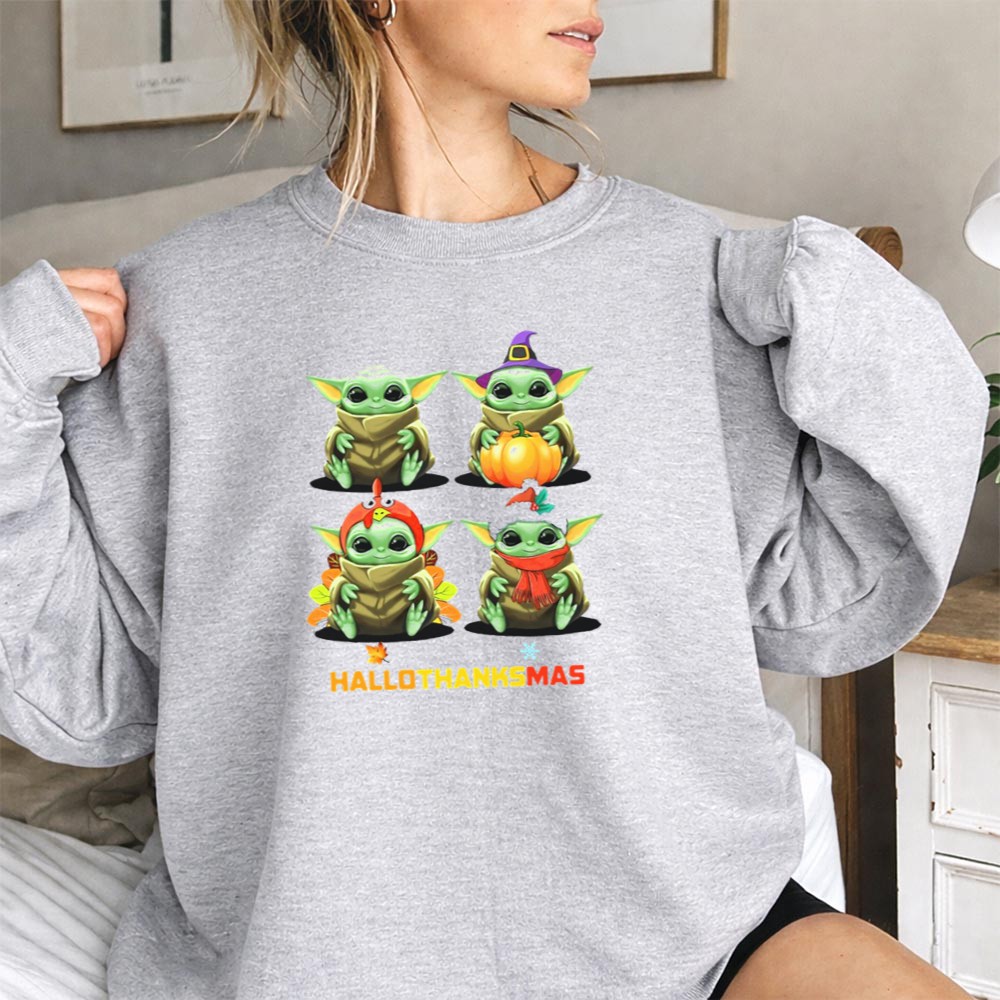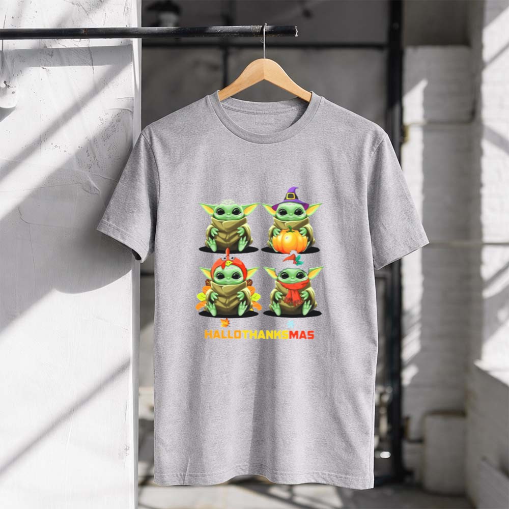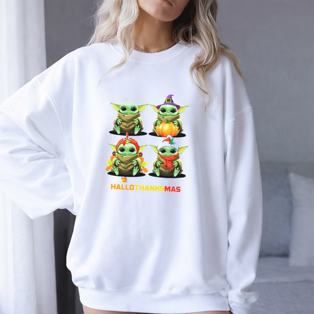 This delightful design features four adorable Baby Yoda characters, each embodying the spirit of Halloween, Thanksgiving, and Christmas, united under the playful phrase ‘HALLOTHANKSMAS.’ With vibrant colors and a family-friendly style, it captures the joy of shared moments and cherished memories, inviting everyone to embrace the laughter and love of the holiday season.