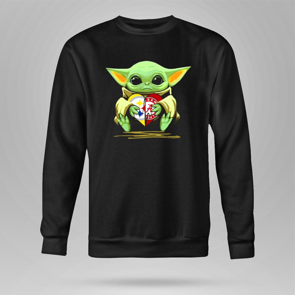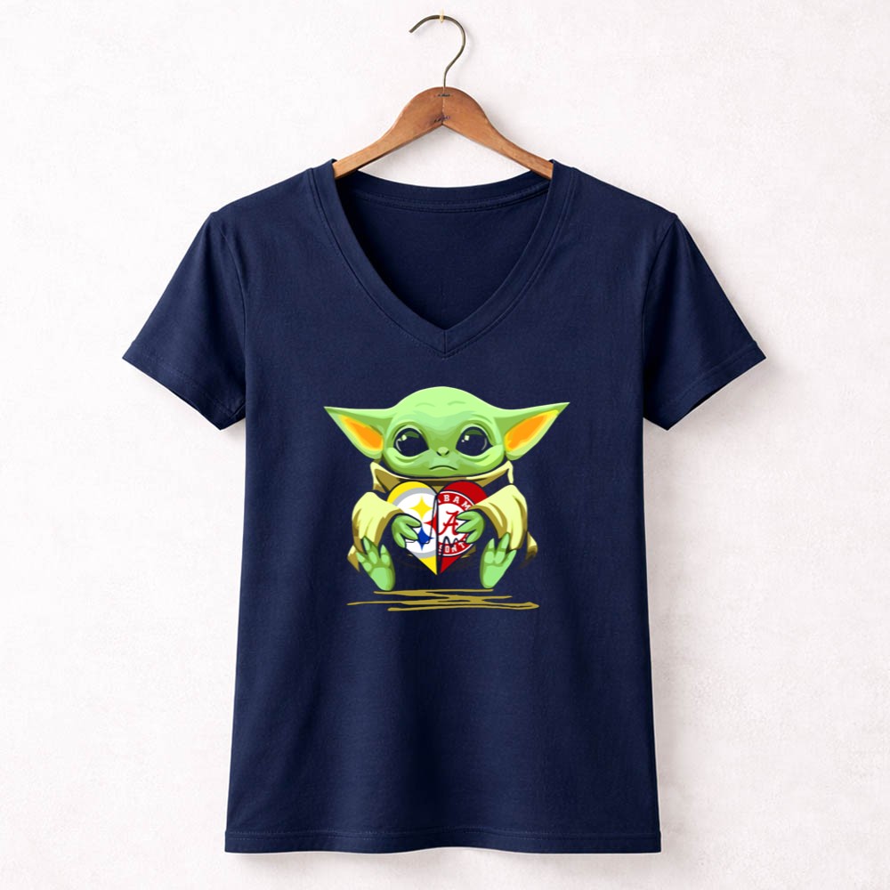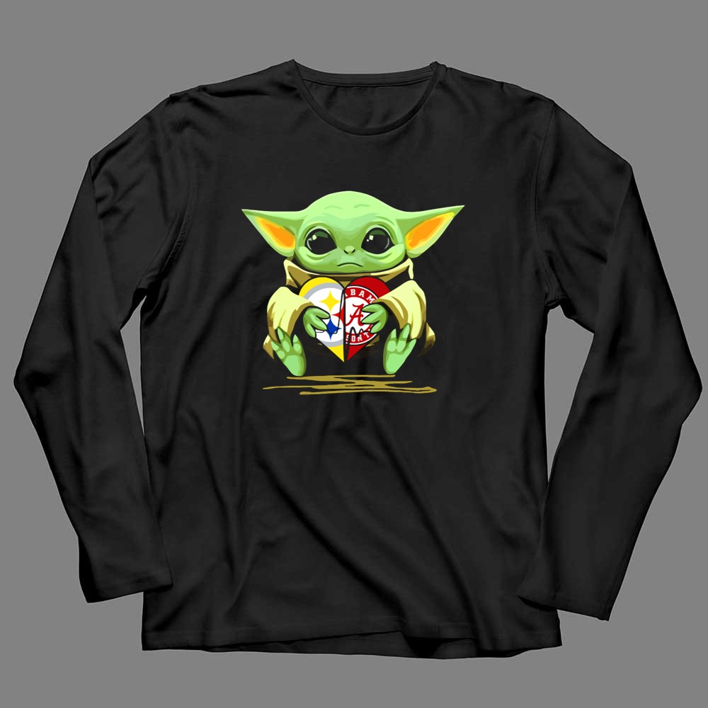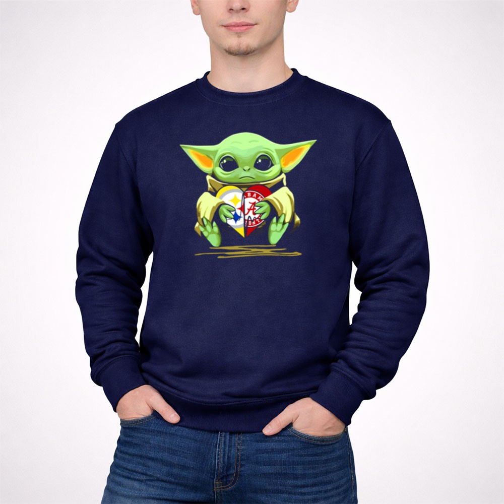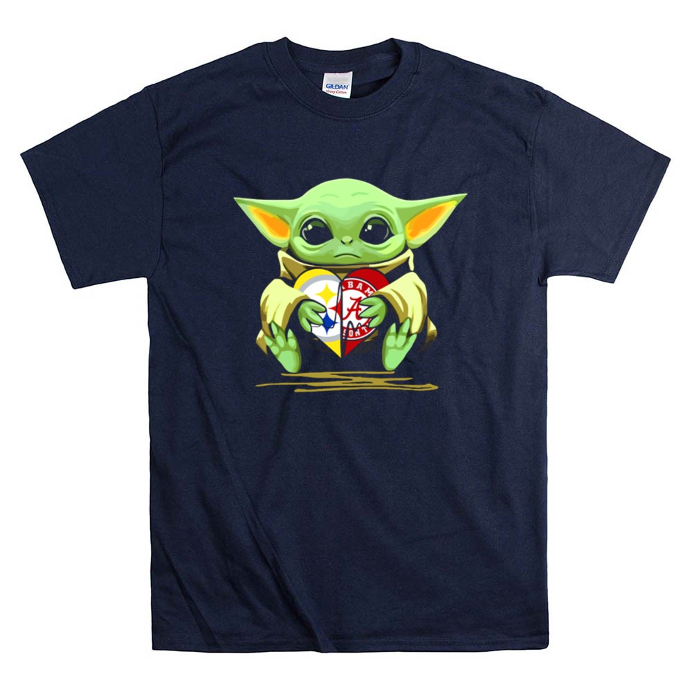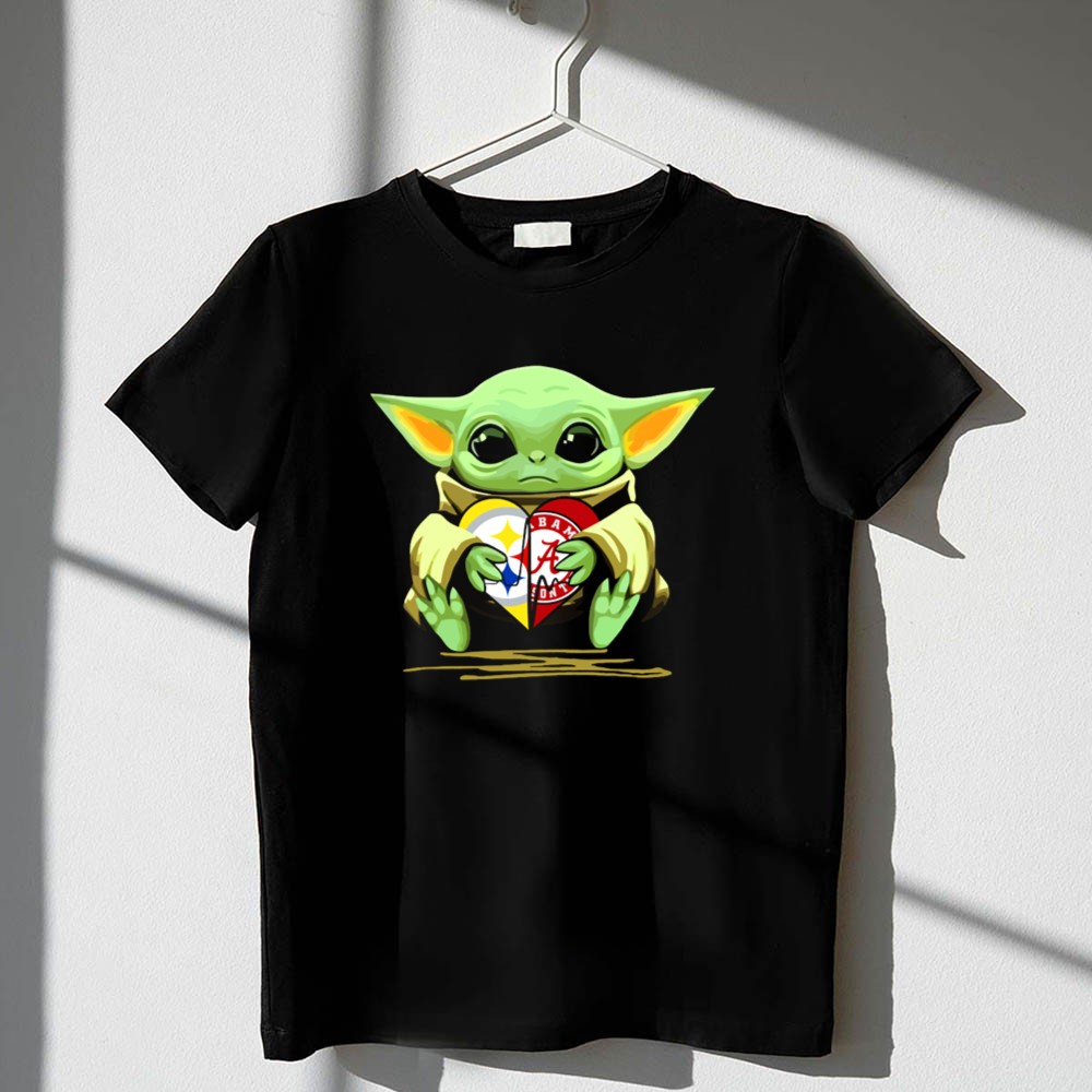 This playful design captures Baby Yoda cradling a heart adorned with the Pittsburgh Steelers and Alabama Crimson Tide logos, symbolizing the love for two legendary teams. The vibrant colors and cartoon mashup evoke a sense of nostalgia and whimsy, celebrating the joyful bond between sports and pop culture. It embodies the spirit of fandom, making it a delightful piece for those who embrace both legacy and fun.