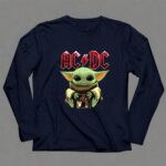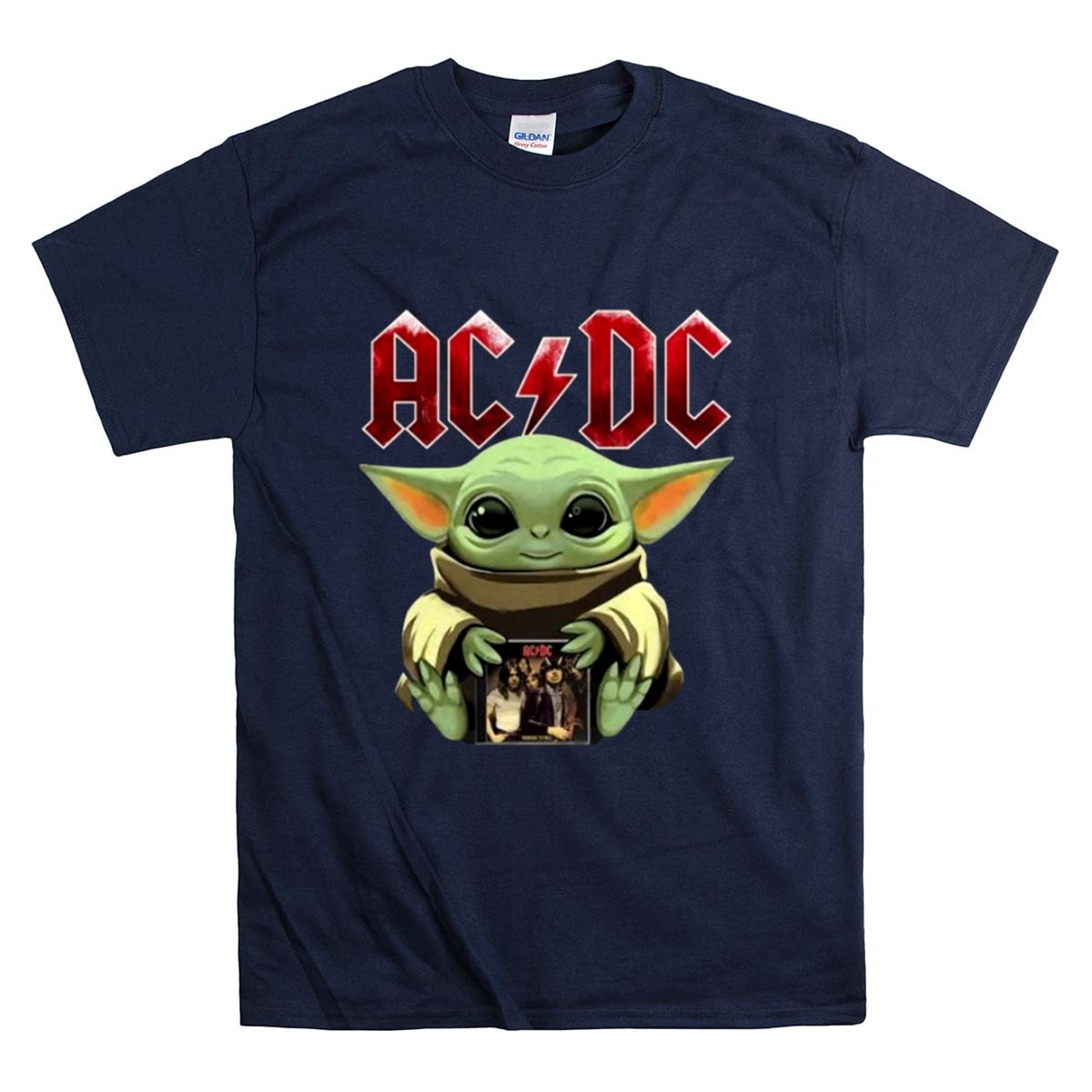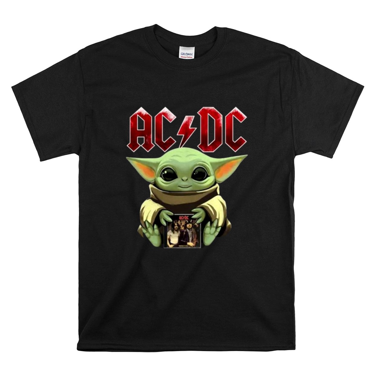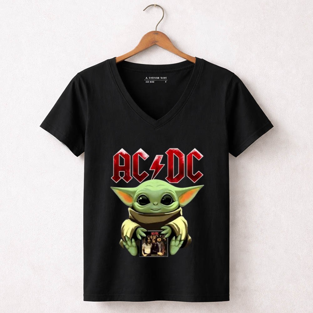 Baby Yoda merchandise, AC/DC fan shirt, Star Wars apparel, pop culture clothing, unique gift for music lovers, rock legend tribute, playful fandom, graphic tee for all ages
