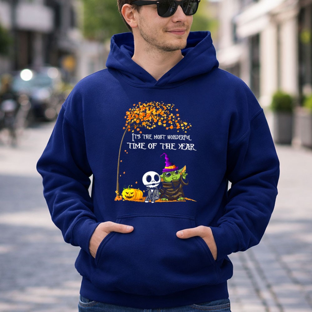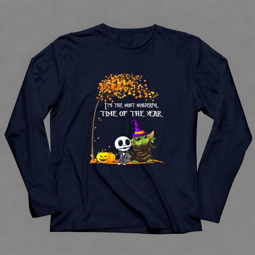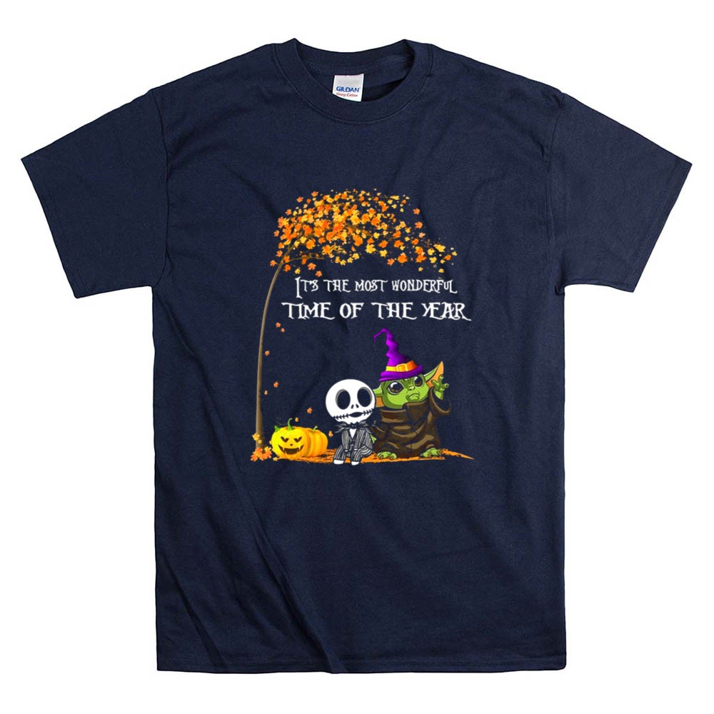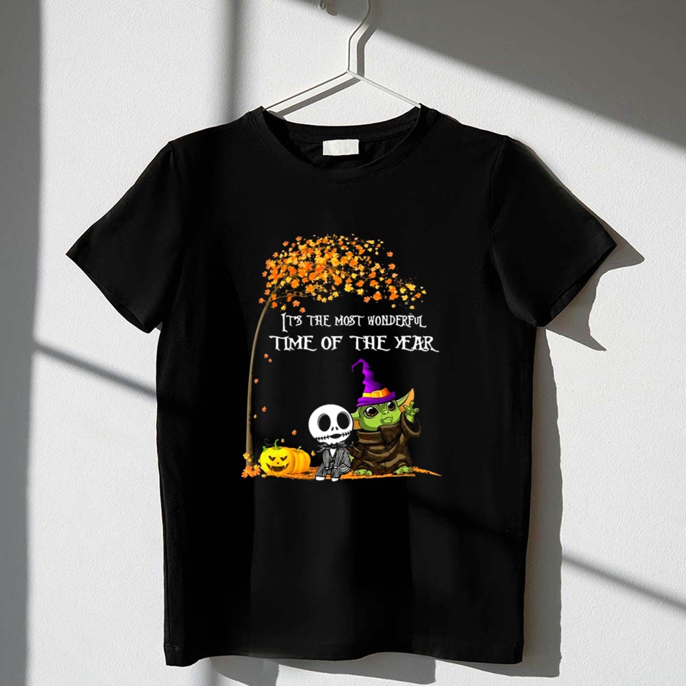 This enchanting design combines the charm of Baby Yoda with the spooky allure of Jack Skellington, creating a whimsical tribute to Halloween. It evokes the joy and nostalgia of the season, inviting wearers to celebrate the magic of trick-or-treating and fall festivals. The playful colors and cartoon style bring a festive spirit that resonates with fans of both Star Wars and Tim Burton’s timeless creations.
