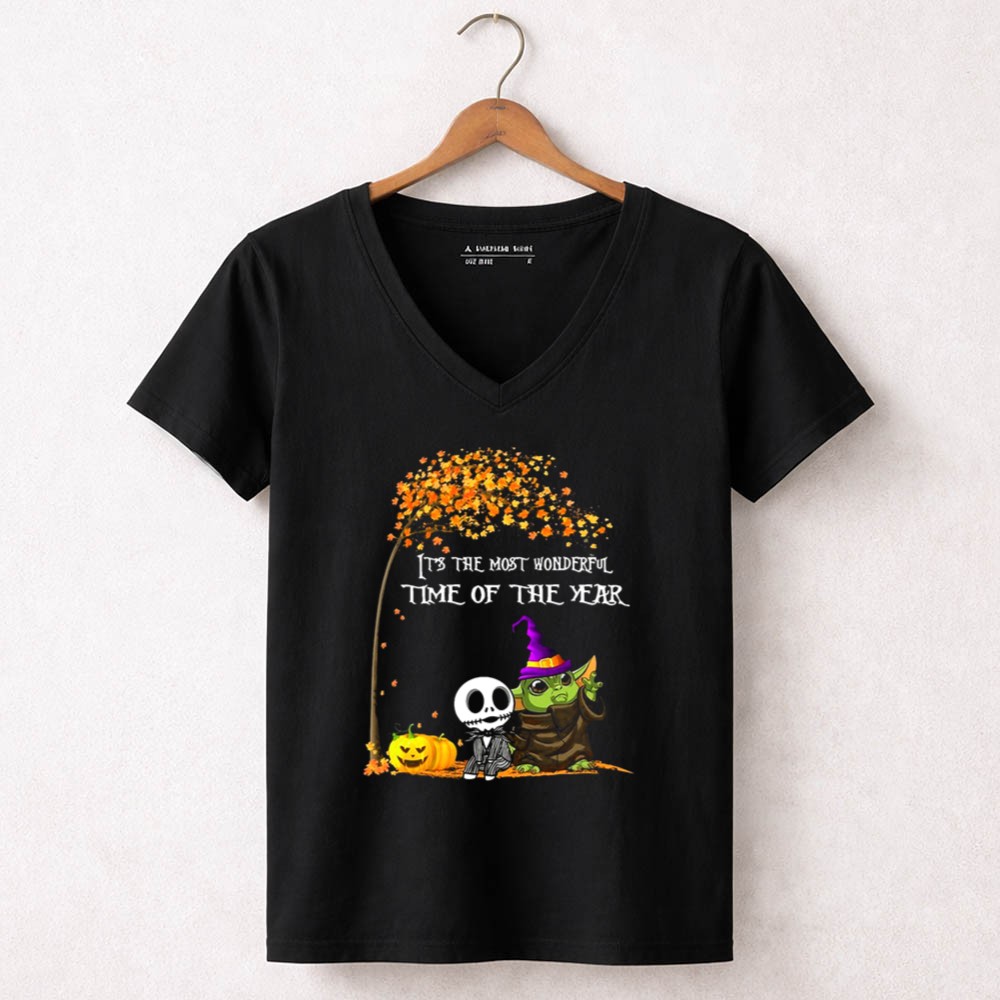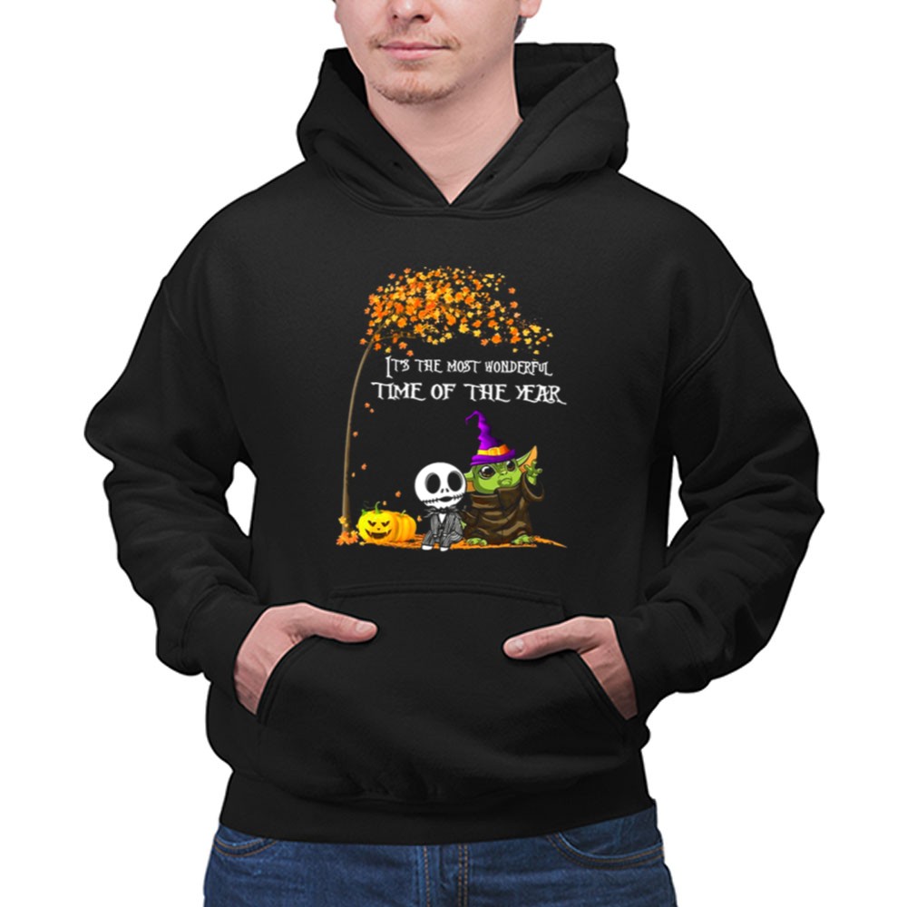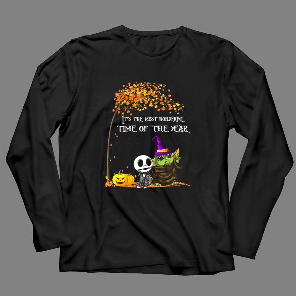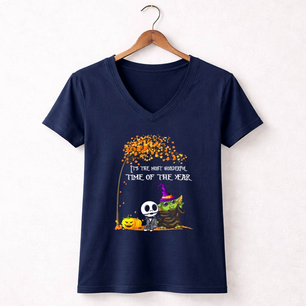 This enchanting design combines the charm of Baby Yoda with the spooky allure of Jack Skellington, creating a whimsical tribute to Halloween. It evokes the joy and nostalgia of the season, inviting wearers to celebrate the magic of trick-or-treating and fall festivals. The playful colors and cartoon style bring a festive spirit that resonates with fans of both Star Wars and Tim Burton’s timeless creations.