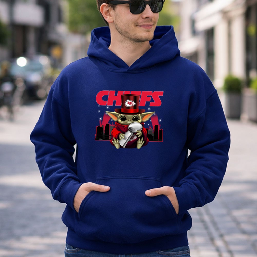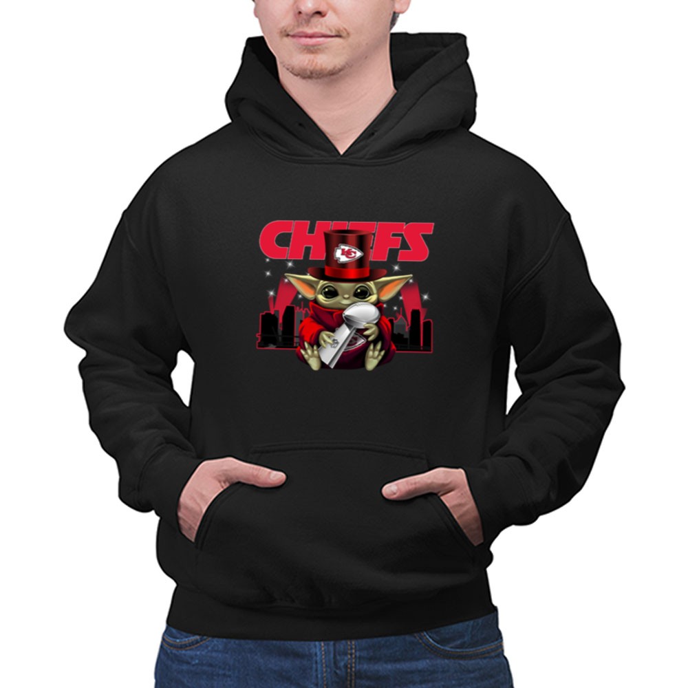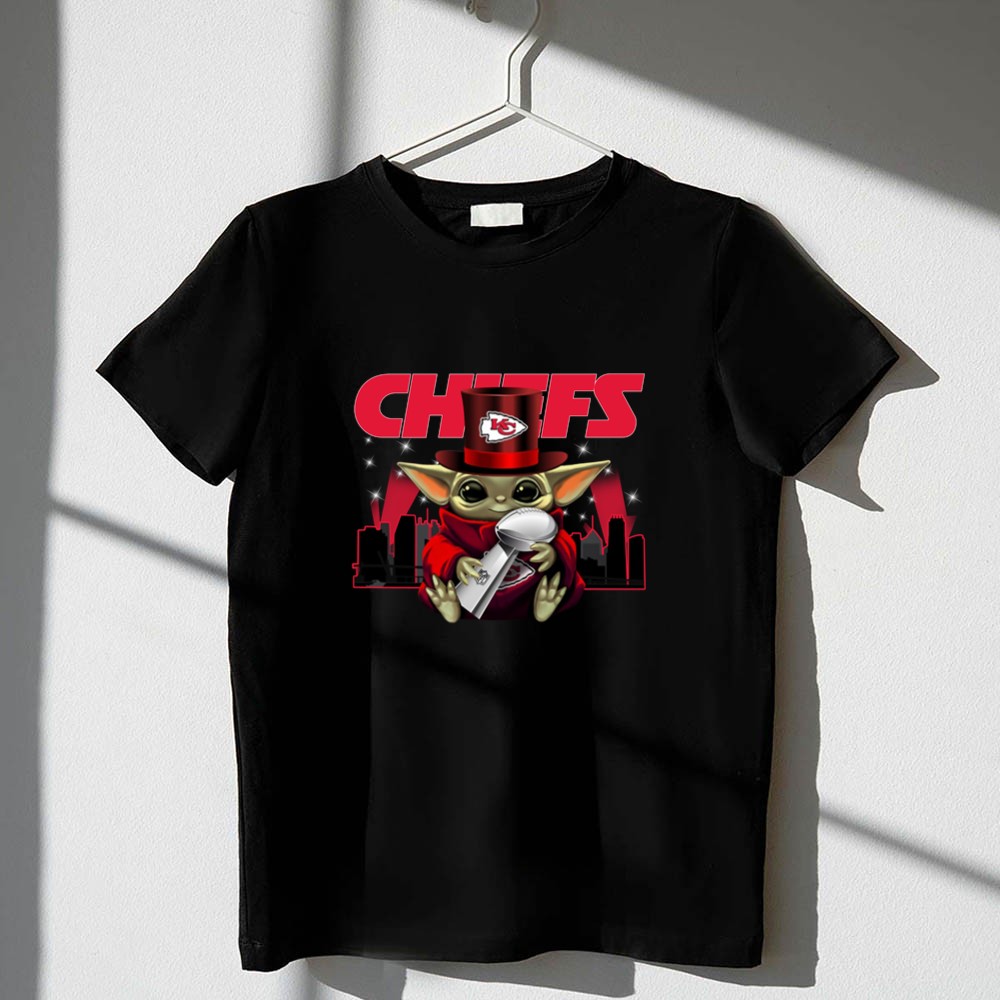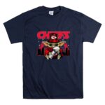 This whimsical design celebrates the Kansas City Chiefs’ Super Bowl triumphs through the endearing figure of Baby Yoda, donning a Chiefs hat and holding the Vince Lombardi Trophy. It embodies the playful spirit of urban streetwear while honoring the electric atmosphere of Arrowhead Stadium, inviting fans to revel in their shared love for the team and its victories.
