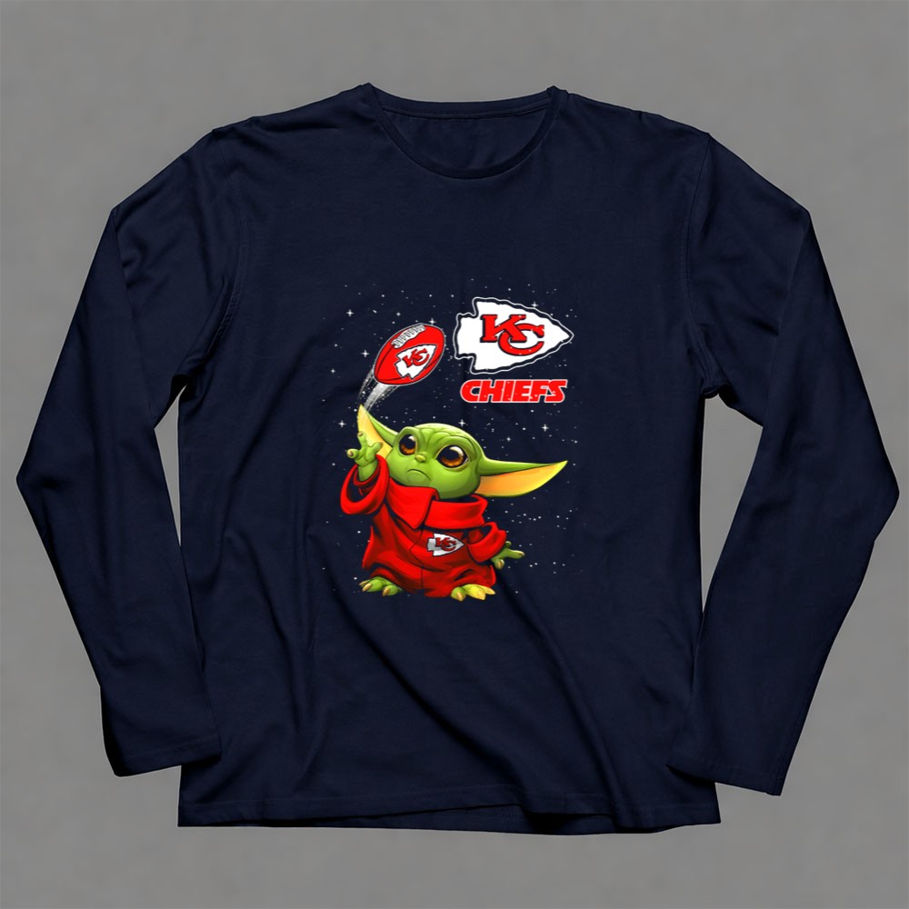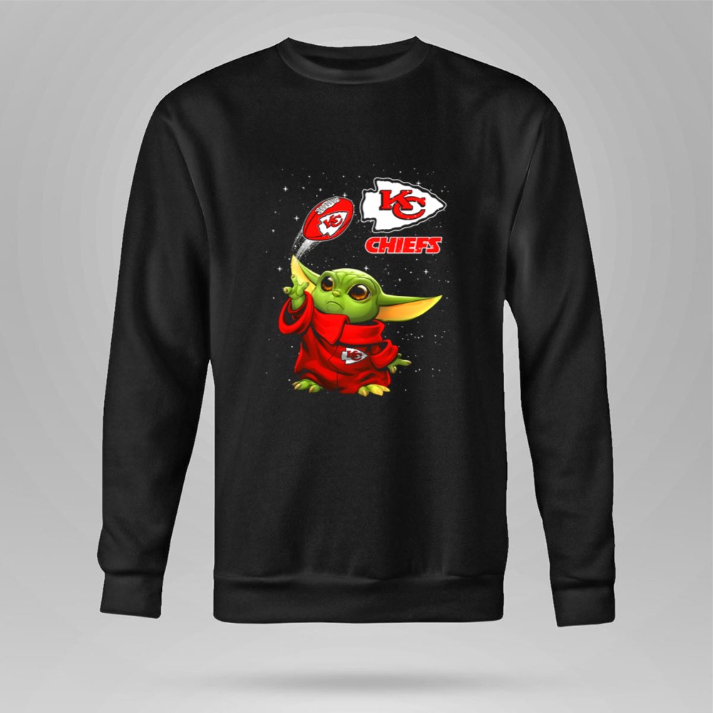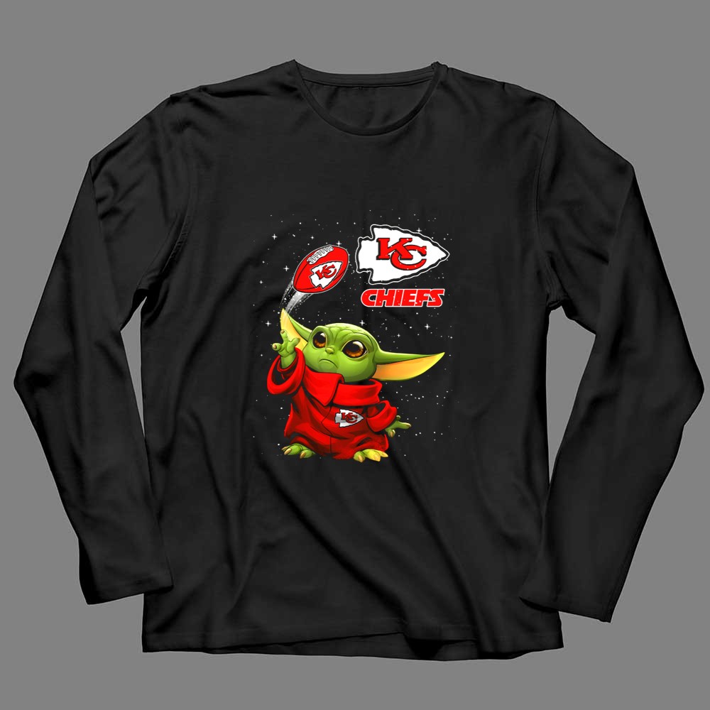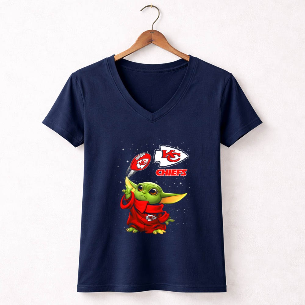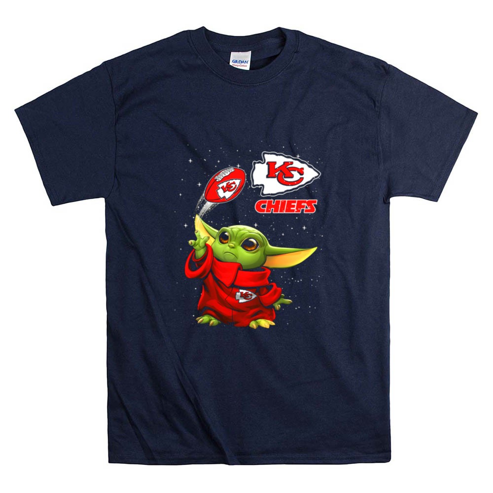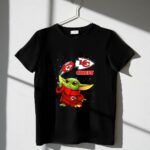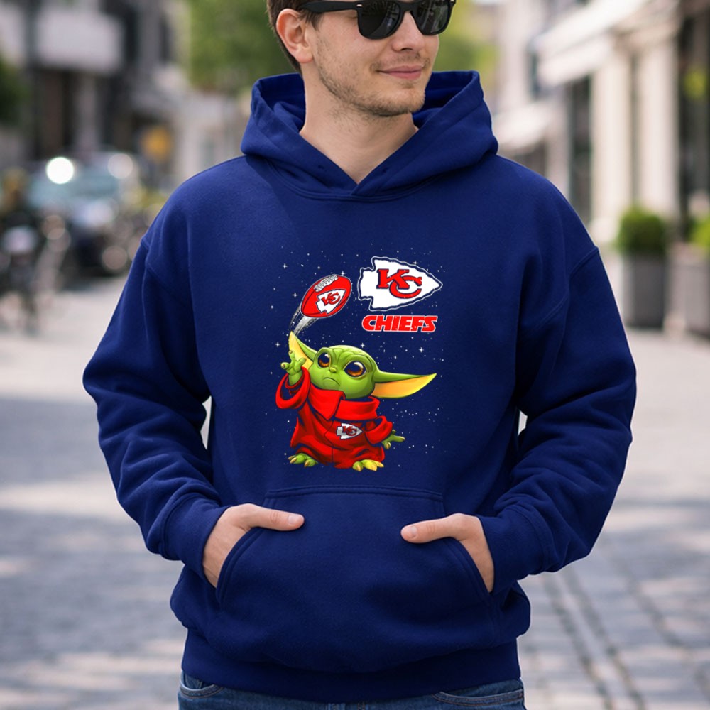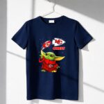 This design whimsically showcases Baby Yoda, donned in a Kansas City Chiefs hoodie, playfully tossing a football adorned with team logos. It captures the joyful spirit of youthful fandom, making a charming connection between the excitement of NFL games and the beloved world of Star Wars. It’s a celebration of team pride, perfect for those who cherish both playful culture and sports.