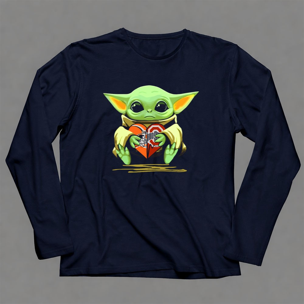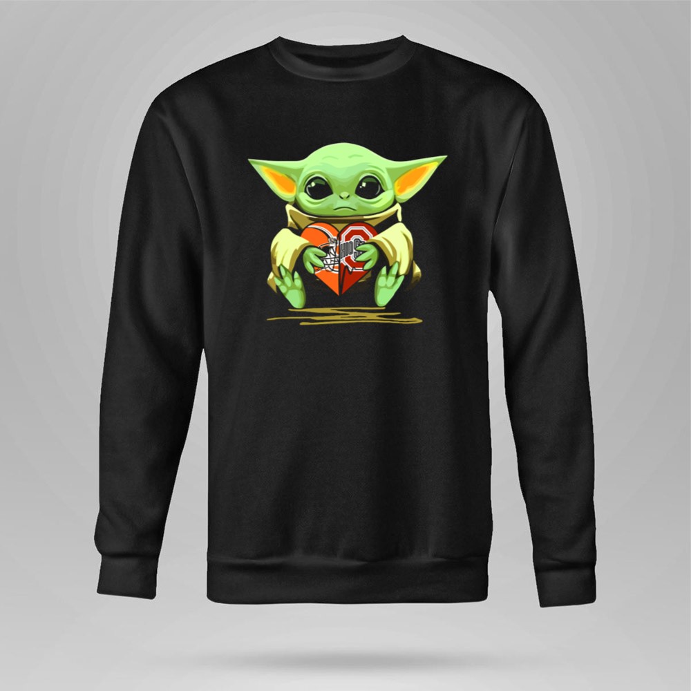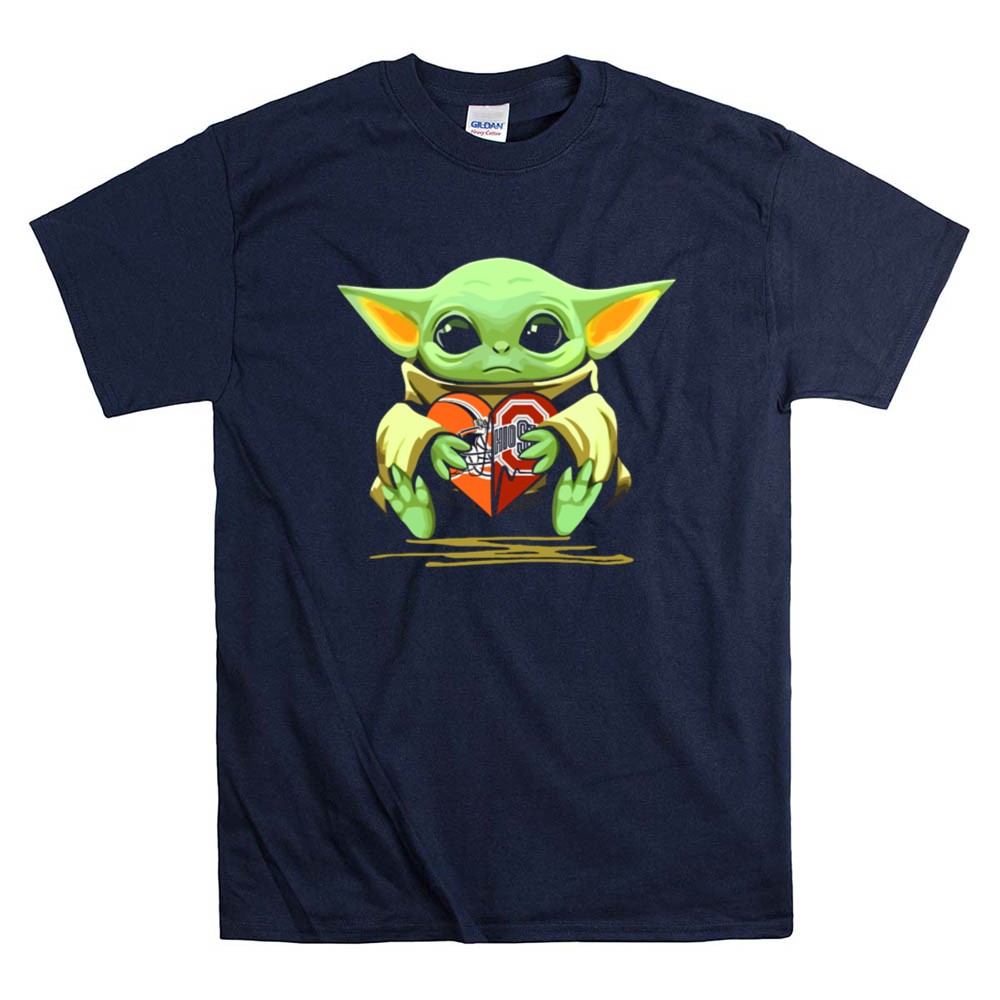 This whimsical illustration combines the endearing Baby Yoda holding a heart adorned with the Ohio State Buckeyes logo, symbolizing the deep affection fans have for their team. It reflects the joyous blend of college sports pride and beloved pop culture, inviting wearers to celebrate their Buckeye spirit with a playful vibe. This design is not just apparel; it’s a heartfelt expression of fandom.