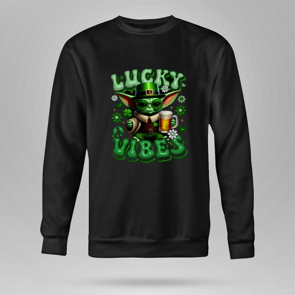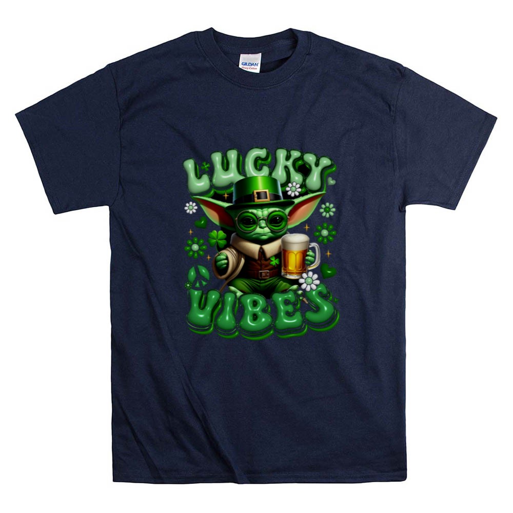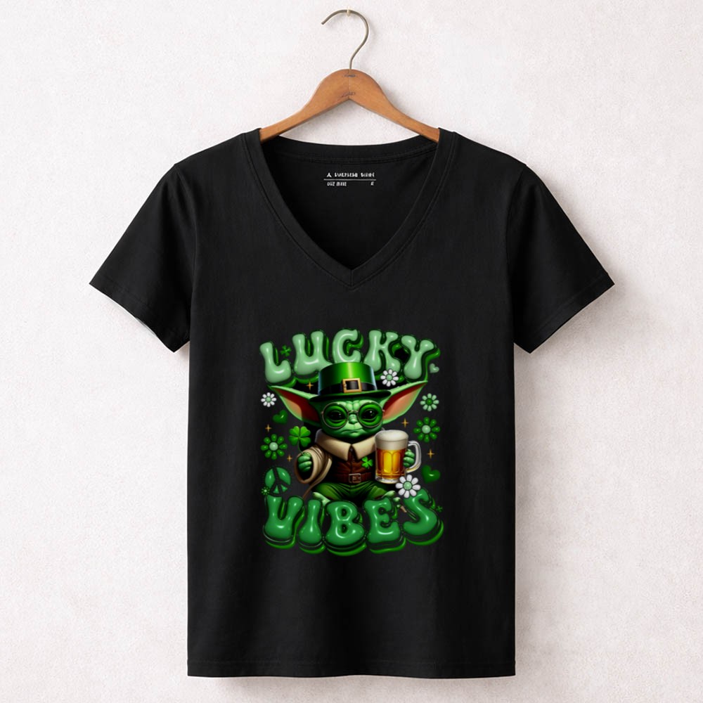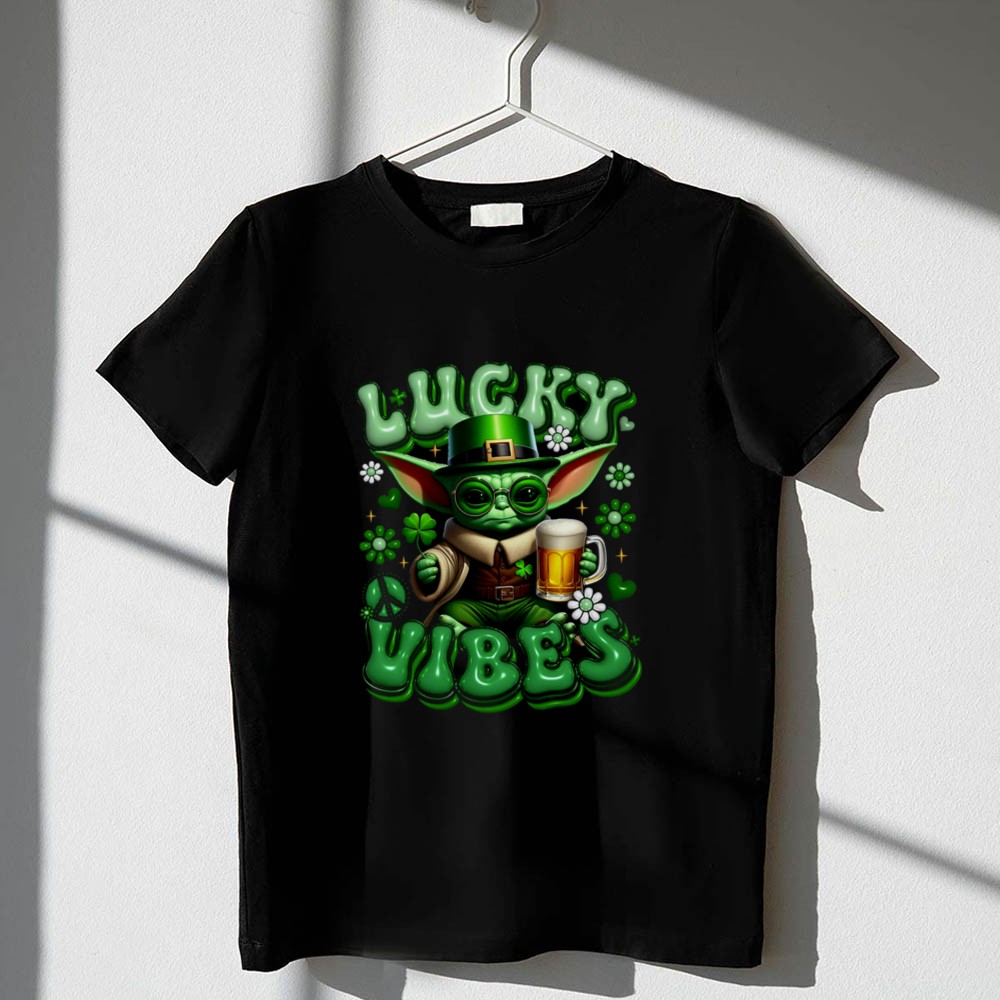 St. Patrick's Day shirt, Baby Yoda merchandise, Star Wars fan apparel, lucky vibes theme, festive green shirt, pop culture celebration, beer lover gift, fun holiday tee