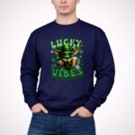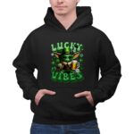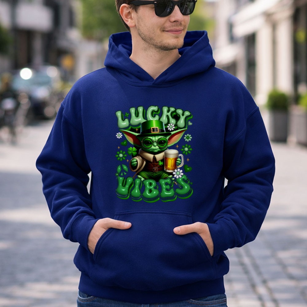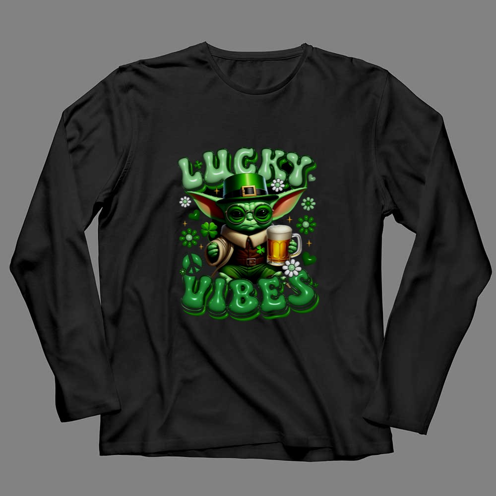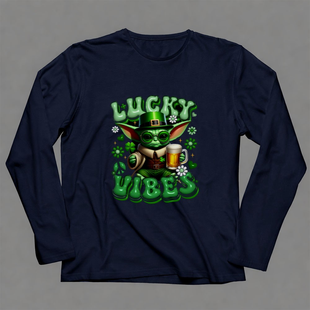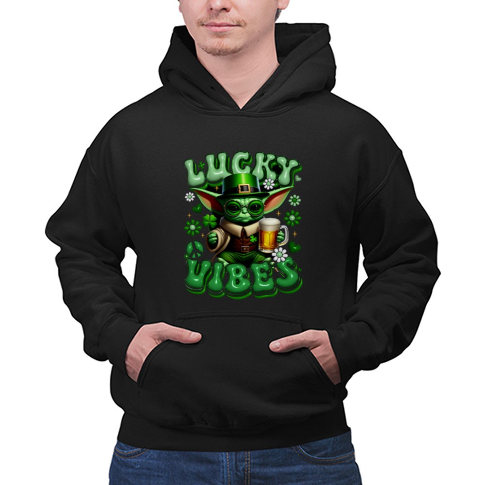 St. Patrick's Day shirt, Baby Yoda merchandise, Star Wars fan apparel, lucky vibes theme, festive green shirt, pop culture celebration, beer lover gift, fun holiday tee
