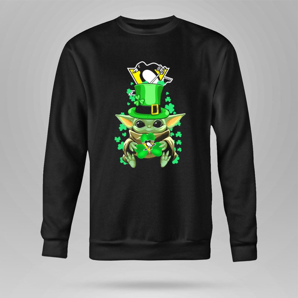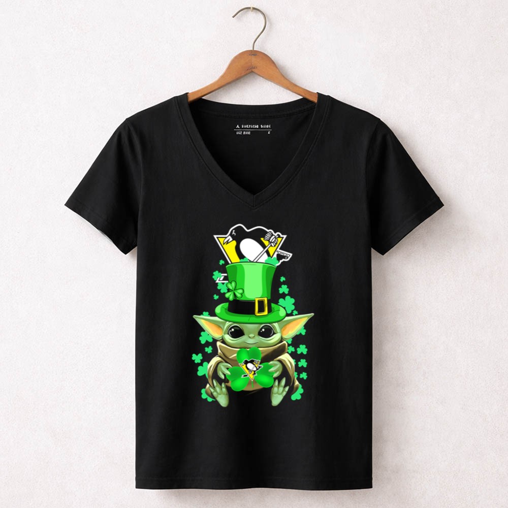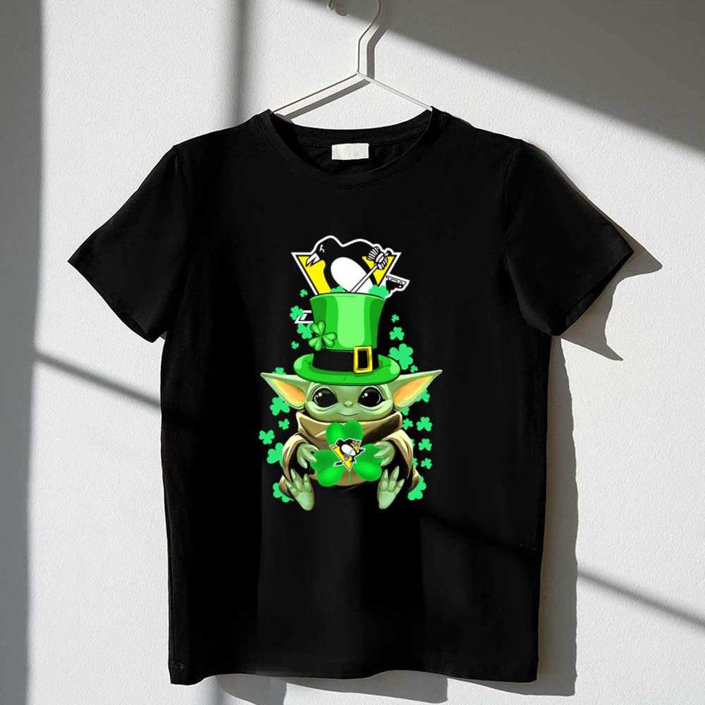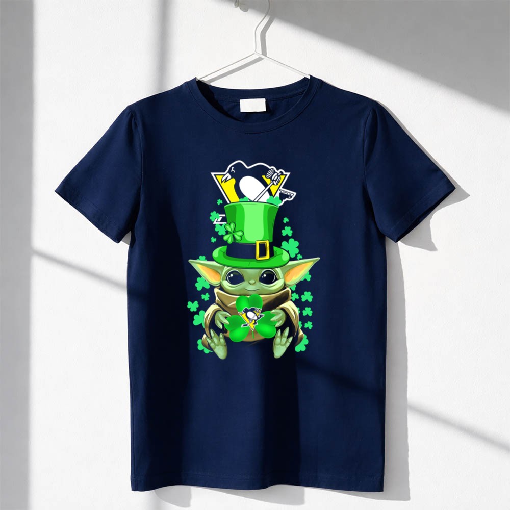 Pittsburgh Penguins apparel, Baby Yoda merchandise, St. Patrick's Day t-shirt, hockey fan gear, shamrock designs, cute sports clothing, game day outfit, family-friendly gifts