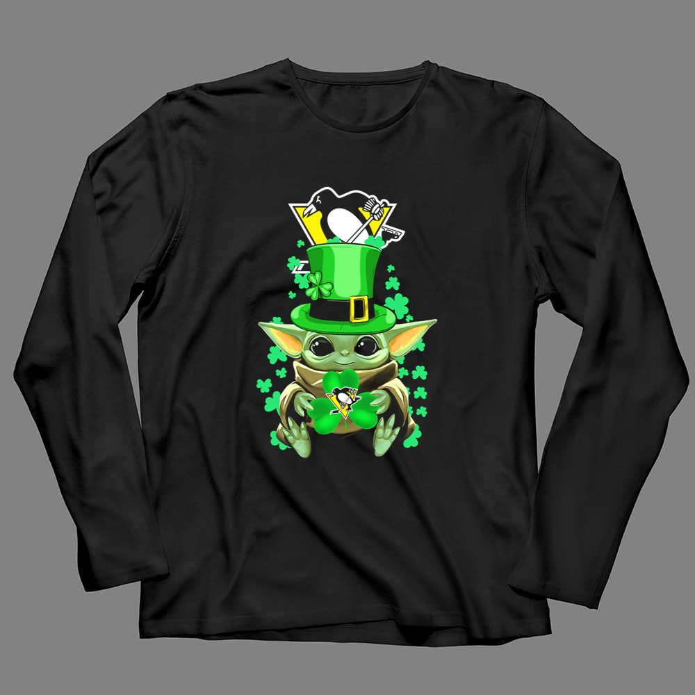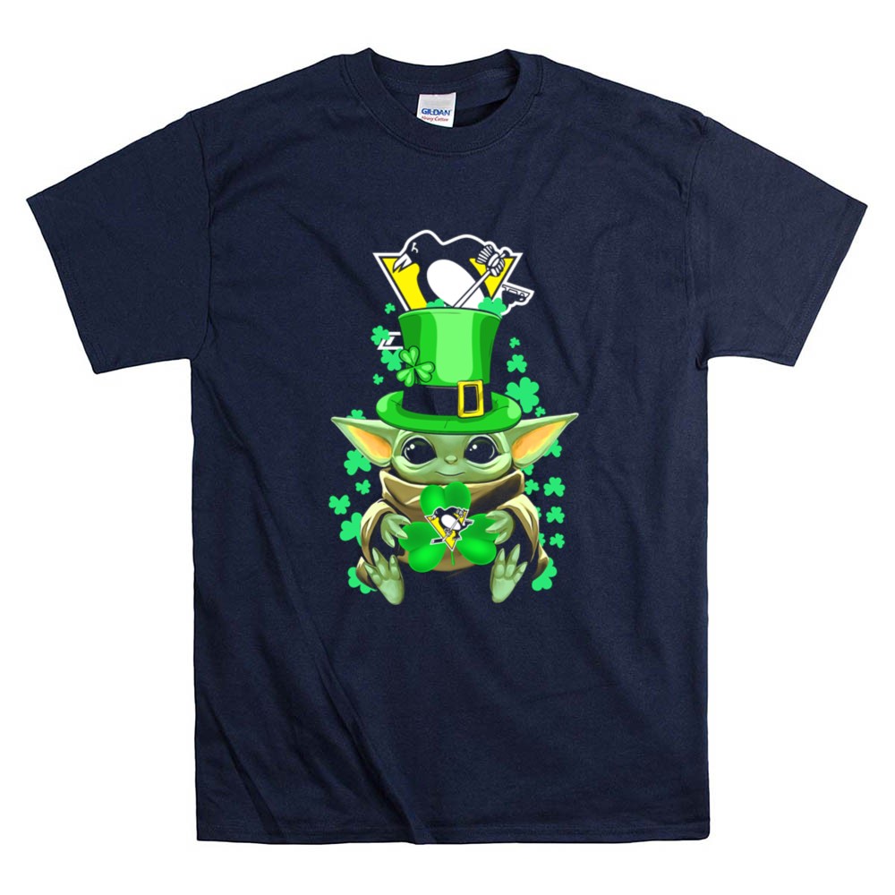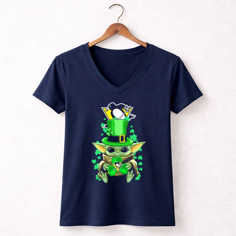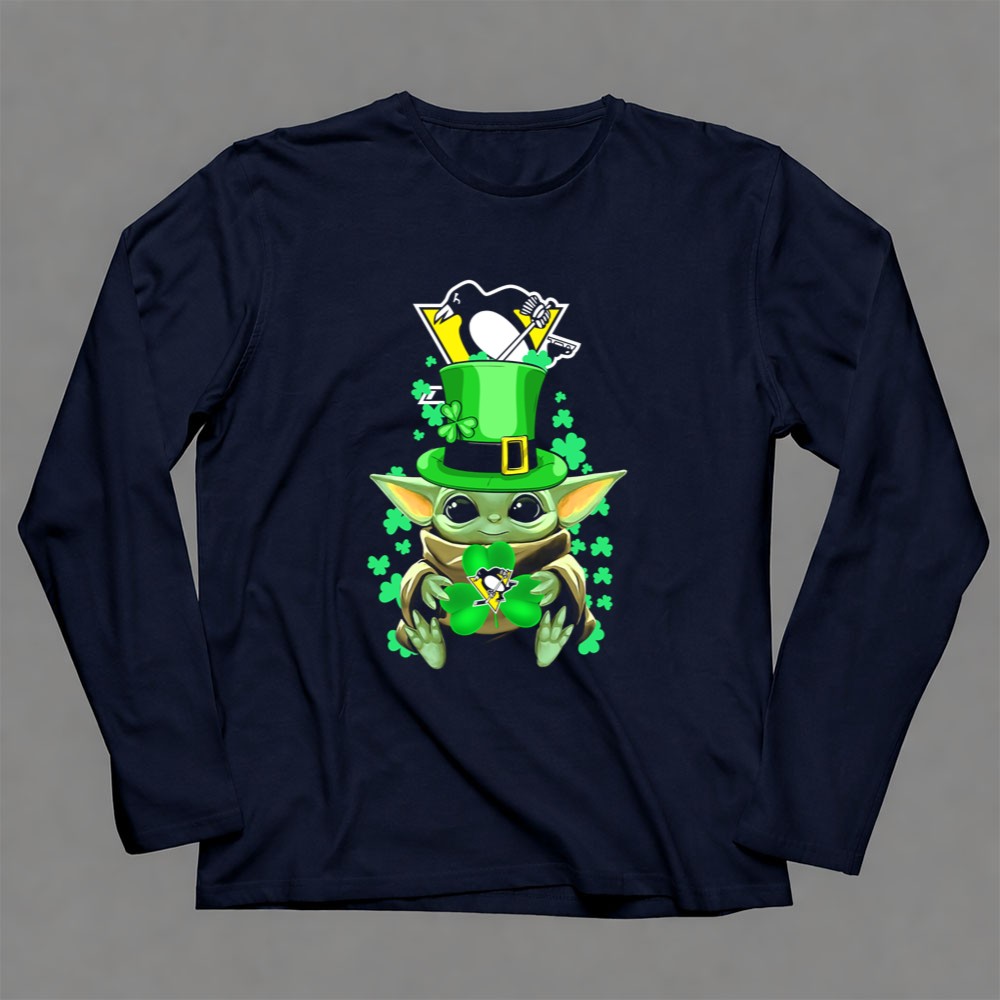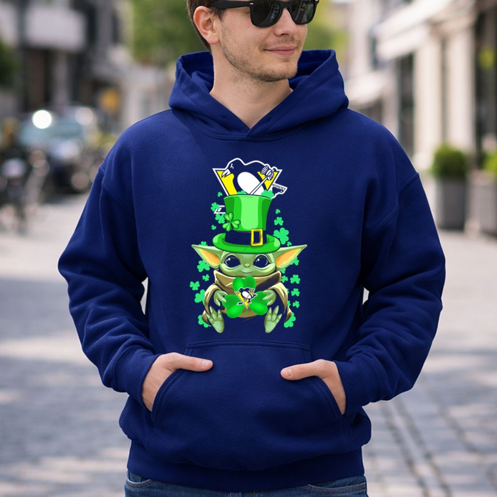 Pittsburgh Penguins apparel, Baby Yoda merchandise, St. Patrick's Day t-shirt, hockey fan gear, shamrock designs, cute sports clothing, game day outfit, family-friendly gifts