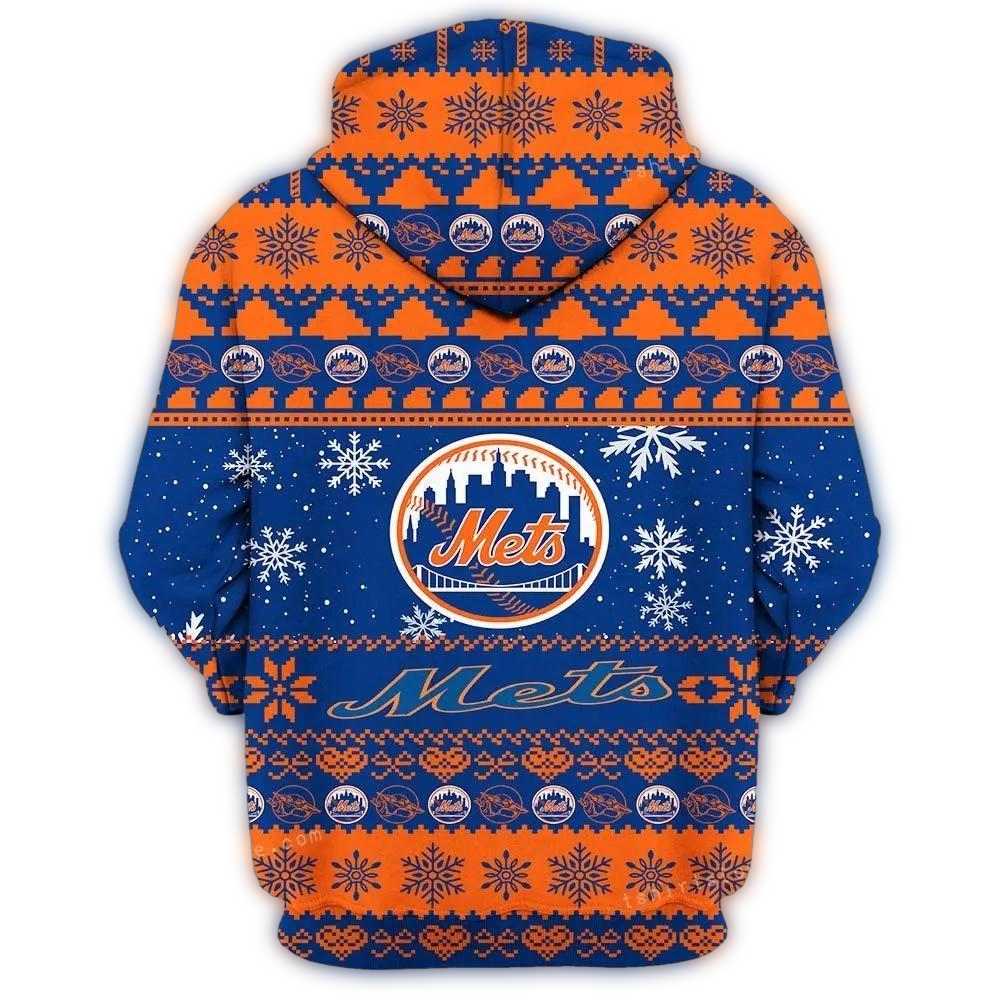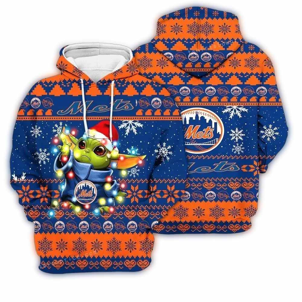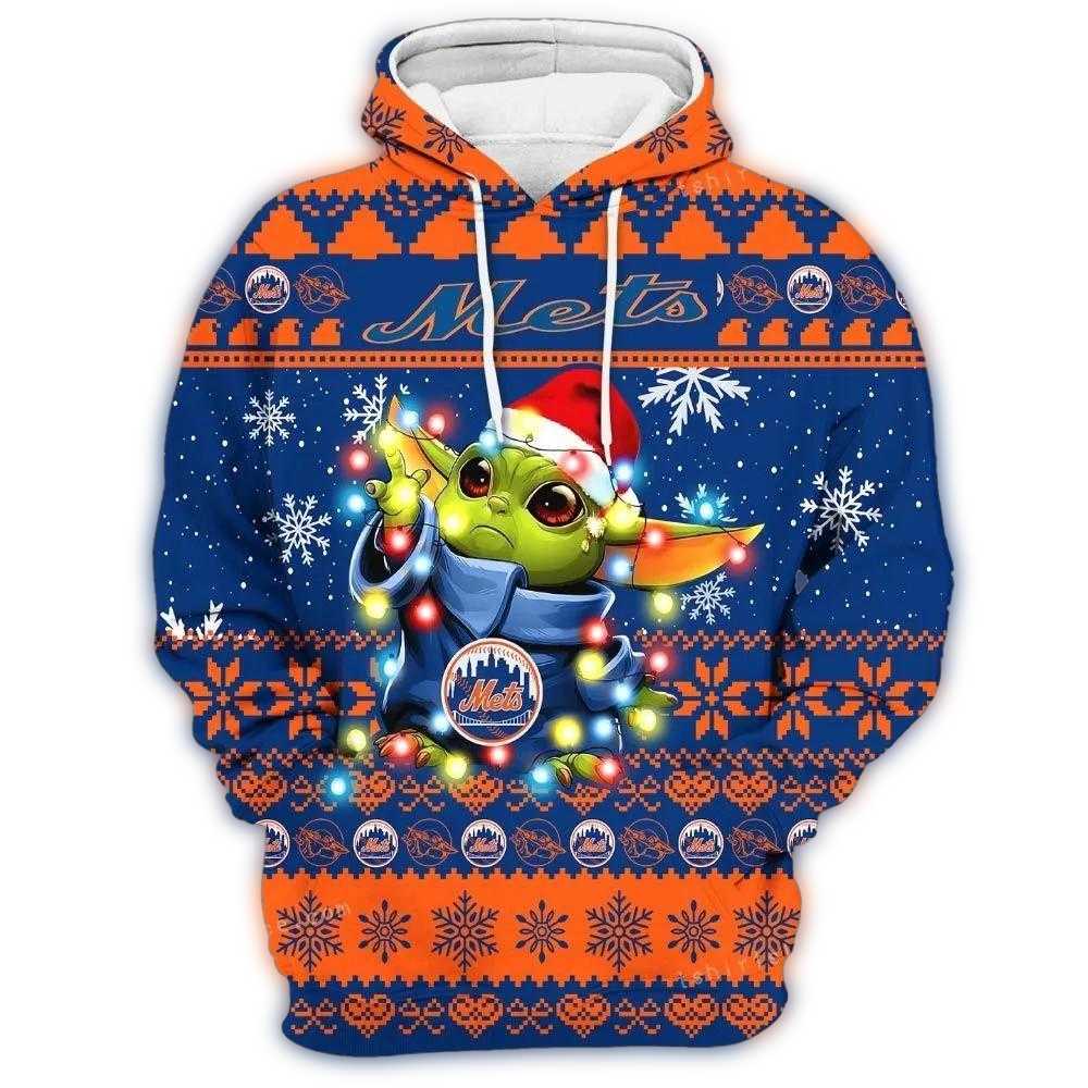 A festive blend of Baby Yoda charm and New York Mets spirit for the ultimate holiday hoodie.