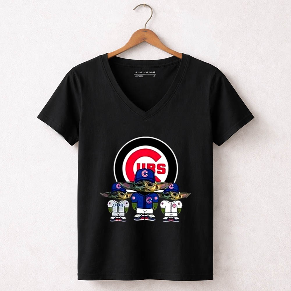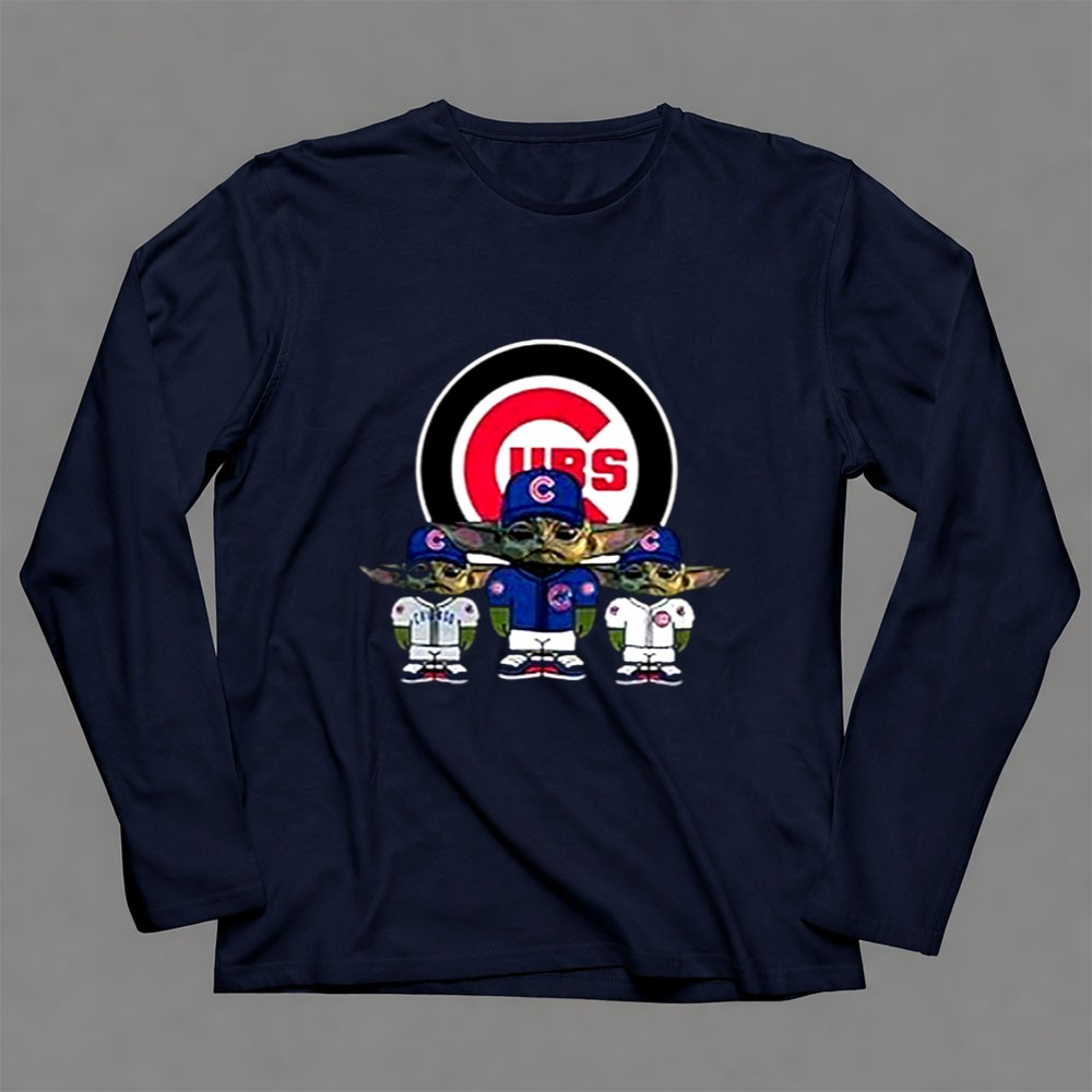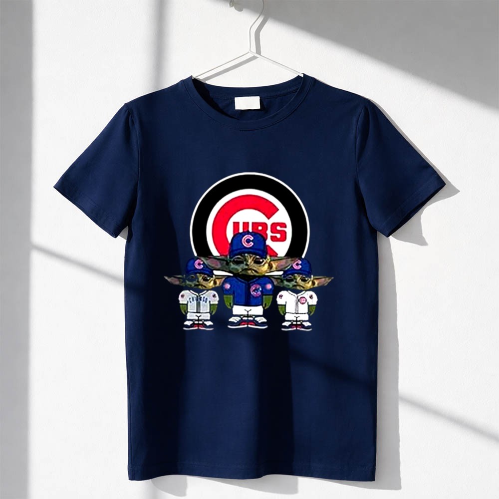 This playful design brings together the beloved Baby Yoda and the vibrant spirit of Chicago Cubs fandom. Set against a backdrop featuring the iconic Cubs logo, it reflects a delightful mashup of pop culture, inviting fans to celebrate their passions in a colorful, cartoon style that resonates with both young and old alike.