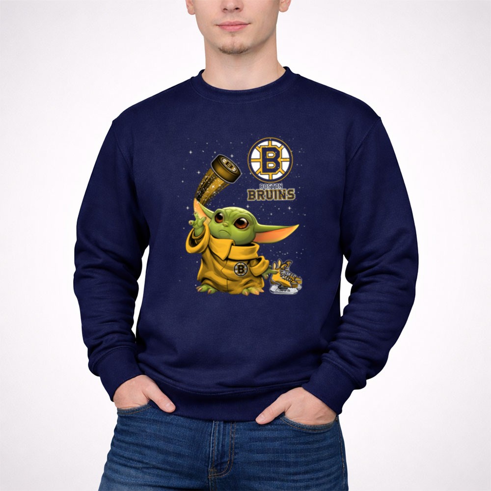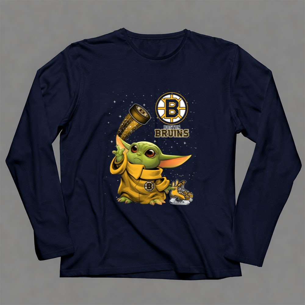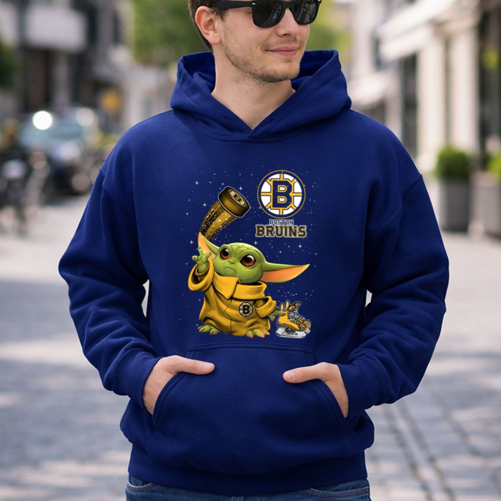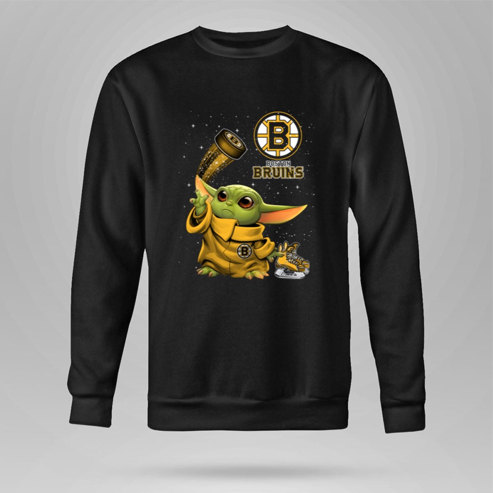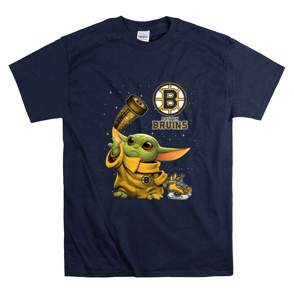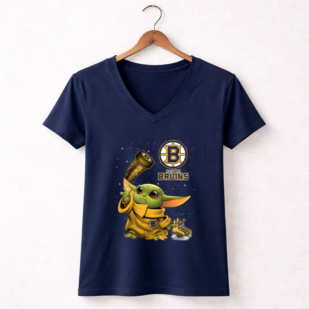 This design captures the heartwarming spirit of fandom by featuring Baby Yoda dressed in Bruins gear, holding a hockey puck adorned with sparkles. It’s a playful tribute to two iconic worlds, celebrating the joy of Boston sports pride and the magic of the Star Wars universe, making it a delightful addition to any young fan’s wardrobe.