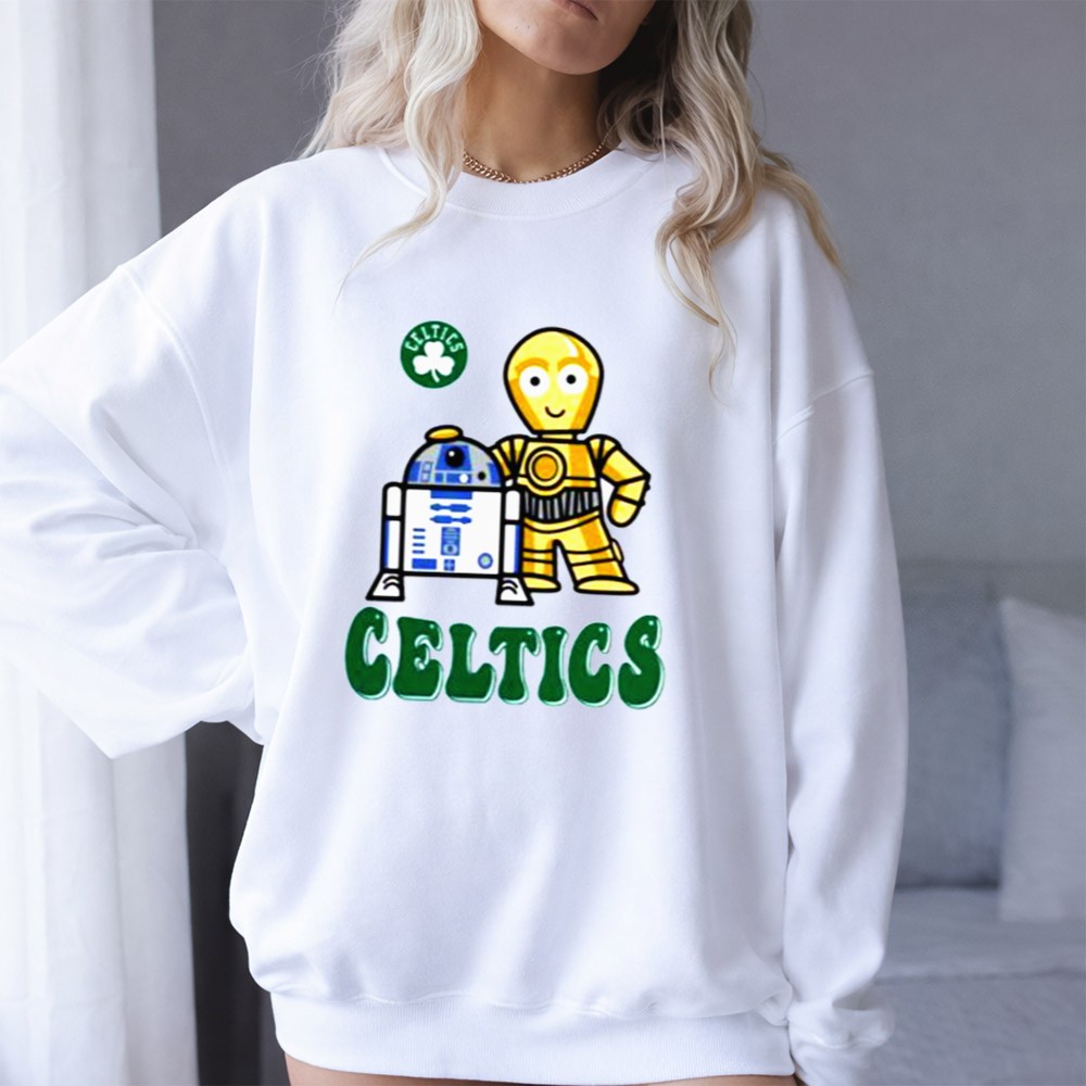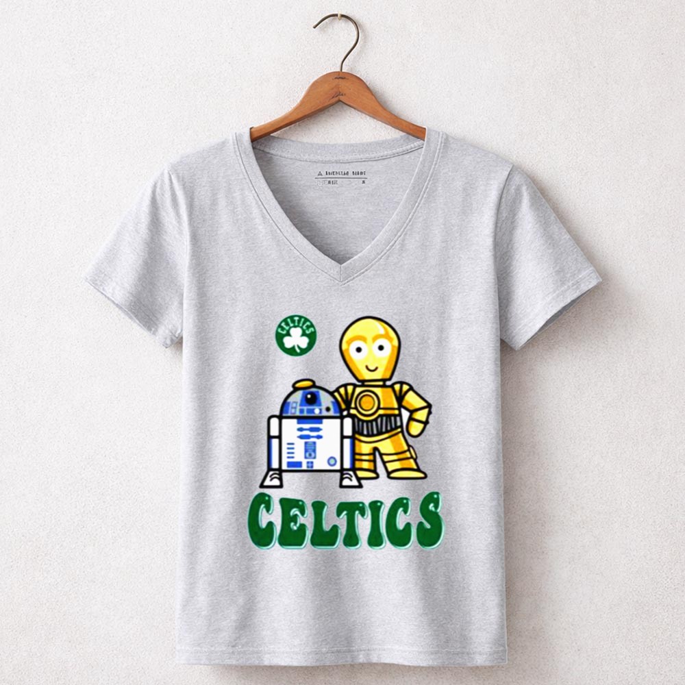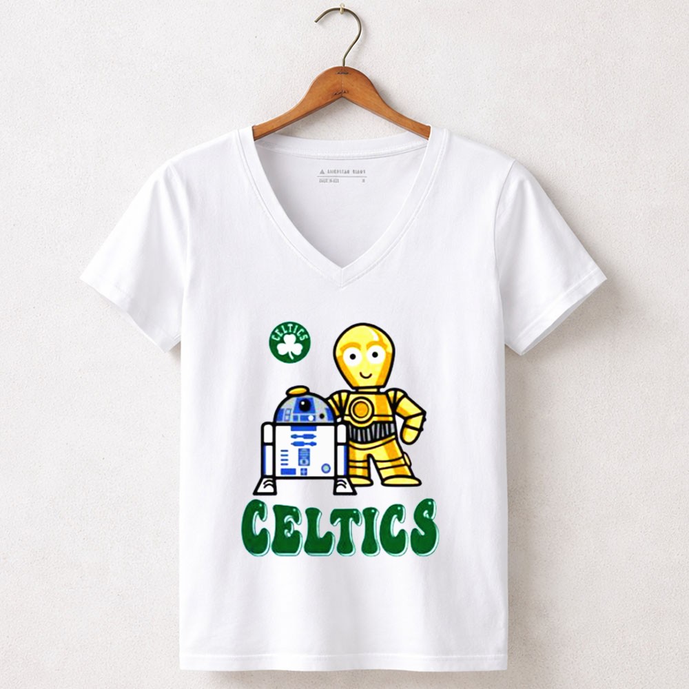 This design captures a joyful fusion of sports and cinema, intertwining the Boston Celtics emblem with the beloved Star Wars duo, R2-D2 and C-3PO. It’s a playful tribute that not only showcases Boston pride but also resonates with the shared nostalgia of fans, celebrating their passions in a unique way.