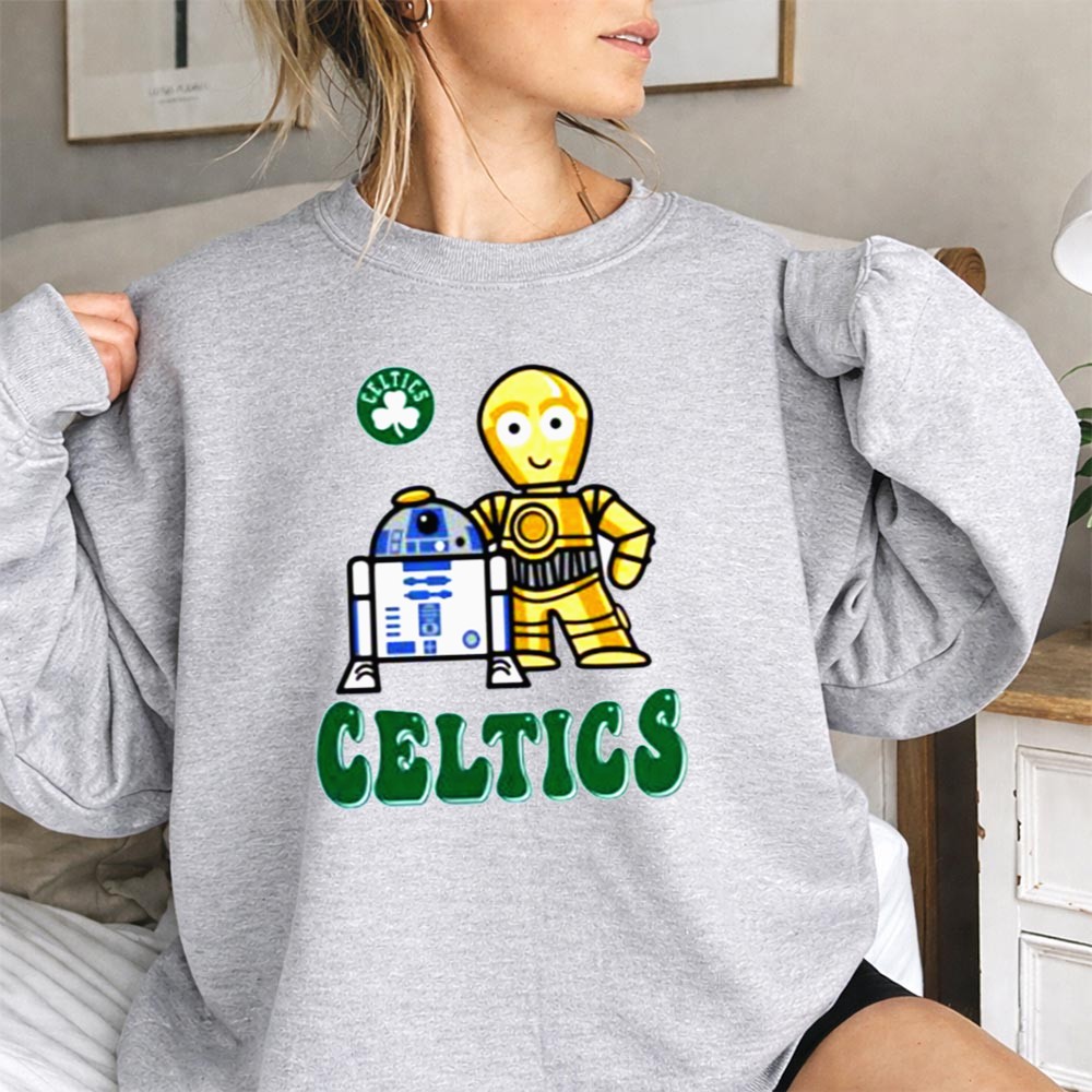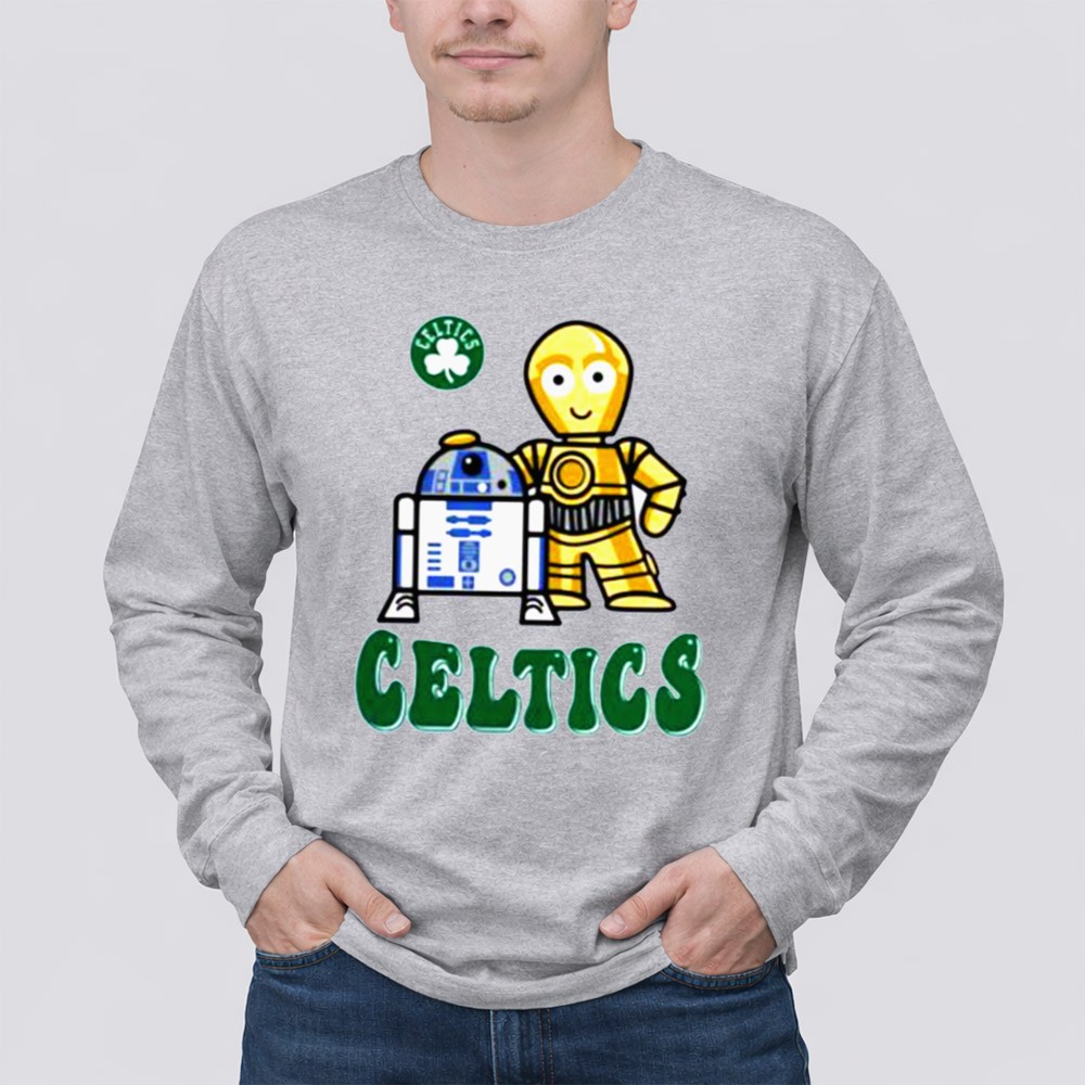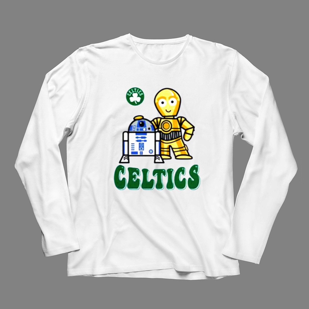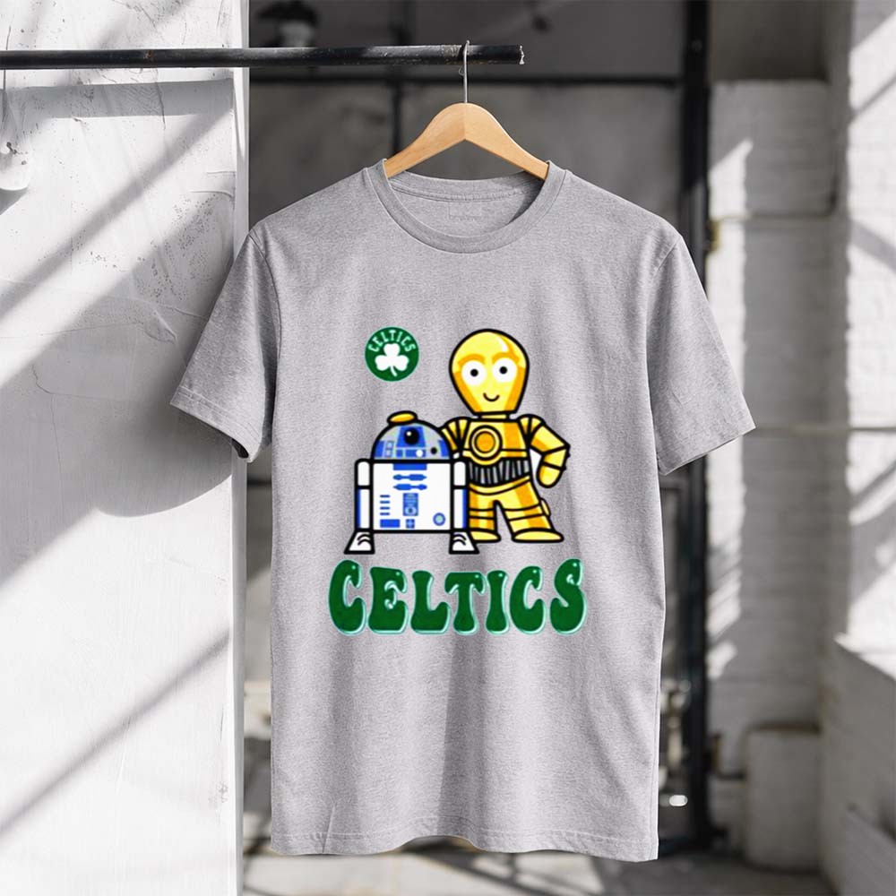 This design captures a joyful fusion of sports and cinema, intertwining the Boston Celtics emblem with the beloved Star Wars duo, R2-D2 and C-3PO. It’s a playful tribute that not only showcases Boston pride but also resonates with the shared nostalgia of fans, celebrating their passions in a unique way.