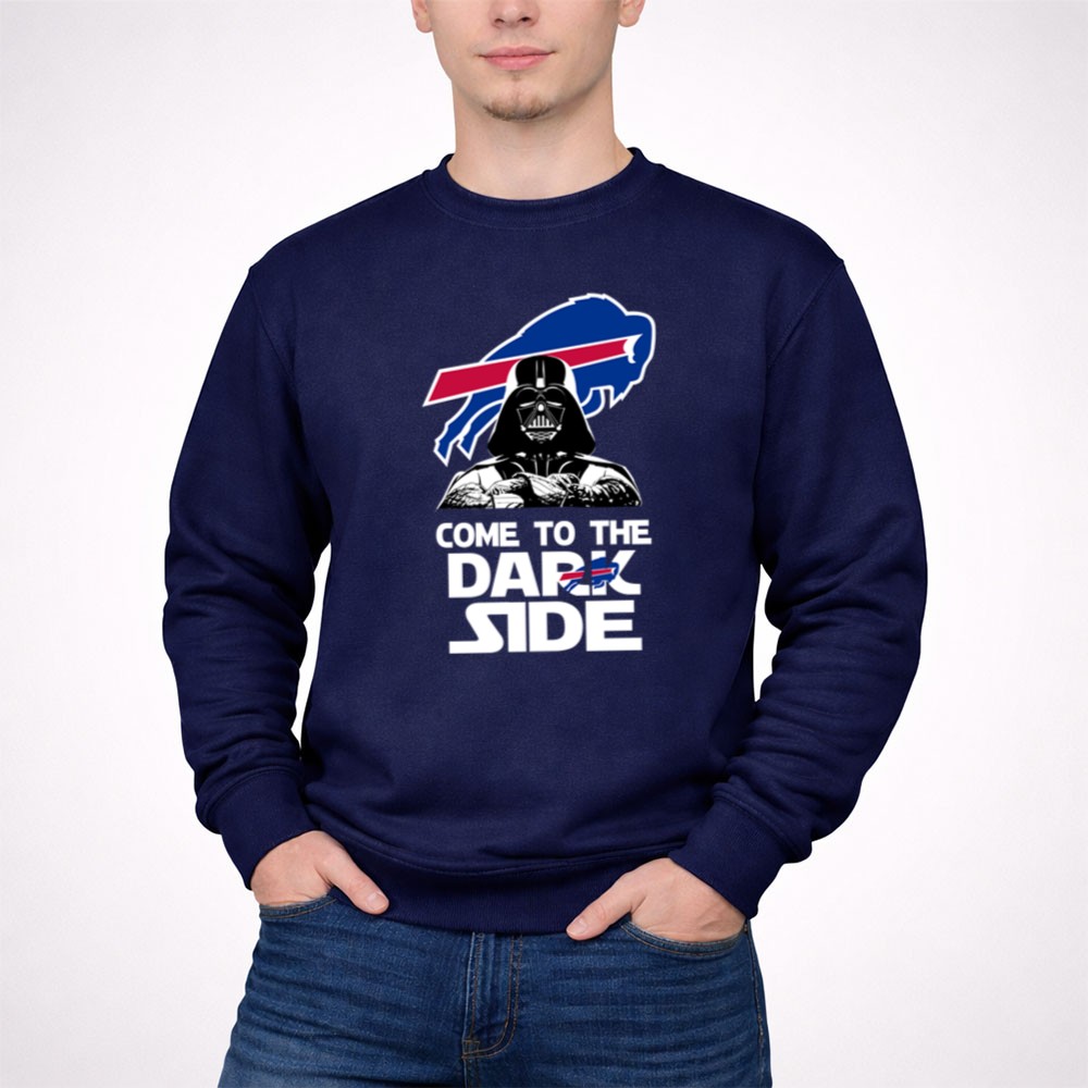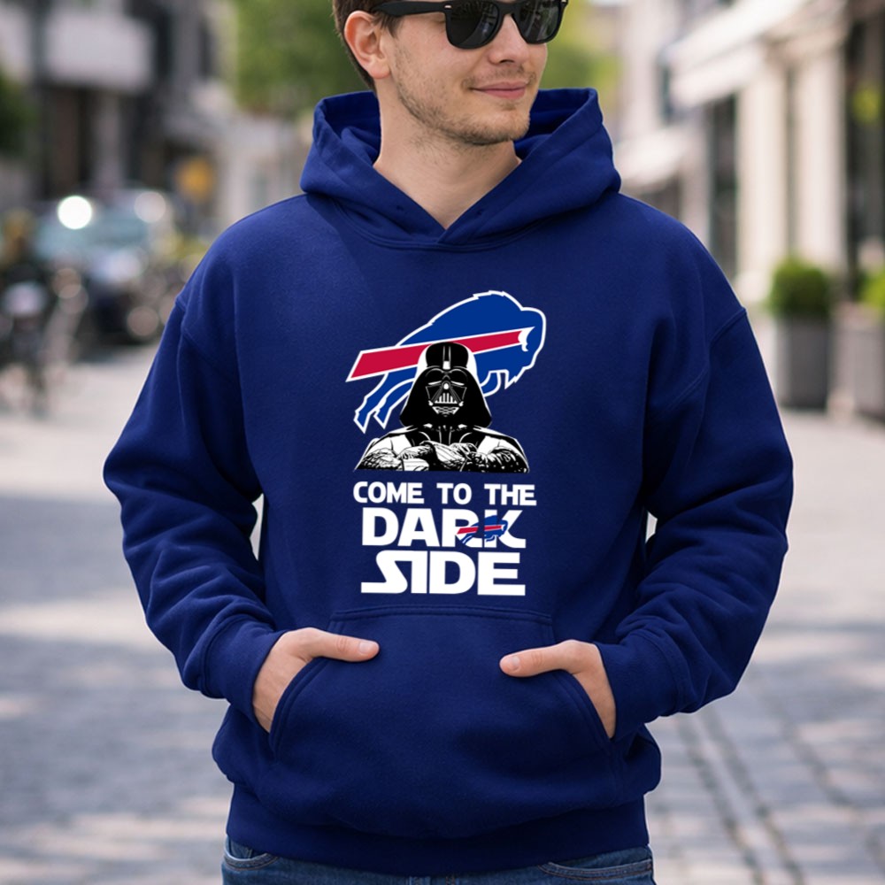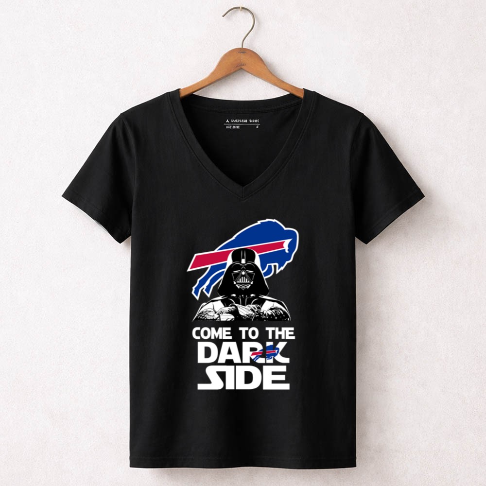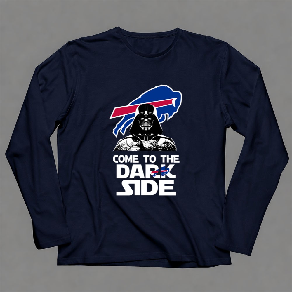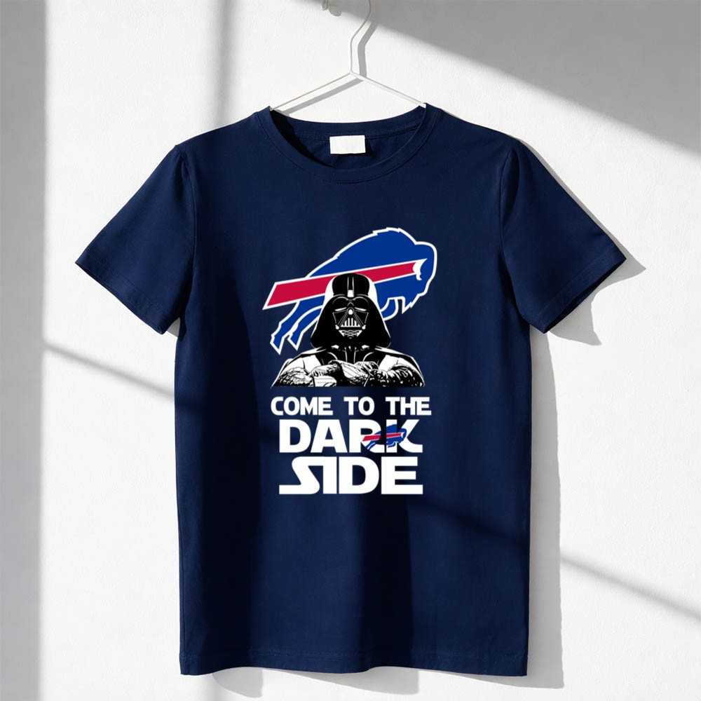 This design captures the essence of fandom by merging the iconic Buffalo Bills logo with Darth Vader’s memorable quote, ‘Come to the Dark Side.’ It reflects the playful spirit of Buffalo’s sports culture, allowing fans to embrace their love for both football and a classic film. With its urban streetwear vibe, this shirt is a tribute to those who wear their fandom with pride.