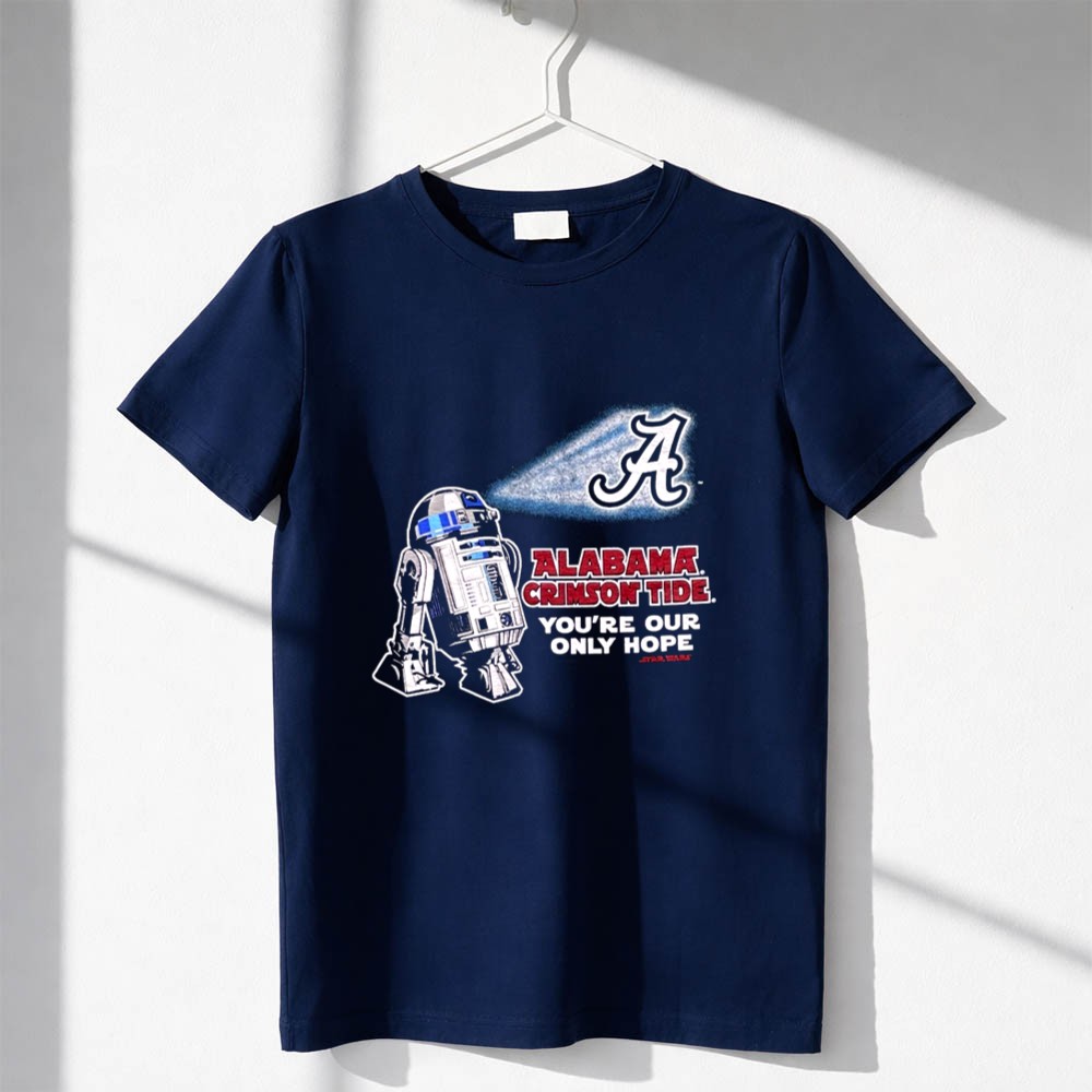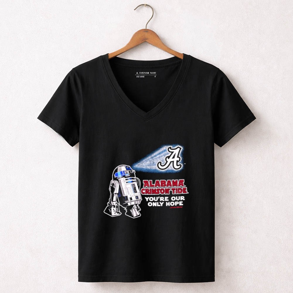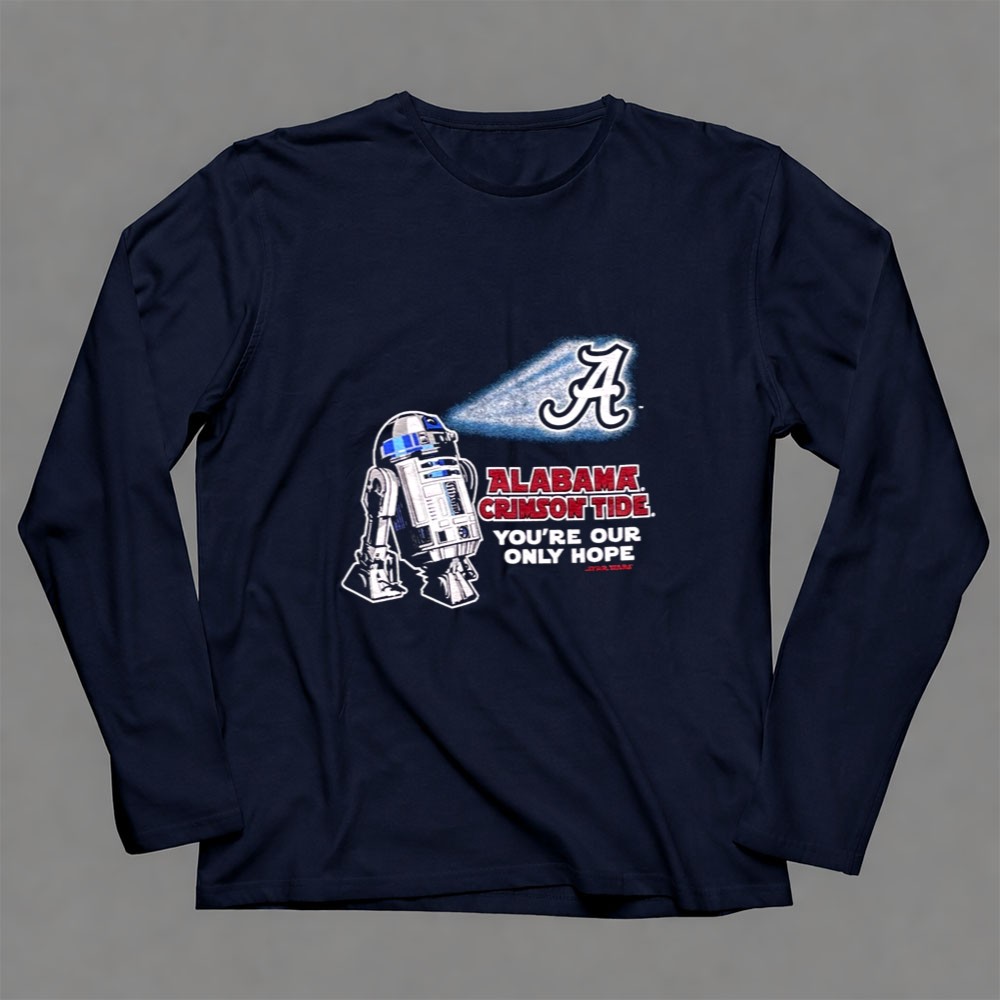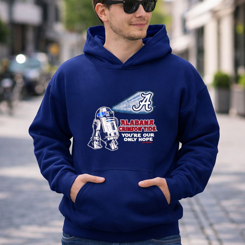 This design captures the essence of Alabama football pride while playfully nodding to the iconic R2D2. The phrase ‘YOU’RE OUR ONLY HOPE’ reflects the hope and passion fans carry into every game, merging the excitement of college football with the whimsy of sci-fi culture in a vibrant graphic.