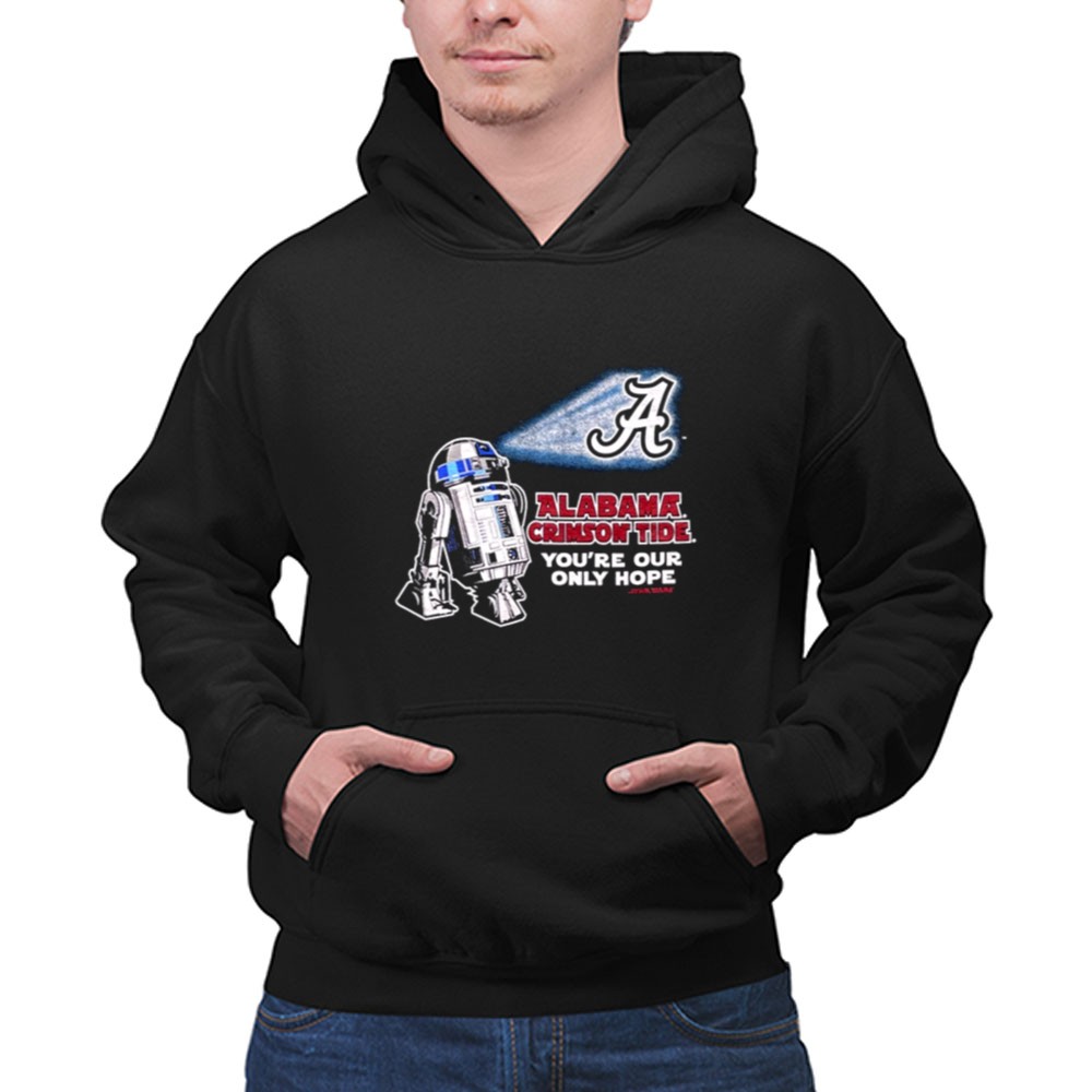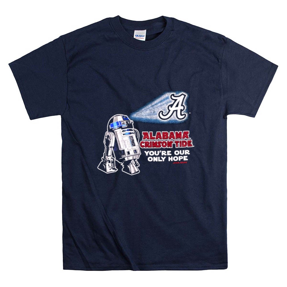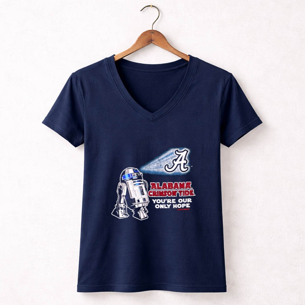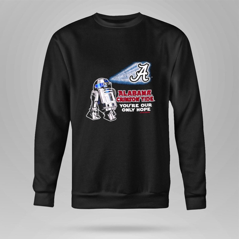 This design captures the essence of Alabama football pride while playfully nodding to the iconic R2D2. The phrase ‘YOU’RE OUR ONLY HOPE’ reflects the hope and passion fans carry into every game, merging the excitement of college football with the whimsy of sci-fi culture in a vibrant graphic.