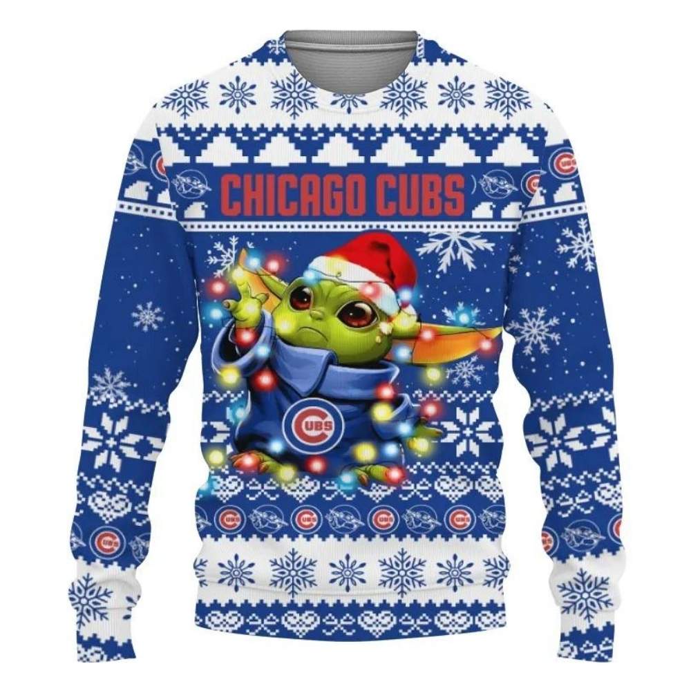 This charming design encapsulates the festive spirit of the holidays, bringing together the iconic Chicago Cubs and the endearing Baby Yoda. Decked out in a Santa hat and surrounded by vibrant lights, it evokes warmth and nostalgia, making it a joyful addition to any winter gathering. It’s more than just apparel; it’s a celebration of fandom and family during the most wonderful time of the year.