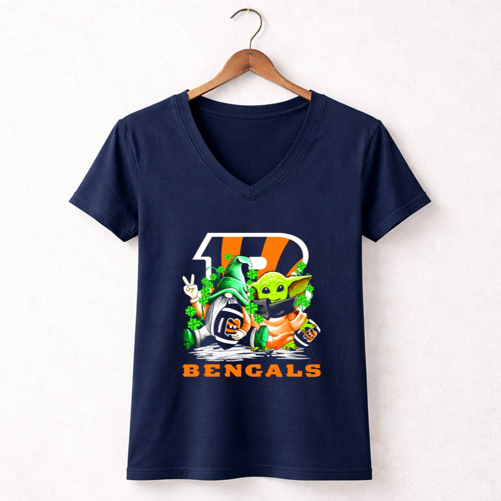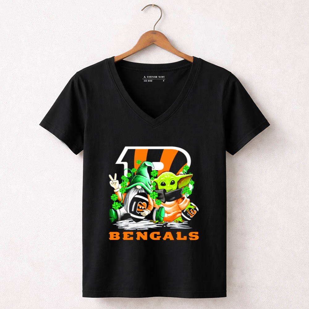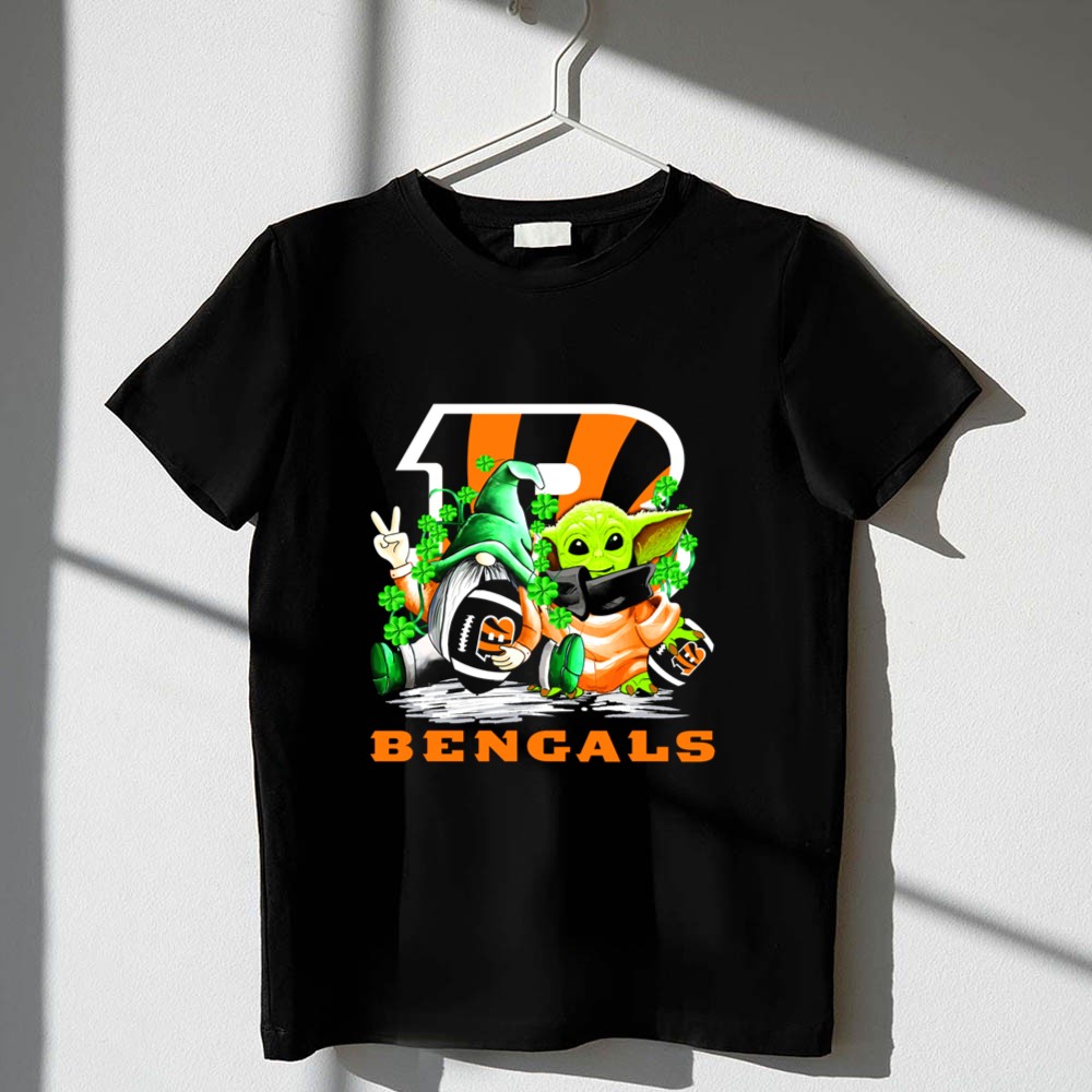 Cincinnati Bengals pride, St. Patrick's Day apparel, football gnome design, Baby Yoda merch, game day t-shirt, NFL fan gear, festive sports clothing, shamrock celebration