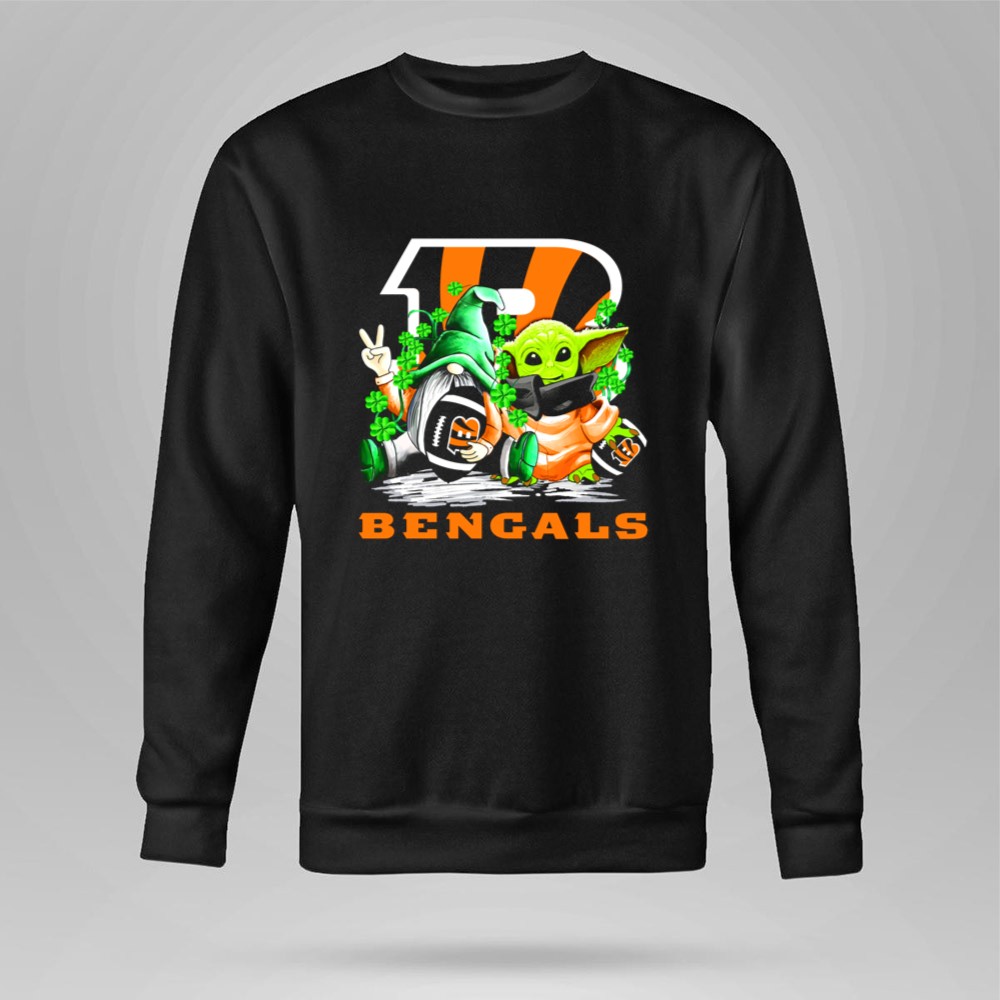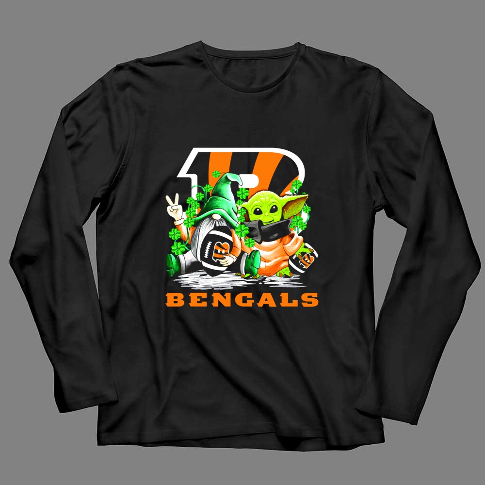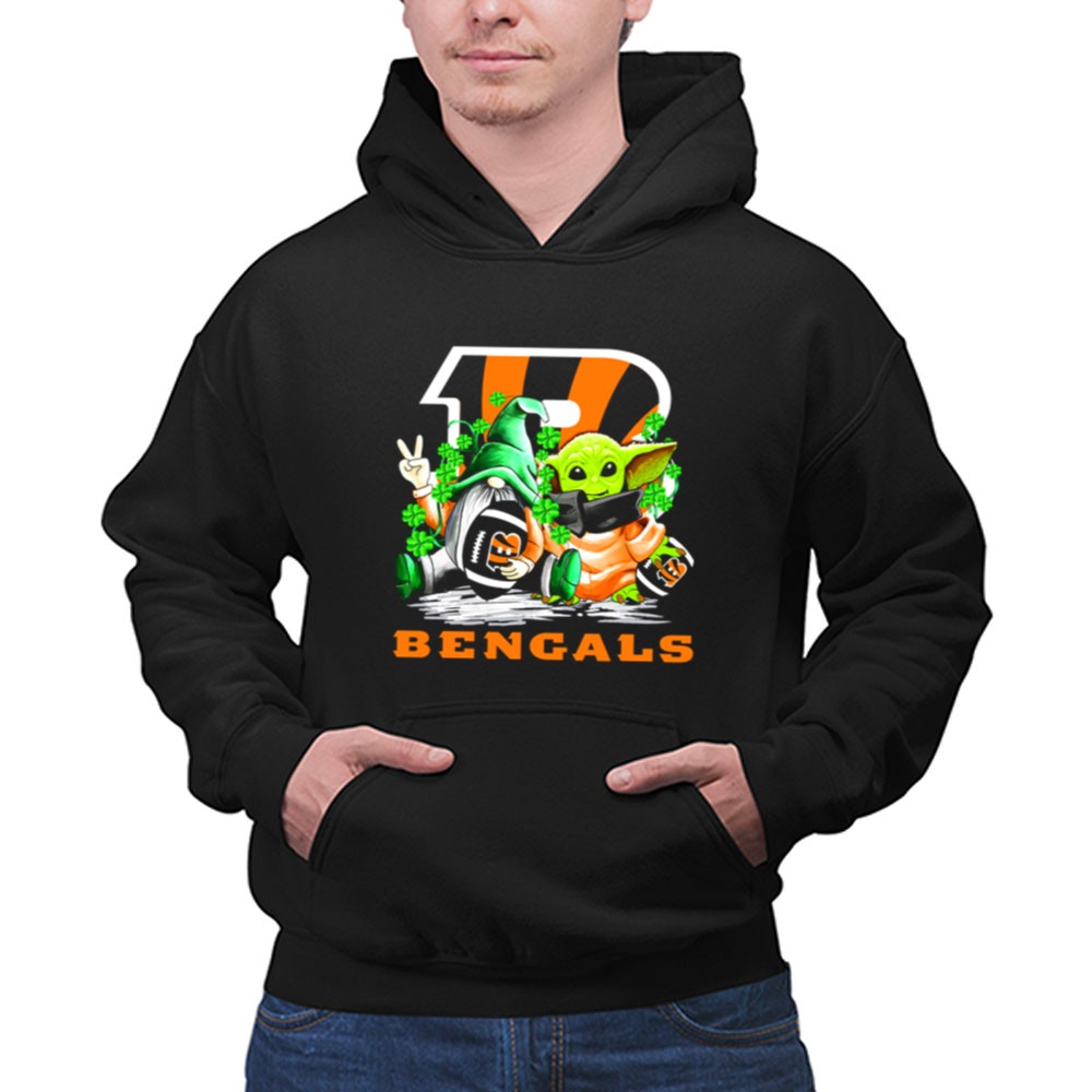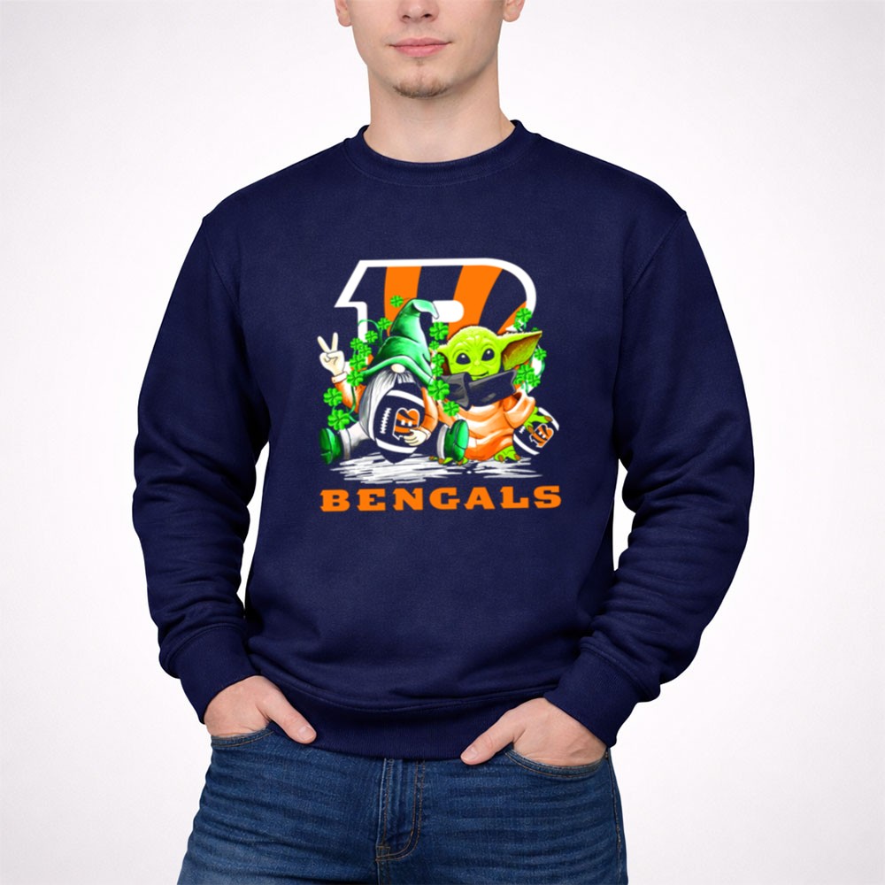 Cincinnati Bengals pride, St. Patrick's Day apparel, football gnome design, Baby Yoda merch, game day t-shirt, NFL fan gear, festive sports clothing, shamrock celebration