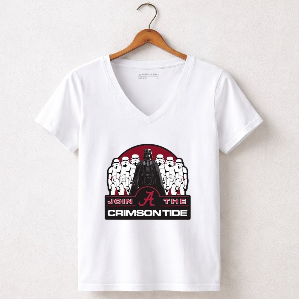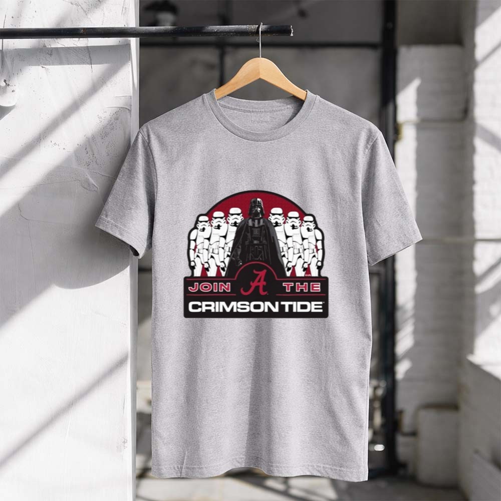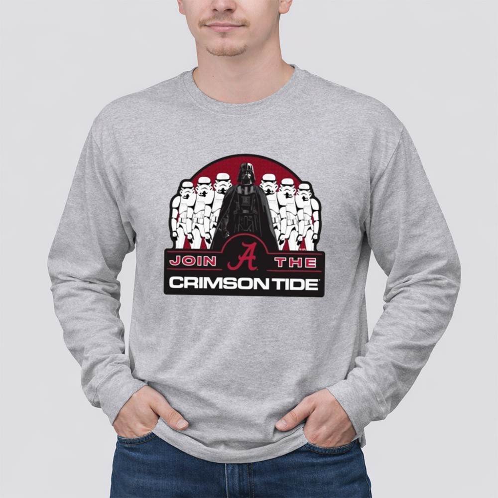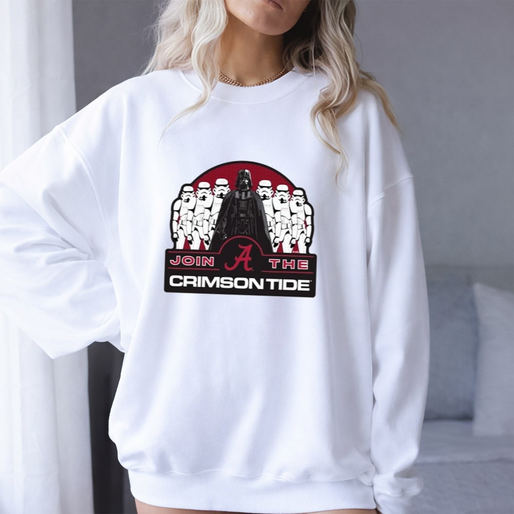 This design invites you to ‘JOIN THE CRIMSON TIDE’ alongside Darth Vader and Stormtroopers, creating a unique blend of college football passion and sci-fi nostalgia. It embodies the celebration of Alabama’s powerful football legacy while playfully acknowledging the camaraderie of fandom, making it a must-have for any game day.