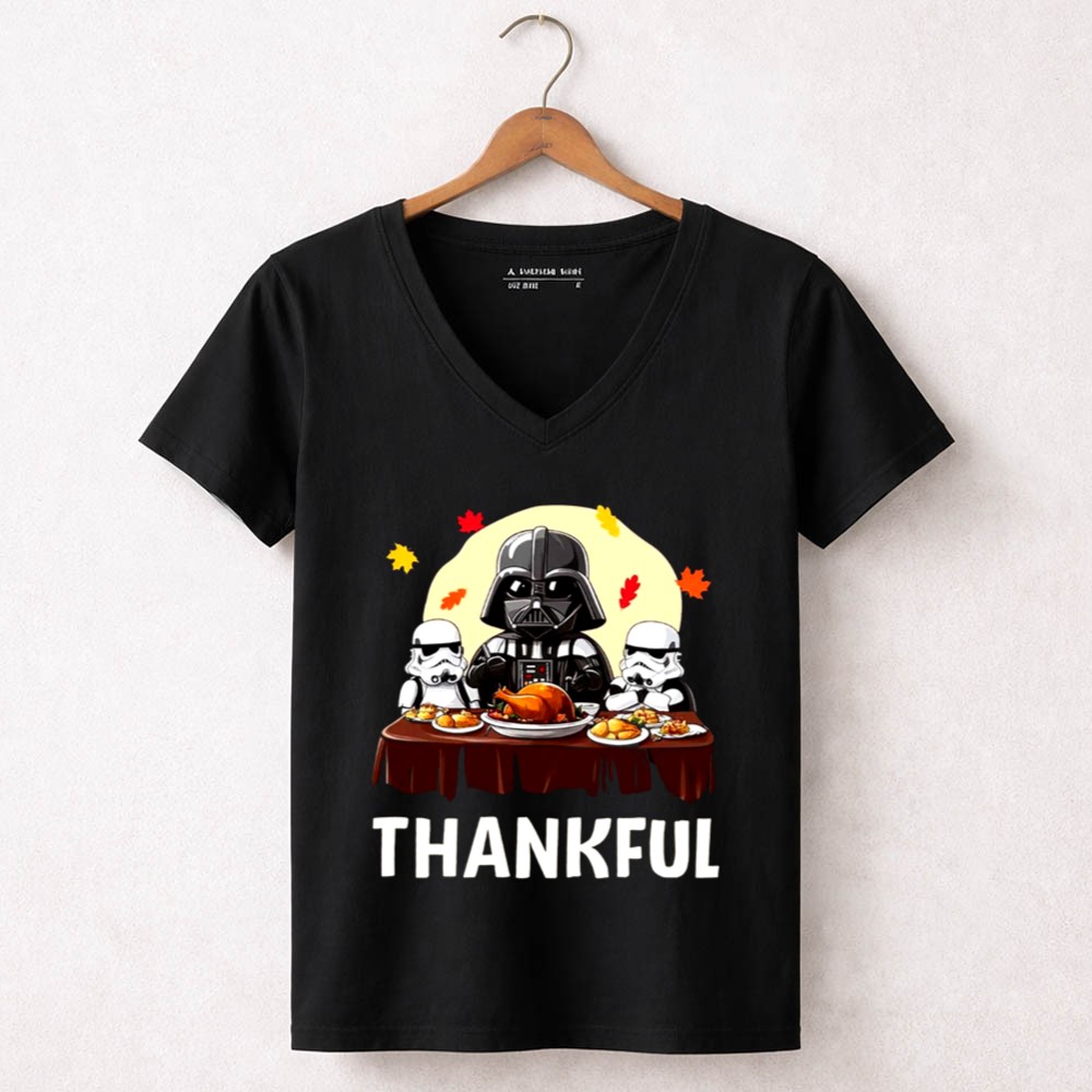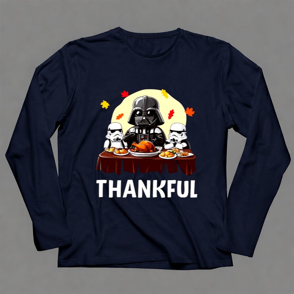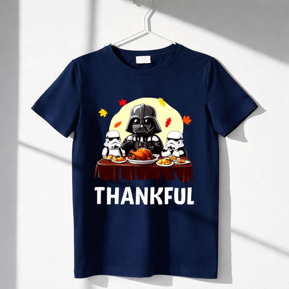This playful design captures the essence of Thanksgiving with a humorous twist, showcasing Darth Vader and two Stormtroopers gathered around a festive feast. The word ‘THANKFUL’ shines brightly, reminding us that even in a galaxy far, far away, gratitude and togetherness are celebrated. It’s a delightful mashup of pop culture and holiday spirit that resonates with fans of all ages.