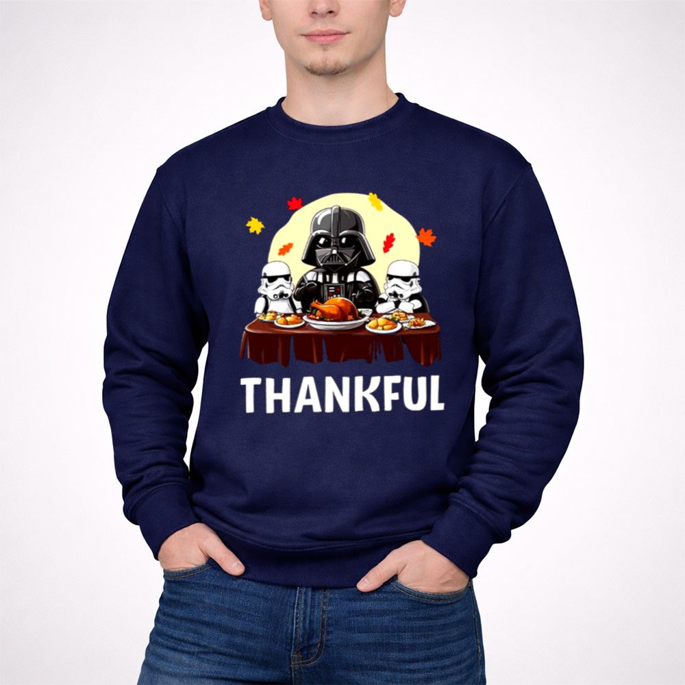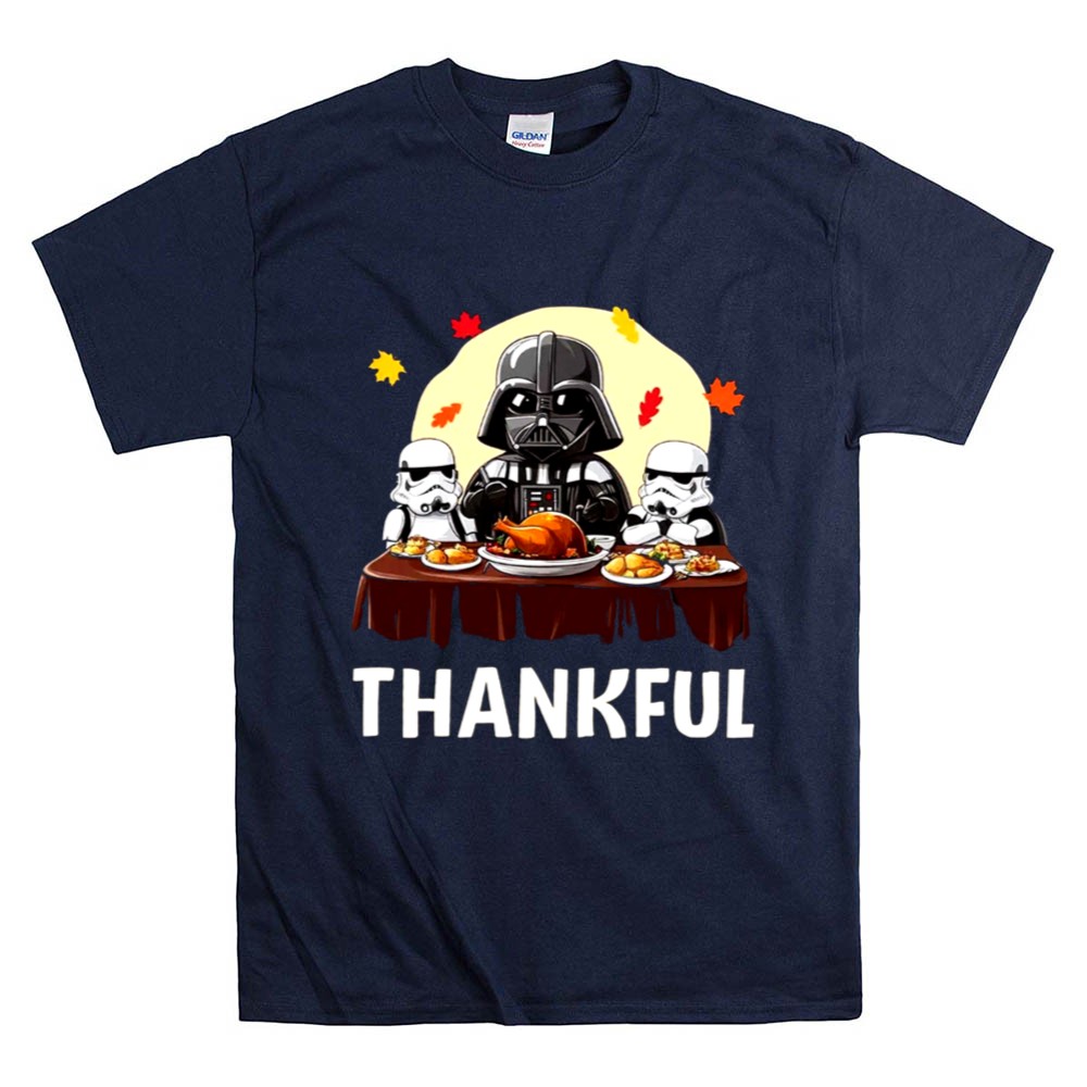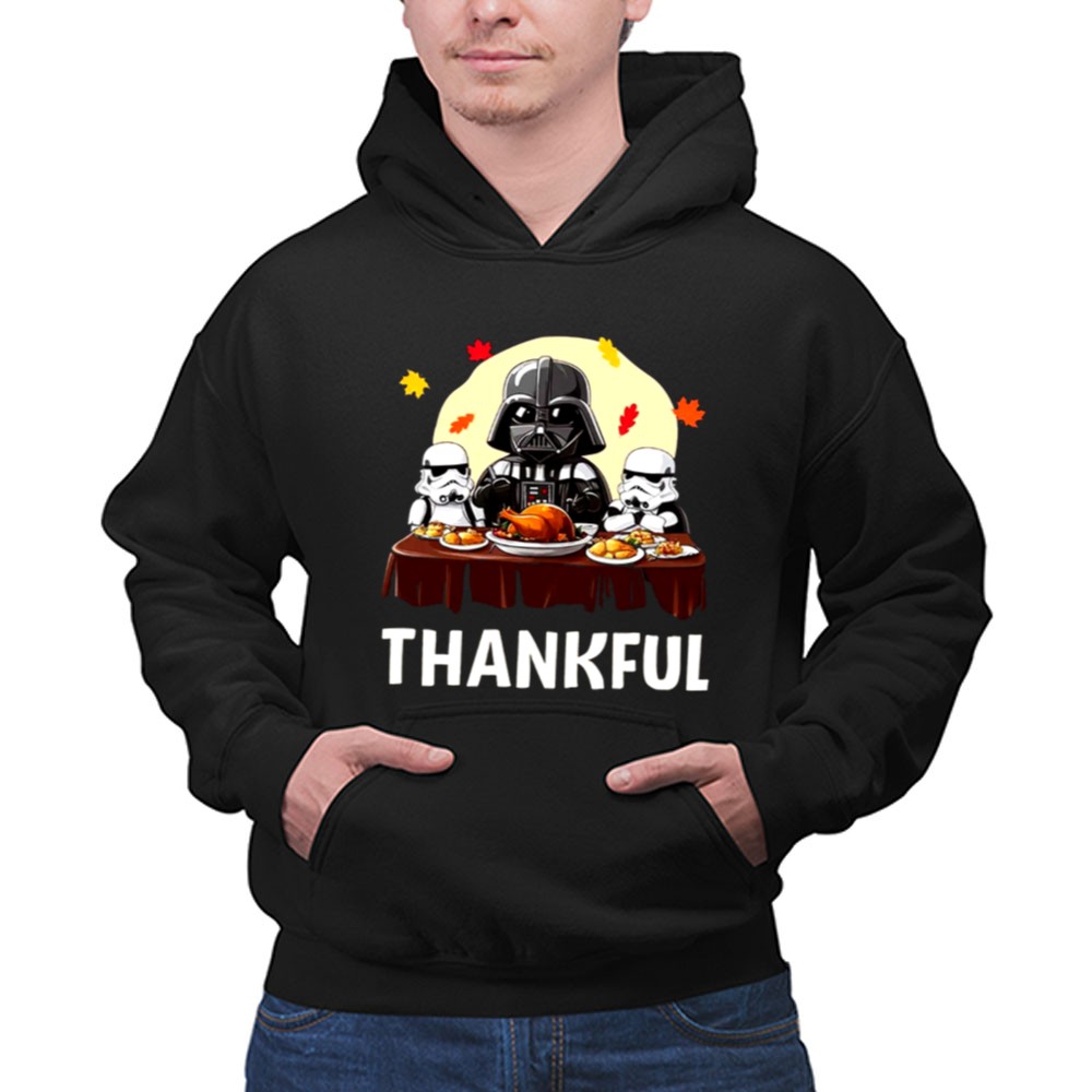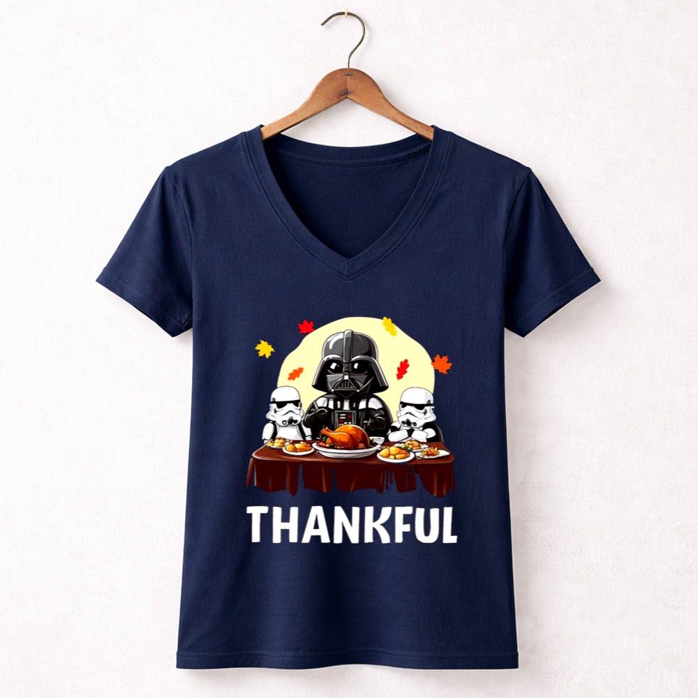 This playful design captures the essence of Thanksgiving with a humorous twist, showcasing Darth Vader and two Stormtroopers gathered around a festive feast. The word ‘THANKFUL’ shines brightly, reminding us that even in a galaxy far, far away, gratitude and togetherness are celebrated. It’s a delightful mashup of pop culture and holiday spirit that resonates with fans of all ages.