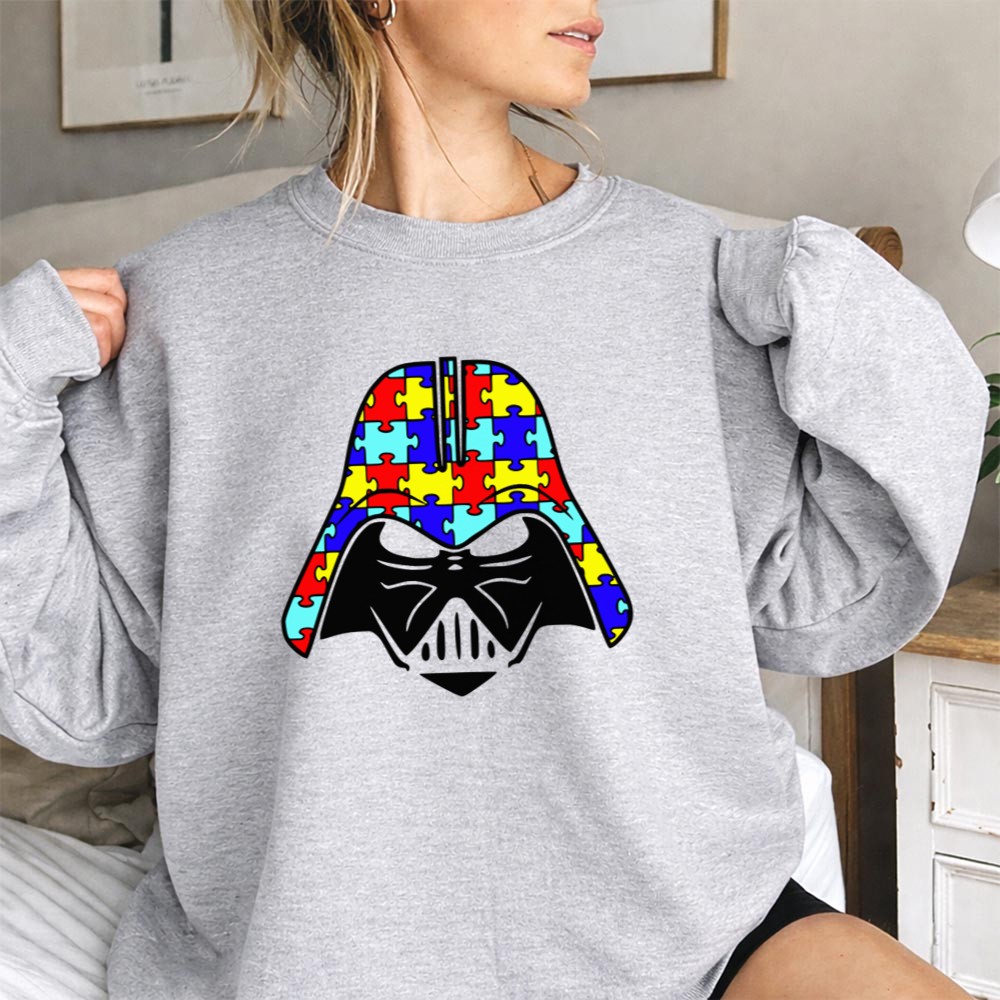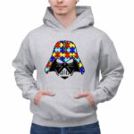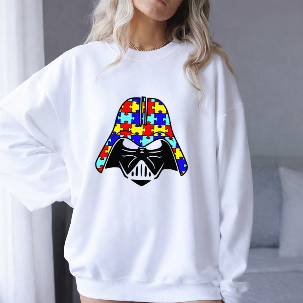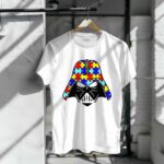 This design merges the iconic Darth Vader face with a vibrant puzzle piece pattern, symbolizing the beauty of neurodiversity and the importance of compassion. The bold graphic style reflects a modern streetwear aesthetic, making it not just a tribute but a statement of support during Autism Awareness Month. It invites wearers to embrace differences and promote understanding in a fun, relatable way.