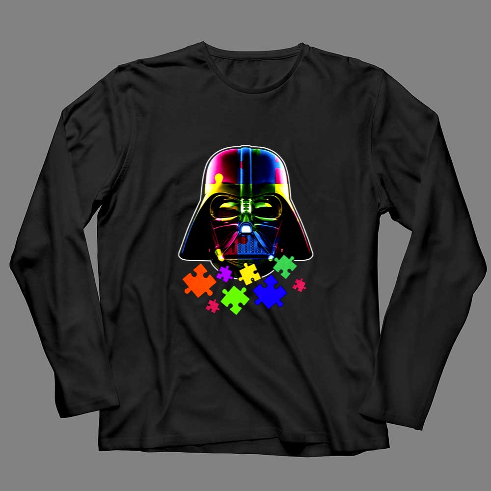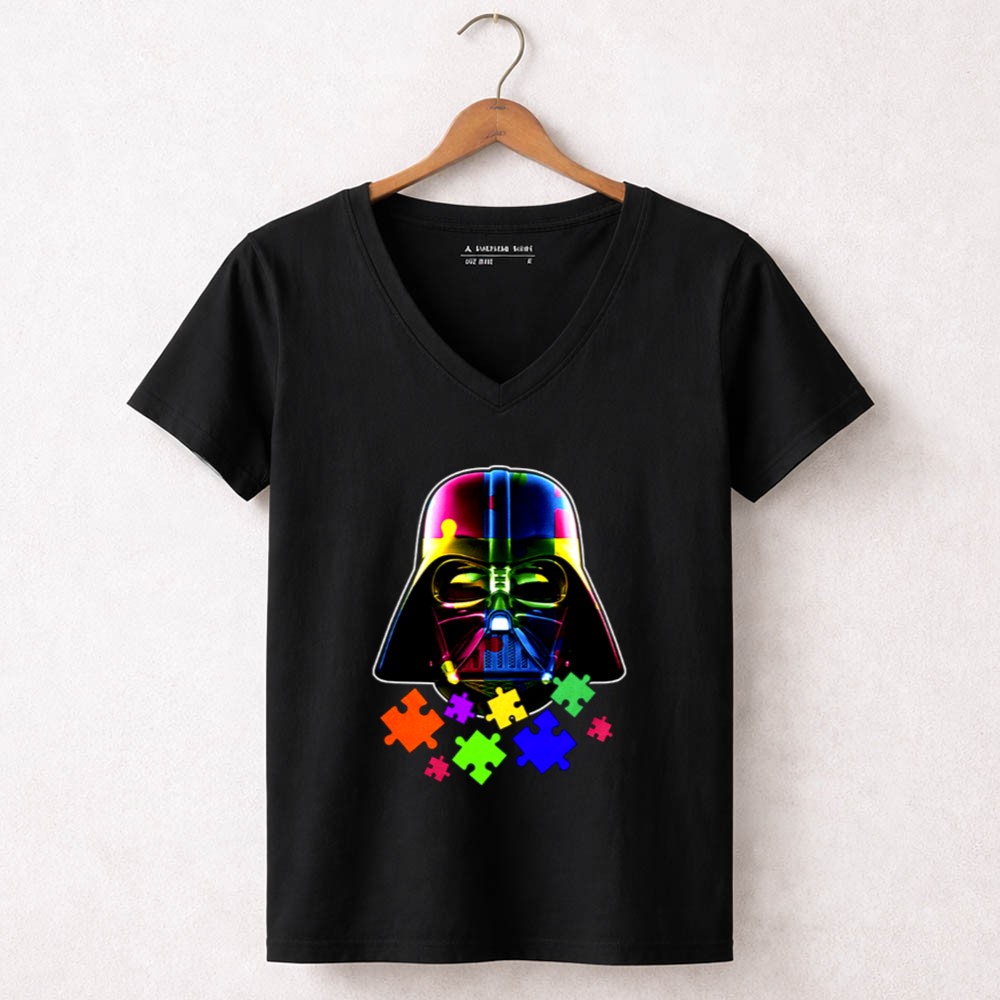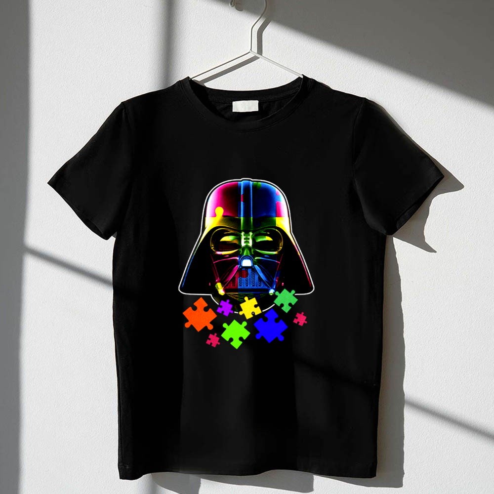 Darth Vader, autism awareness, colorful puzzle pieces, Star Wars fan apparel, mental health support, inclusive fashion, unique gift for fans, premium soft t-shirt