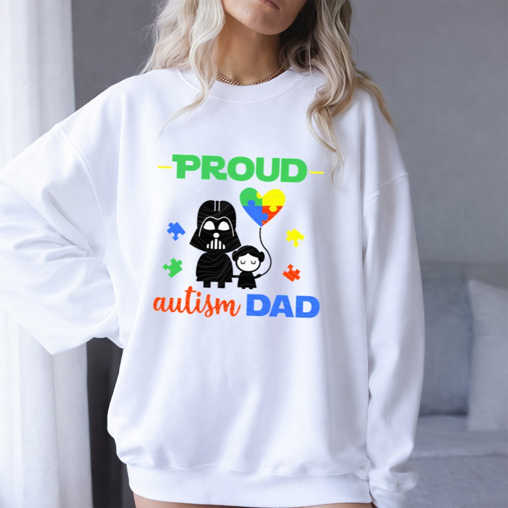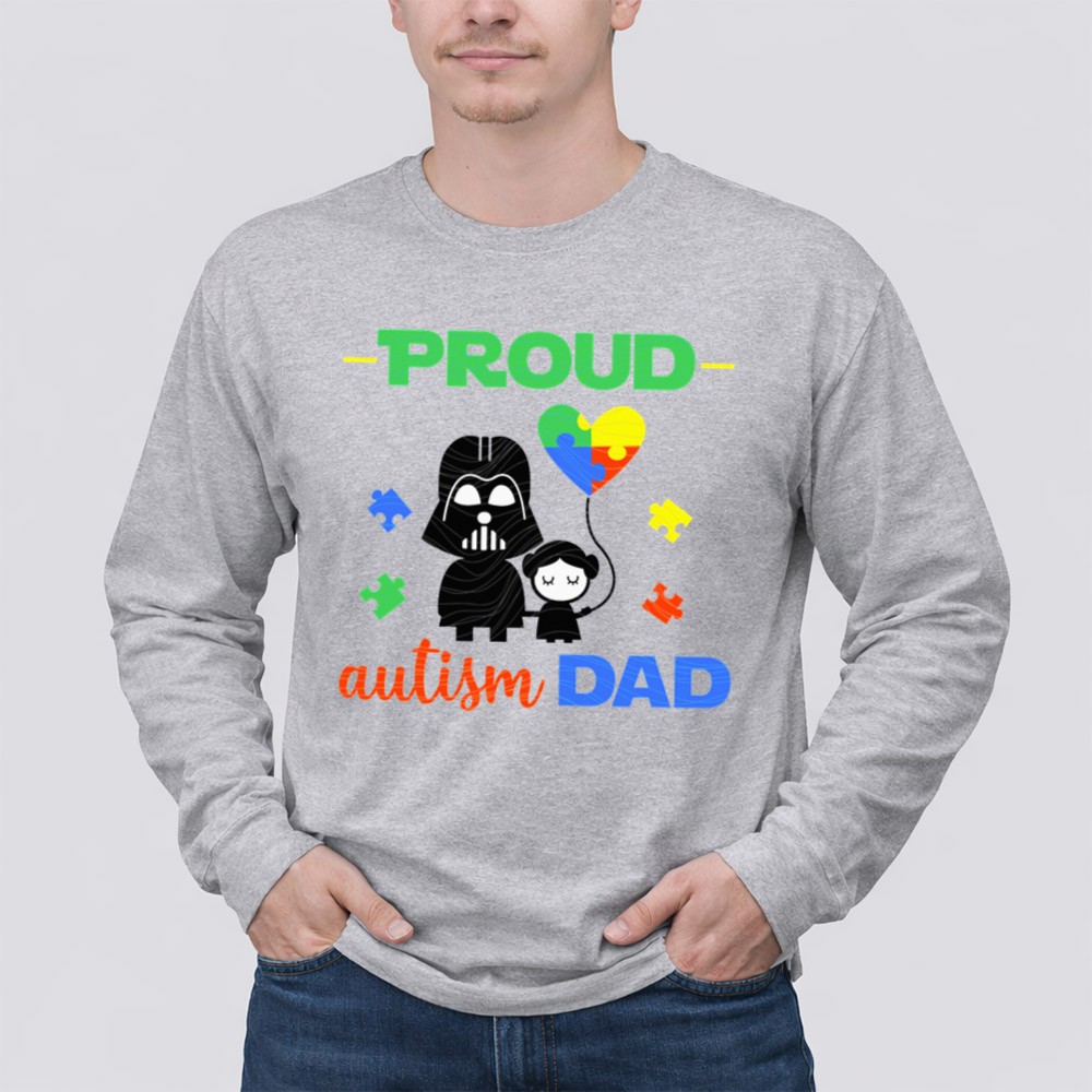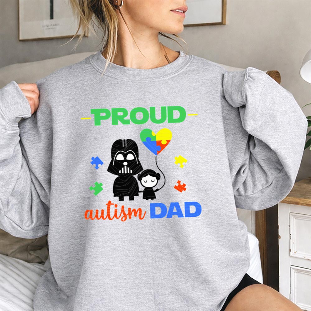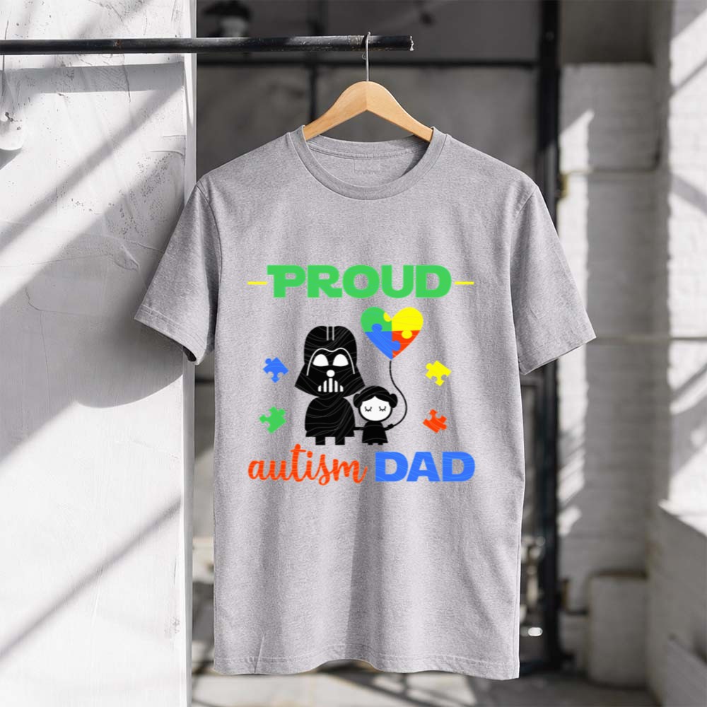 autism awareness, proud dad apparel, family support, Star Wars dad shirt, colorful puzzle pieces, autism pride, unique father-son gift, character-themed t-shirt
