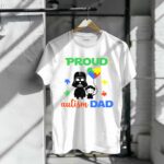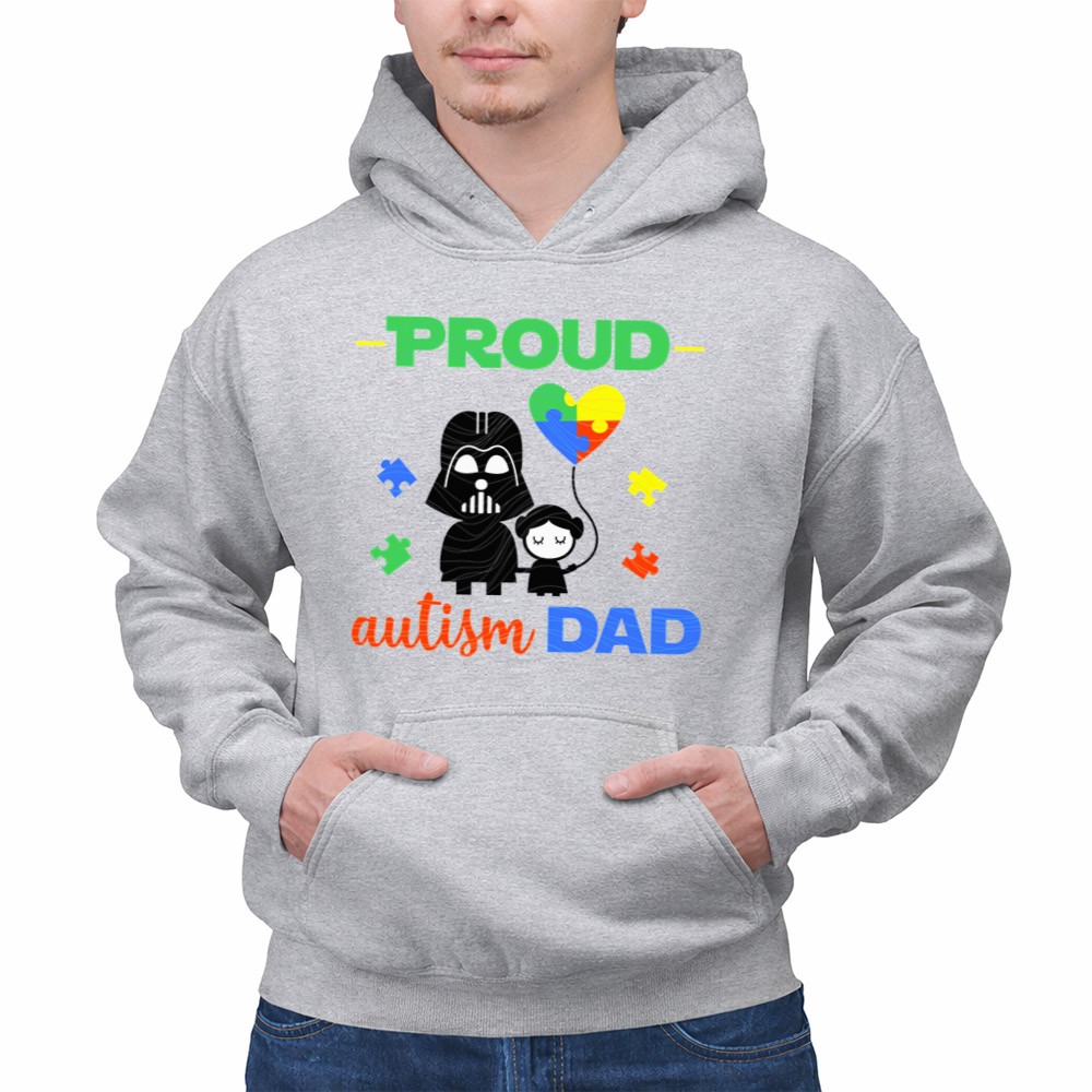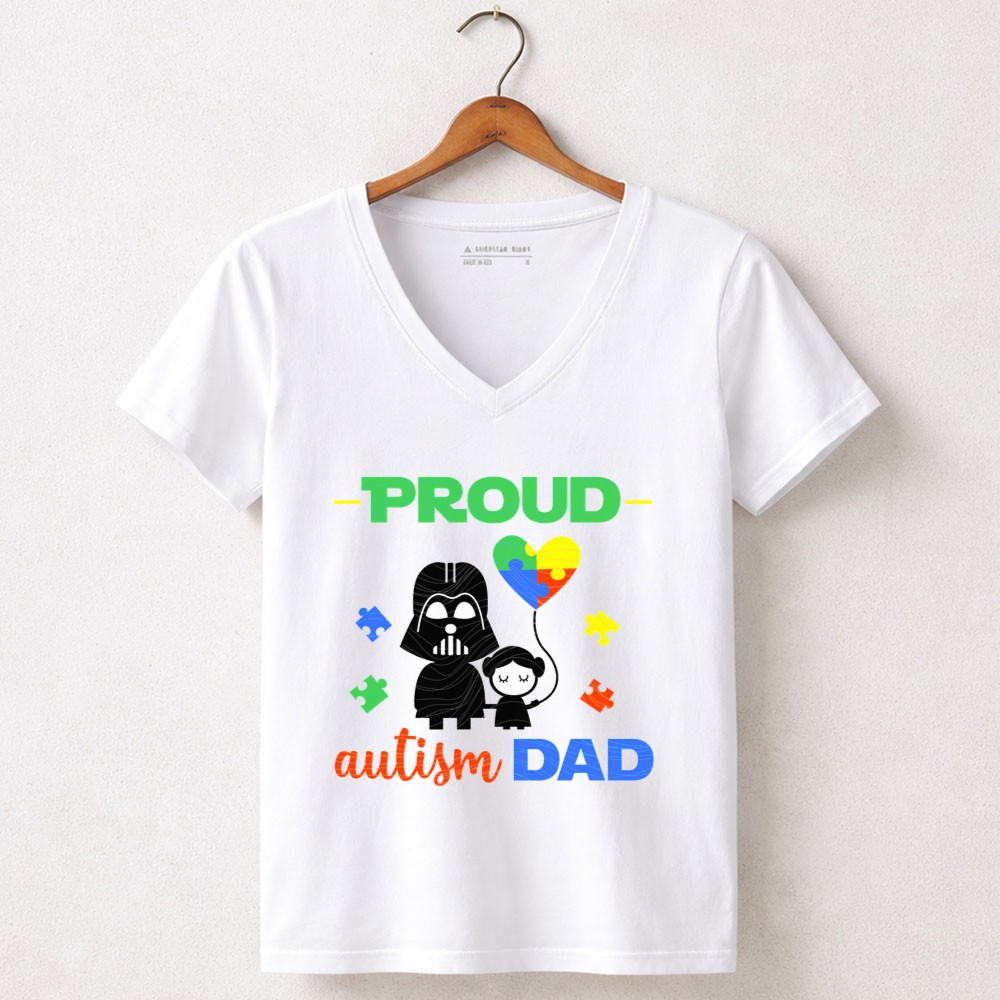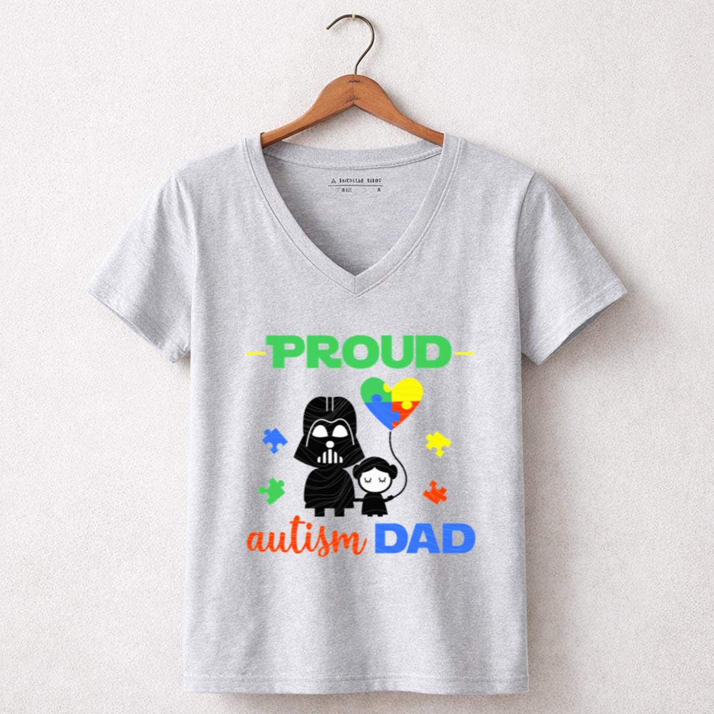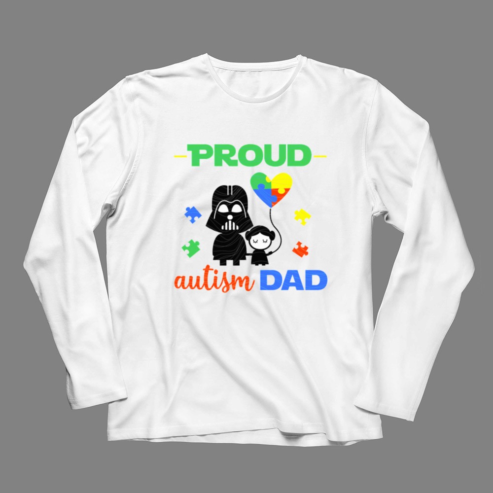 autism awareness, proud dad apparel, family support, Star Wars dad shirt, colorful puzzle pieces, autism pride, unique father-son gift, character-themed t-shirt