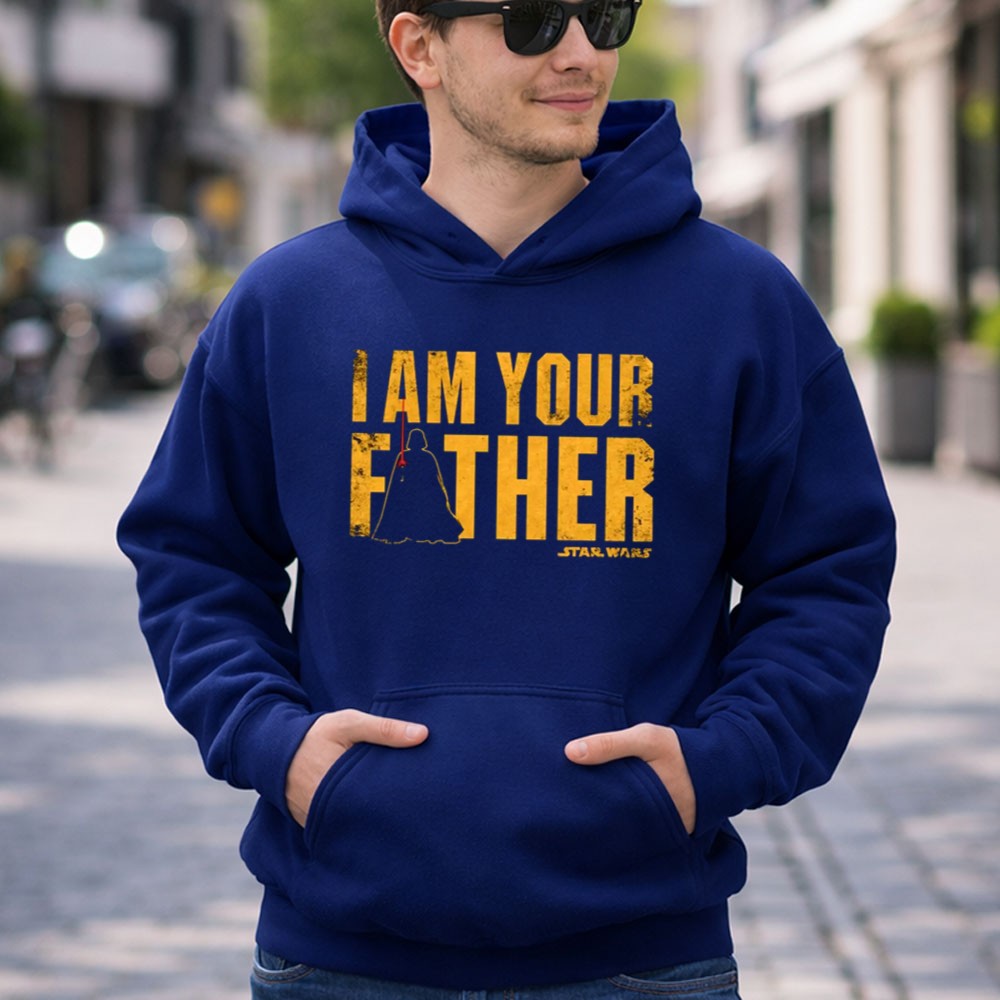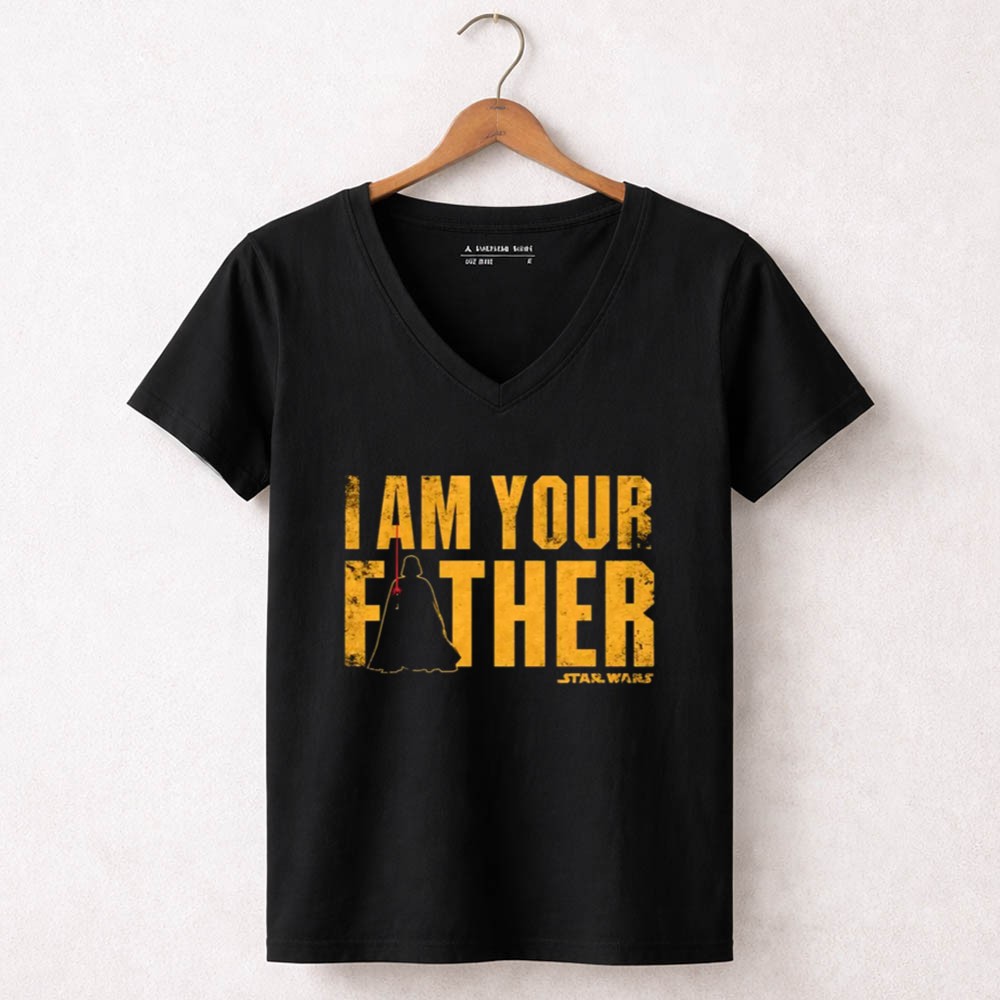 This design captures the essence of one of cinema’s most memorable moments, weaving together nostalgia and pride for the beloved Star Wars saga. The bold distressed yellow text and Darth Vader silhouette serve as a tribute to the relationship between fathers and their children, inviting fans to celebrate shared memories from a galaxy far, far away.