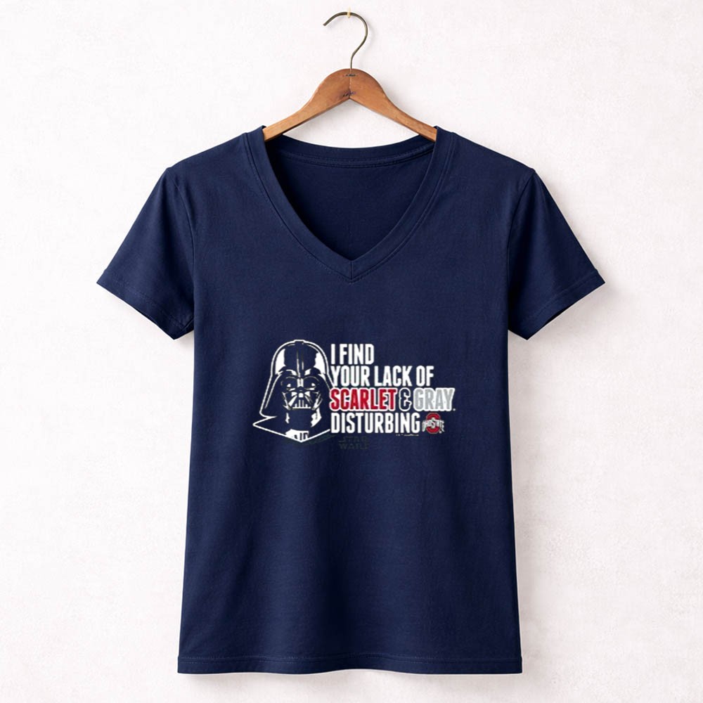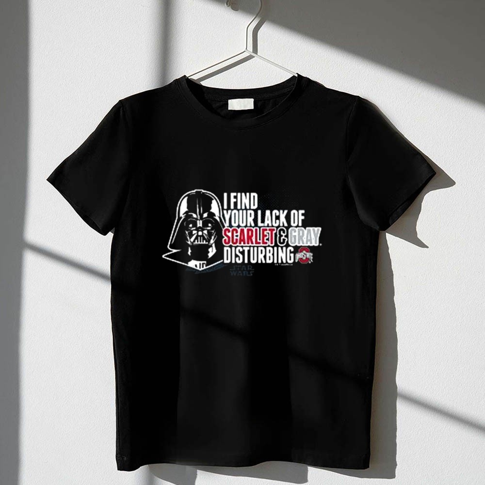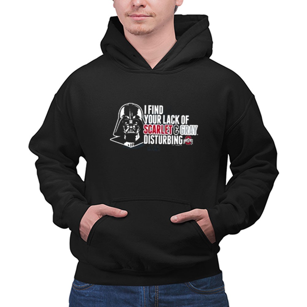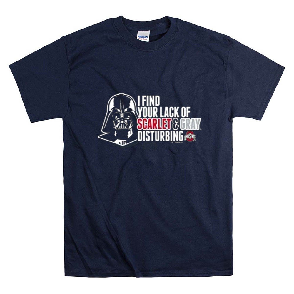 This design captures the essence of fandom by merging the fierce loyalty of Ohio State supporters with the iconic presence of Darth Vader. The bold statement, ‘I FIND YOUR LACK OF SCARLET & GRAY DISTURBING,’ playfully reflects the spirited rivalries of college football while celebrating a shared love for pop culture. It’s a tribute to the fun and camaraderie found in both the stands and in the galaxy far, far away.