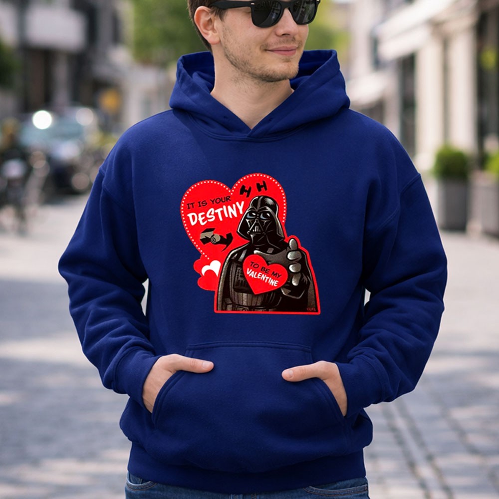 This design captures the essence of love and fun through a playful mashup of iconic pop culture. Featuring Darth Vader, the quote ‘IT IS YOUR DESTINY TO BE MY VALENTINE’ evokes a lighthearted sense of romance that resonates with fans. The vibrant colors and comic art style bring an element of joy, making it a perfect celebration of love in a galaxy where every connection is powerful.