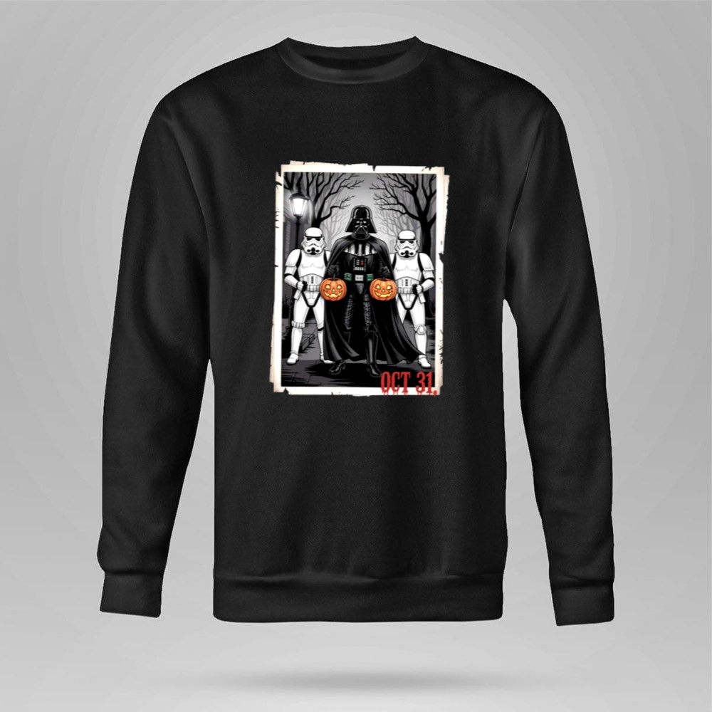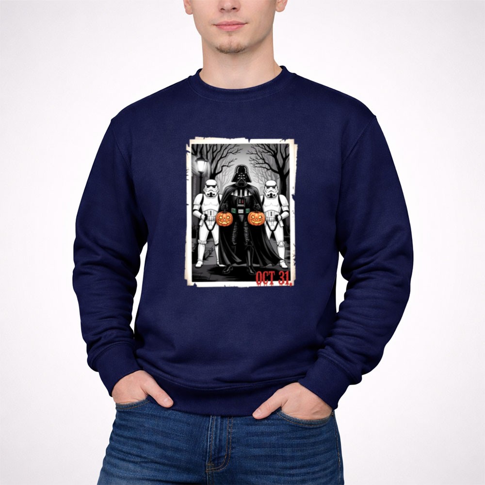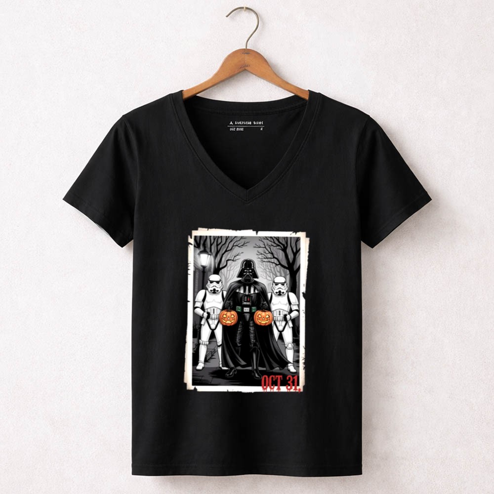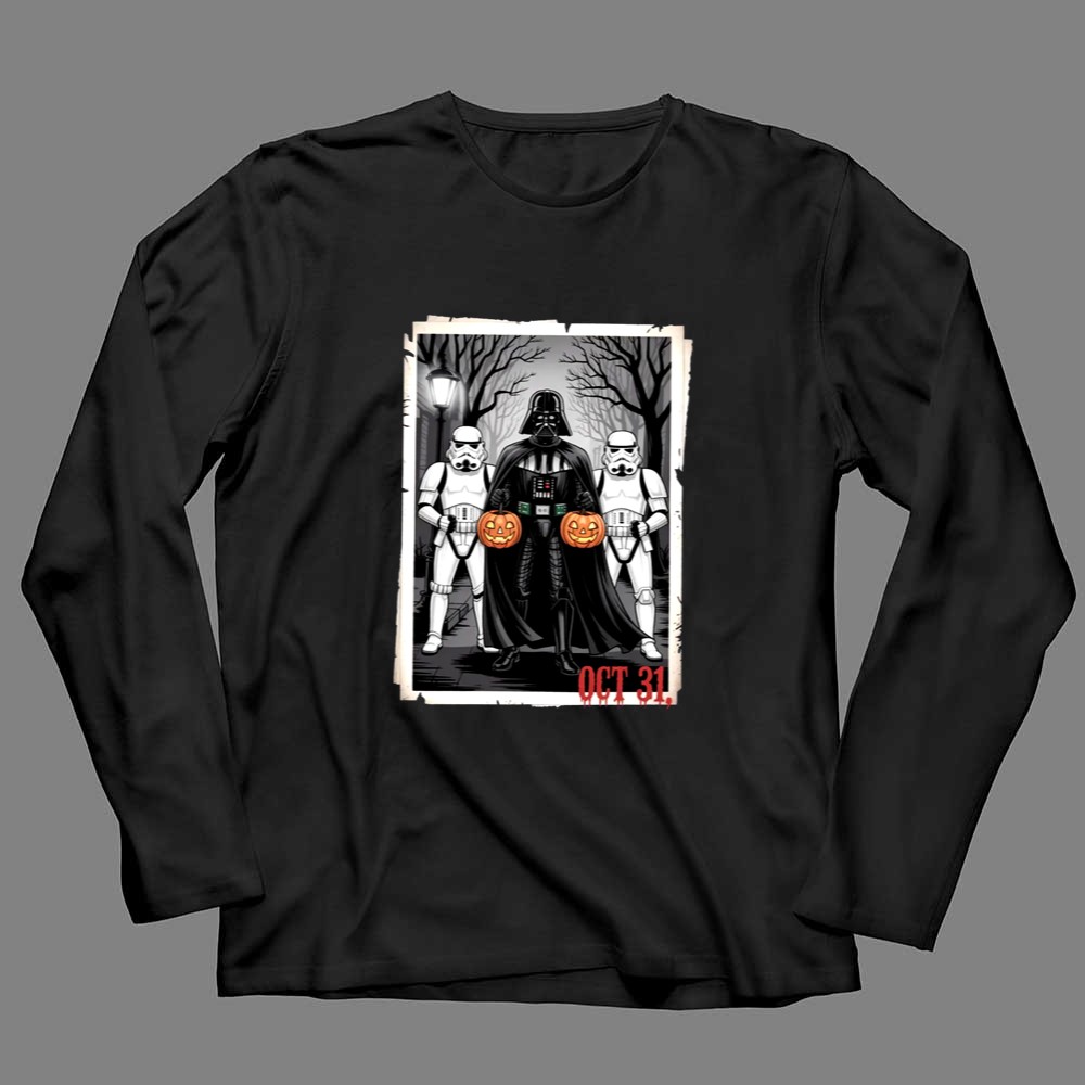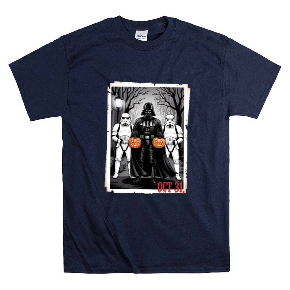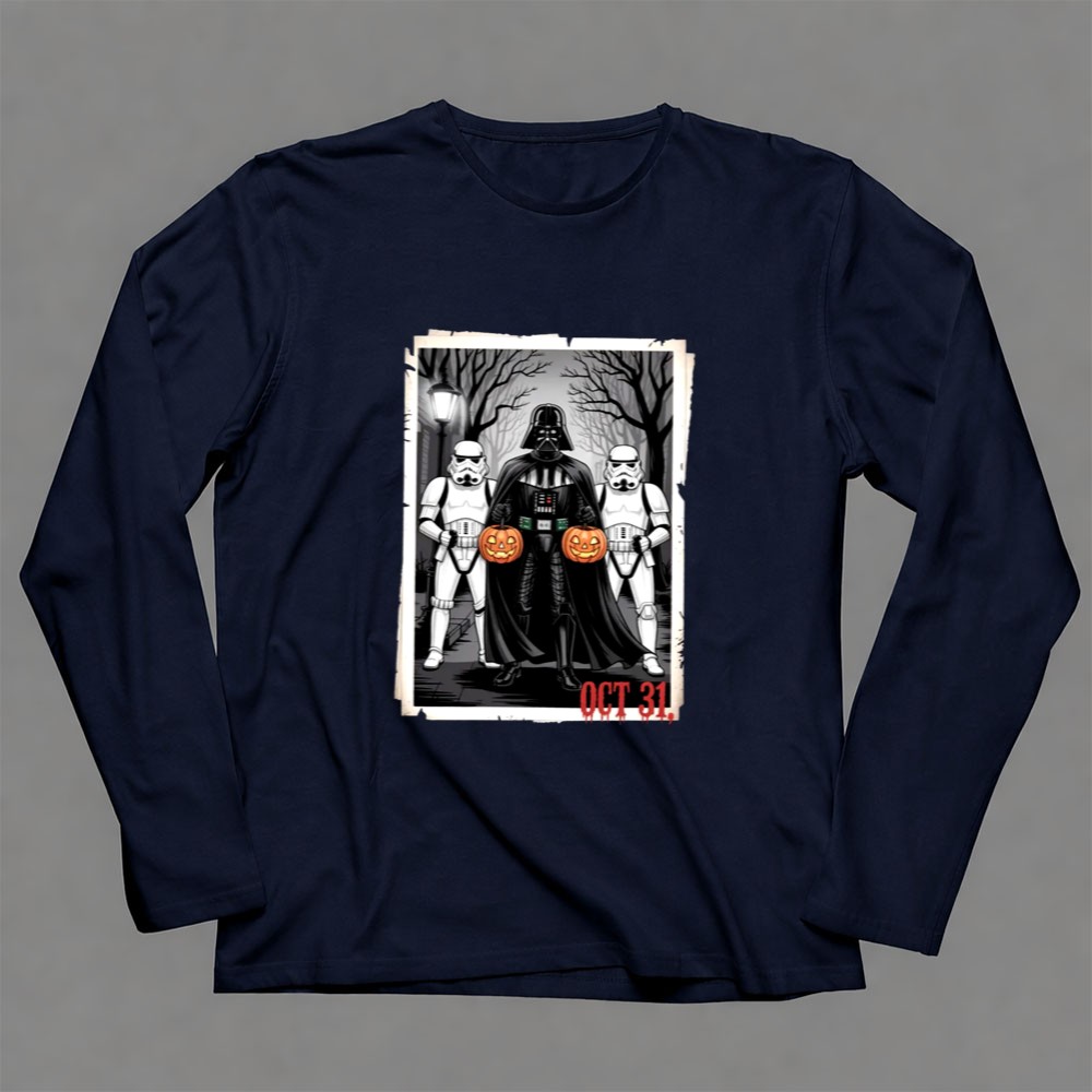 This design captures the fun and spooky essence of Halloween by featuring Darth Vader and two Stormtroopers, whimsically holding pumpkins against a haunting backdrop. It represents a lighthearted take on the beloved Star Wars universe, inviting fans to merge their love for the franchise with the thrill of October festivities. The cartoon illustration brings a sense of joy and dark humor, perfect for those who appreciate the playful side of geek culture.