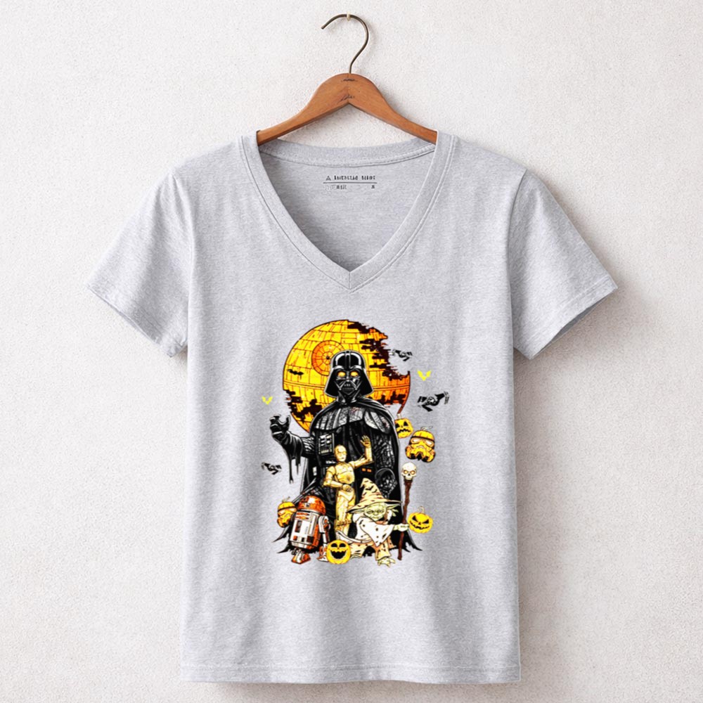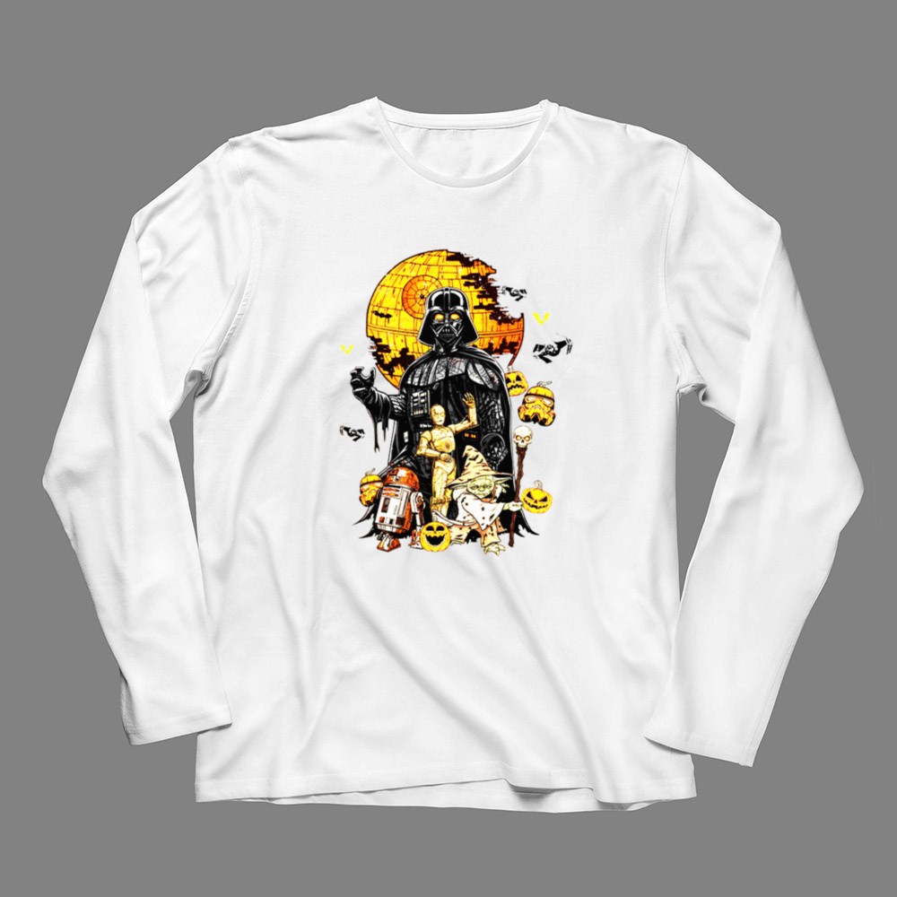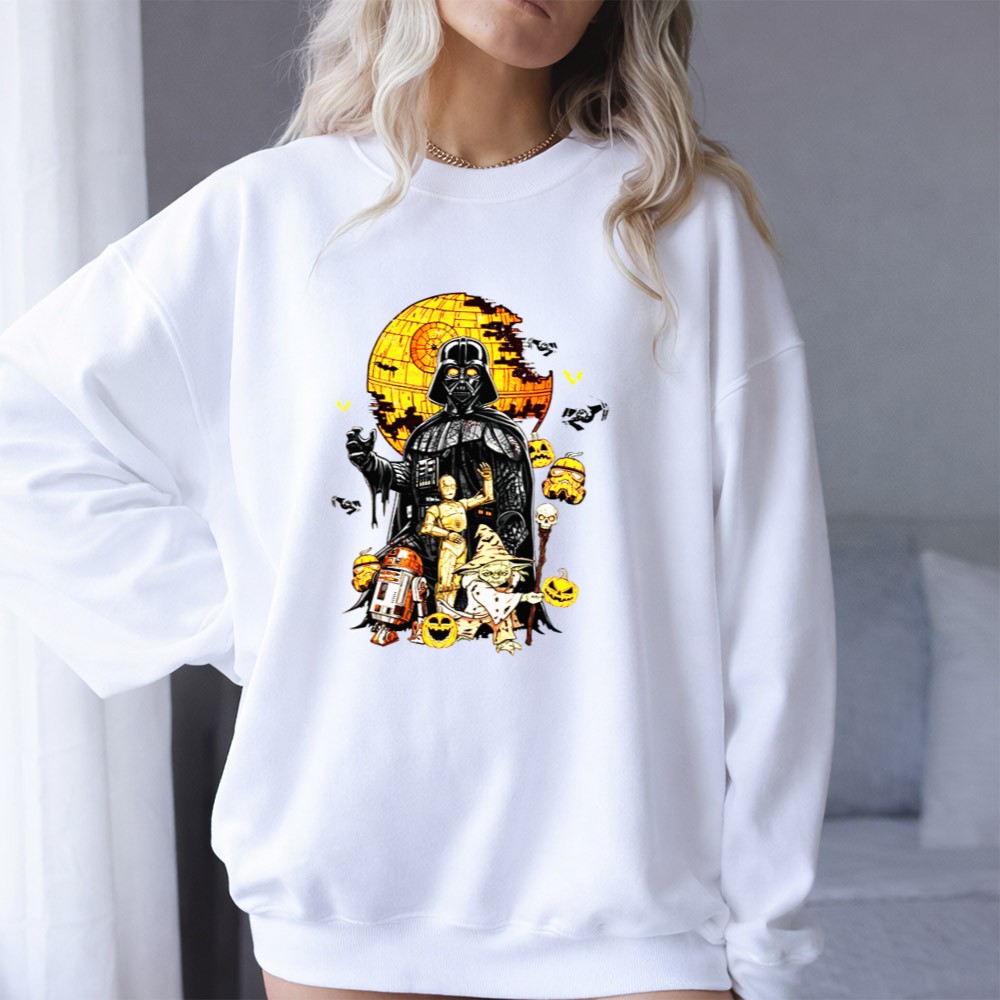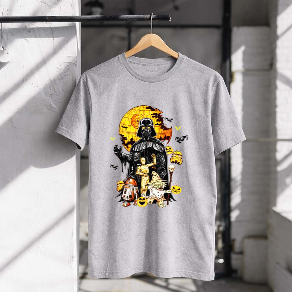 This vibrant design captures the spirit of Halloween with a delightful twist on beloved Star Wars characters. Set against the iconic Death Star, Darth Vader, R2-D2, and C-3PO bring a sense of whimsy and nostalgia, inviting fans to relive epic adventures while celebrating the festive season. It’s a playful mashup that embodies the fun and charm of both Halloween and sci-fi fandom.