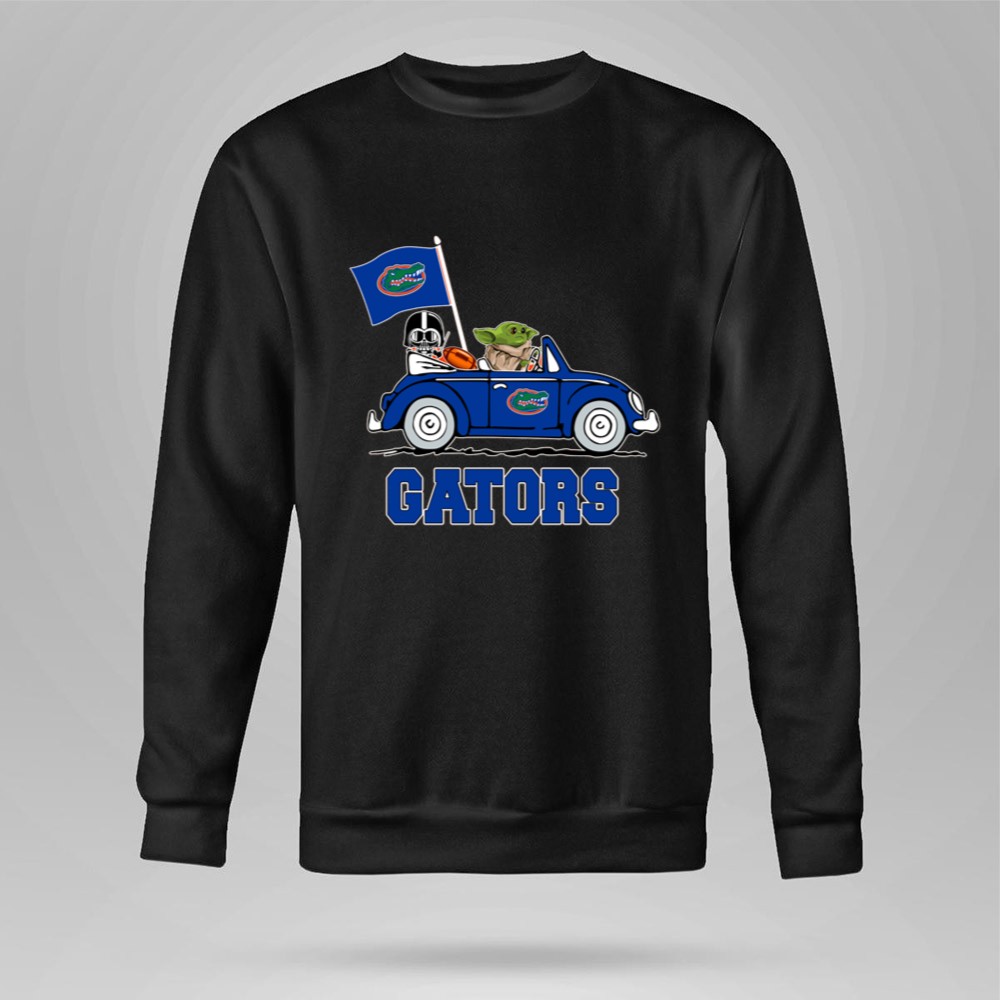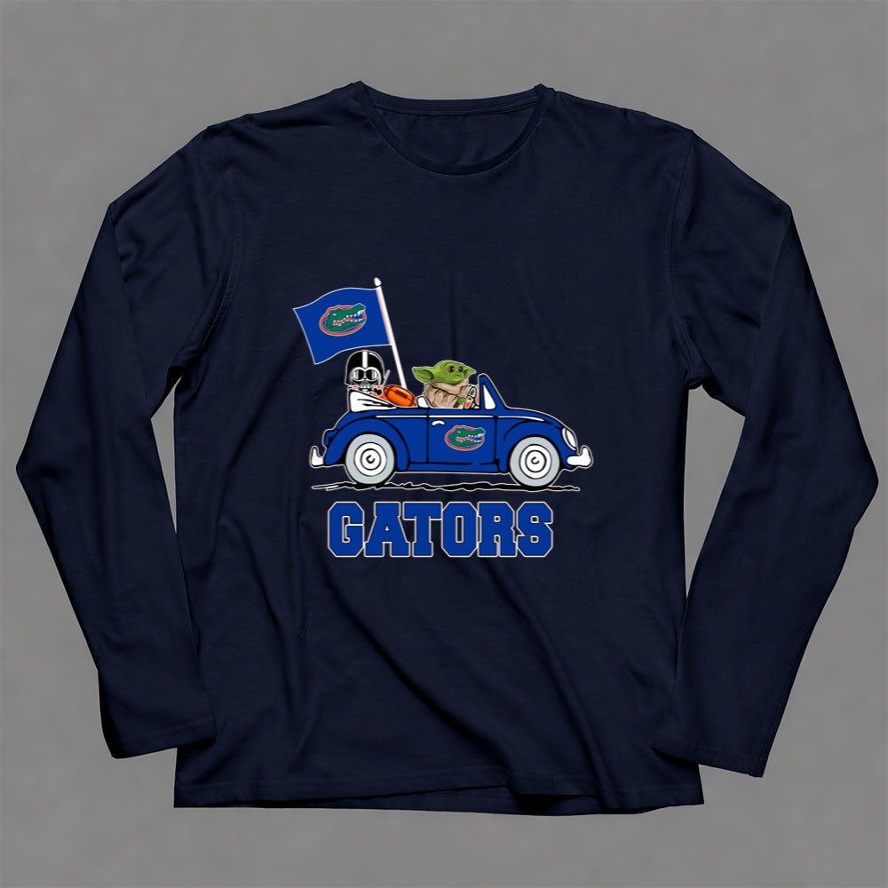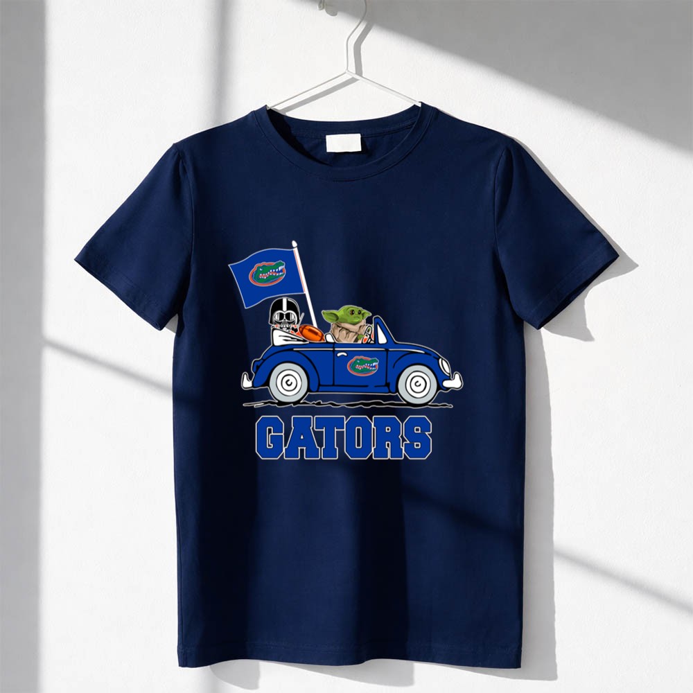 This whimsical design showcases Darth Vader and Baby Yoda cruising in a blue car, proudly waving a Gators flag. It beautifully merges the excitement of college football with the magic of the Star Wars universe, inviting wearers to celebrate their fandom in a joyful and creative way. Each glance at this shirt evokes a sense of unity and nostalgia, making it a heartfelt tribute to the spirit of Gators pride.