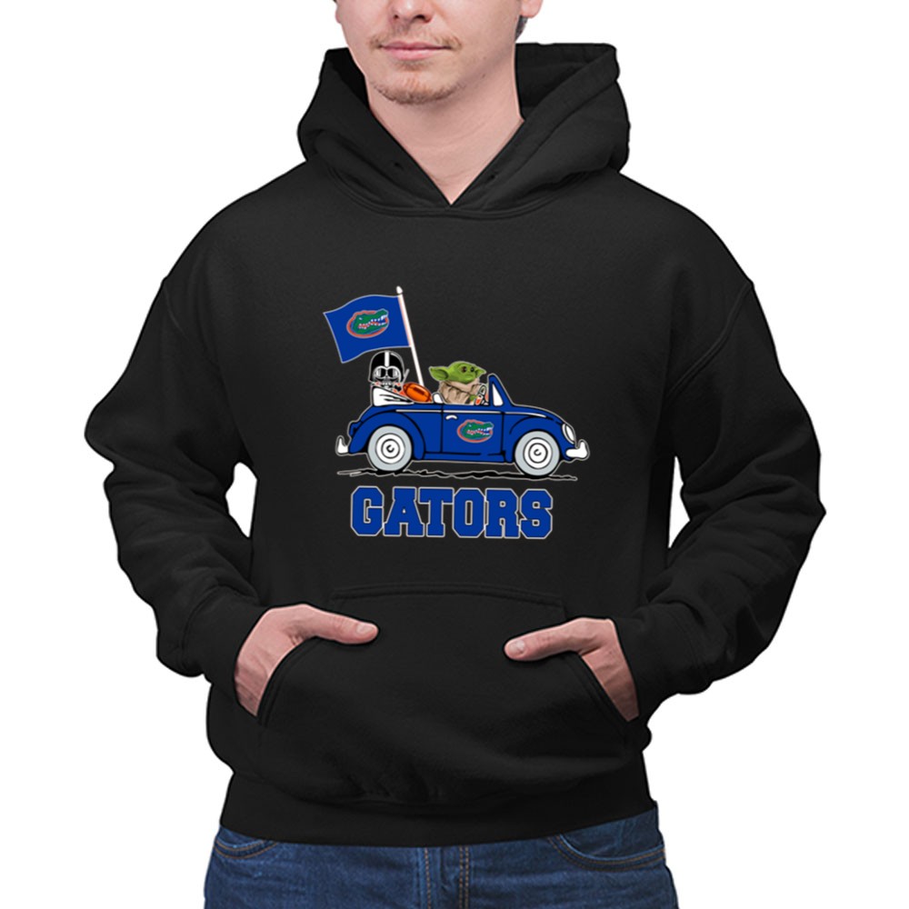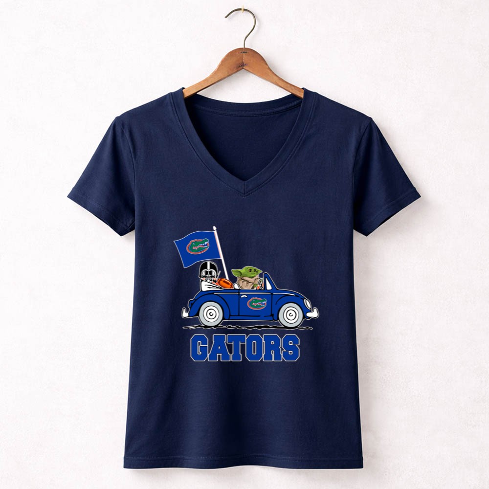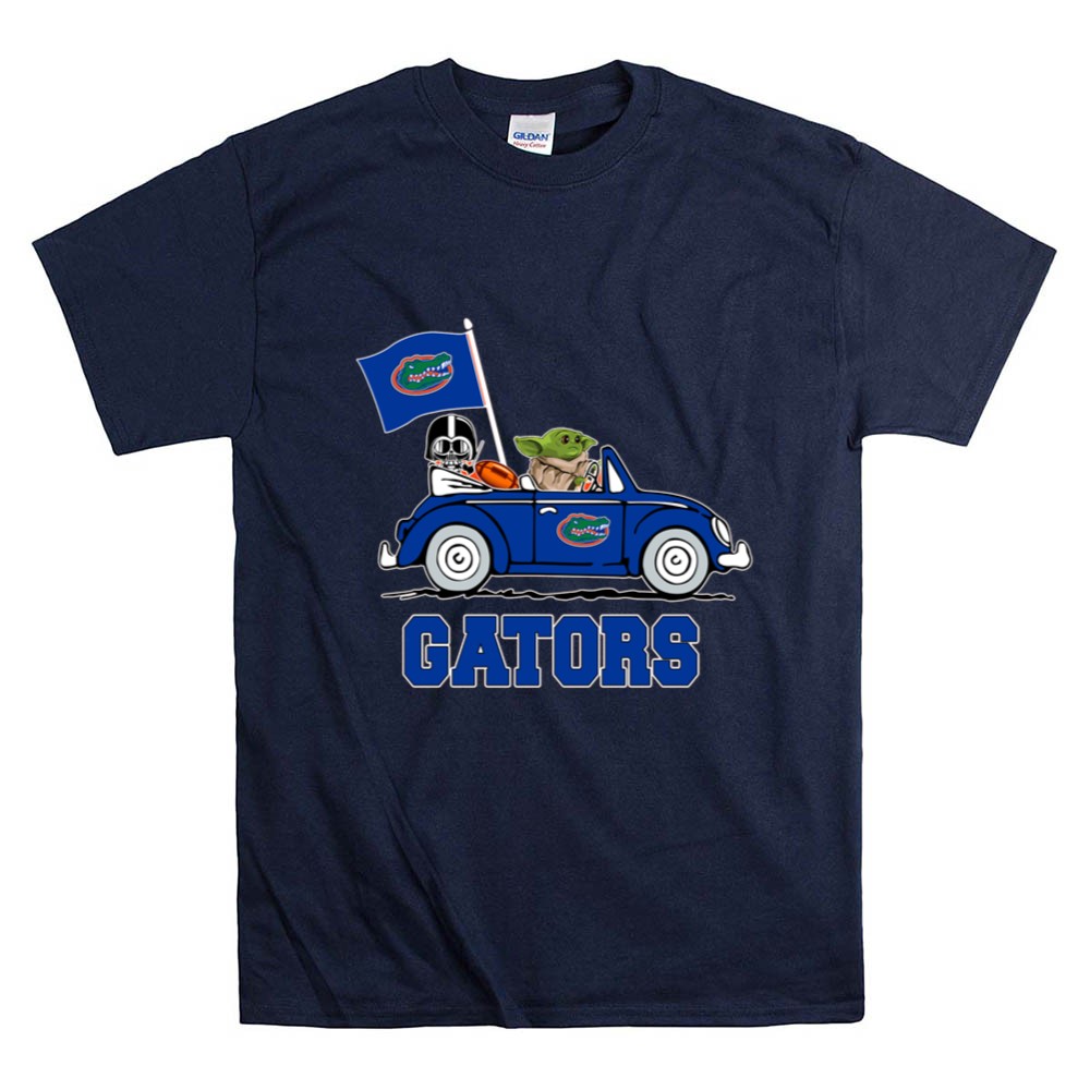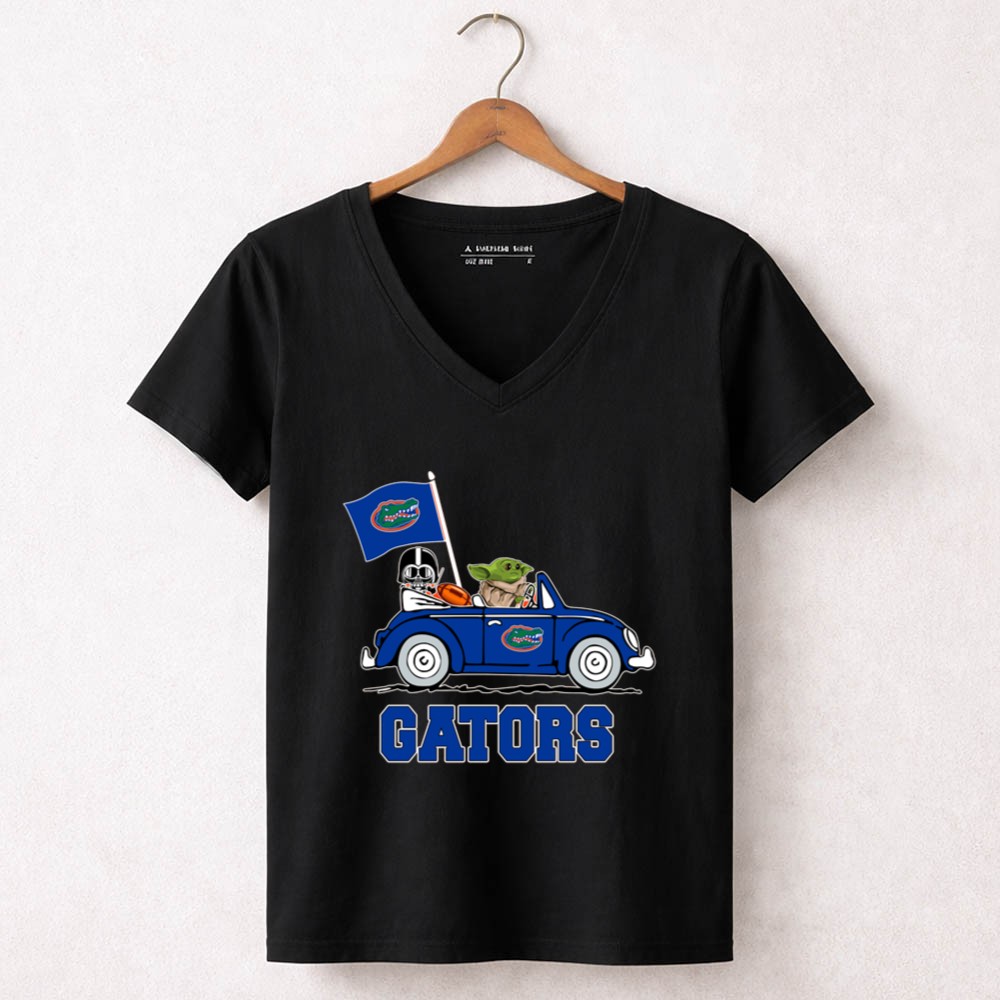 This whimsical design showcases Darth Vader and Baby Yoda cruising in a blue car, proudly waving a Gators flag. It beautifully merges the excitement of college football with the magic of the Star Wars universe, inviting wearers to celebrate their fandom in a joyful and creative way. Each glance at this shirt evokes a sense of unity and nostalgia, making it a heartfelt tribute to the spirit of Gators pride.