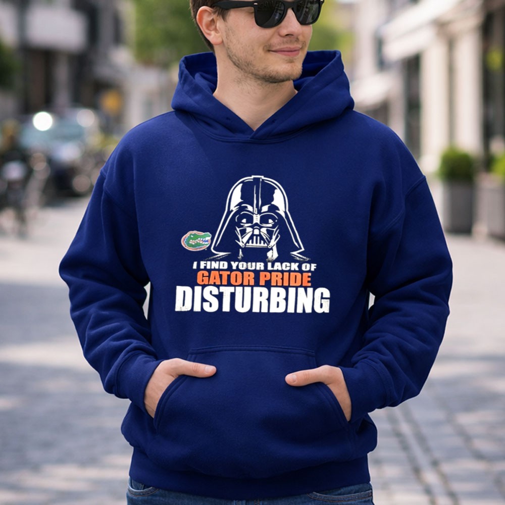 This design cleverly fuses a beloved pop culture reference with the vibrant spirit of Florida Gators pride. The phrase ‘I FIND YOUR LACK OF GATOR PRIDE DISTURBING’ evokes both laughter and loyalty, encapsulating the lighthearted yet passionate bond among fans. It’s more than just a shirt; it’s a badge of honor for those who stand united in their support for the Gators.