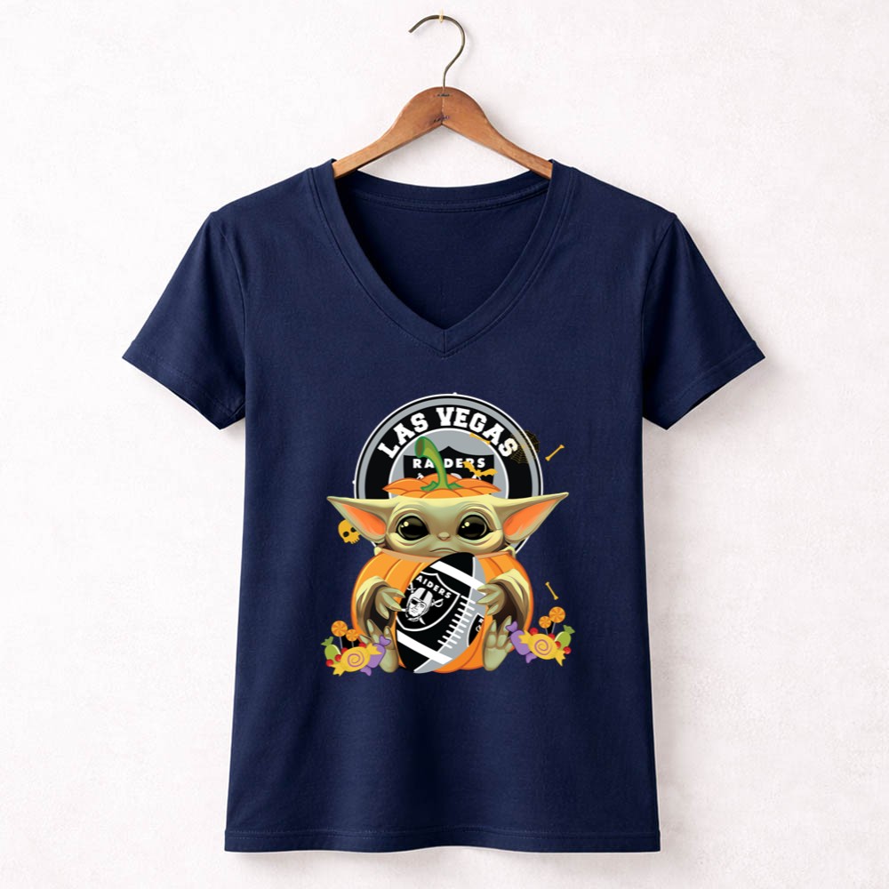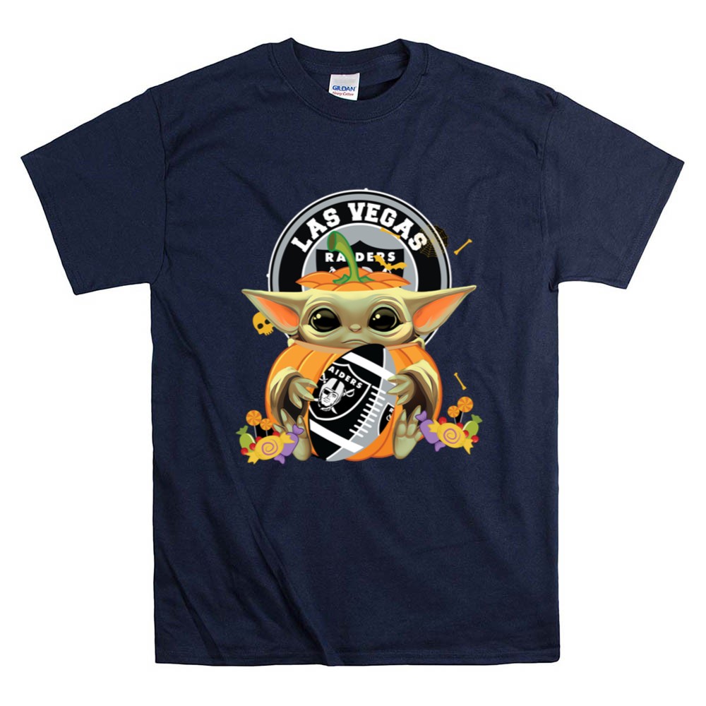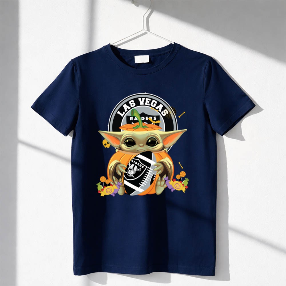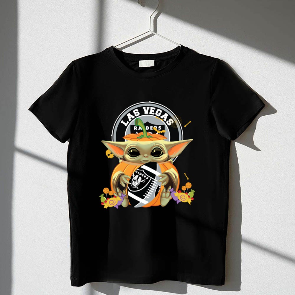 Las Vegas Raiders apparel, Baby Yoda fan gear, Halloween sports shirt, Raiders pumpkin design, Star Wars sports mashup, festive game day outfit, premium cotton t-shirt, Halloween party wear