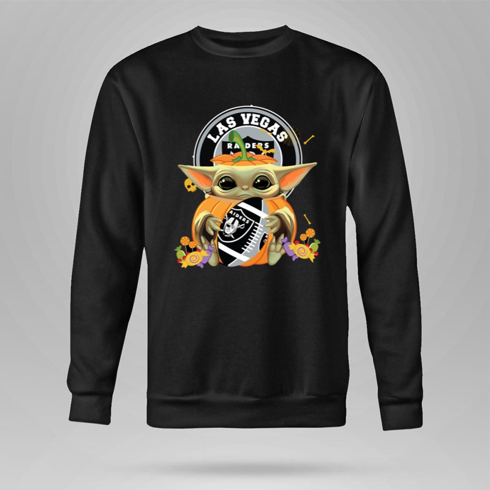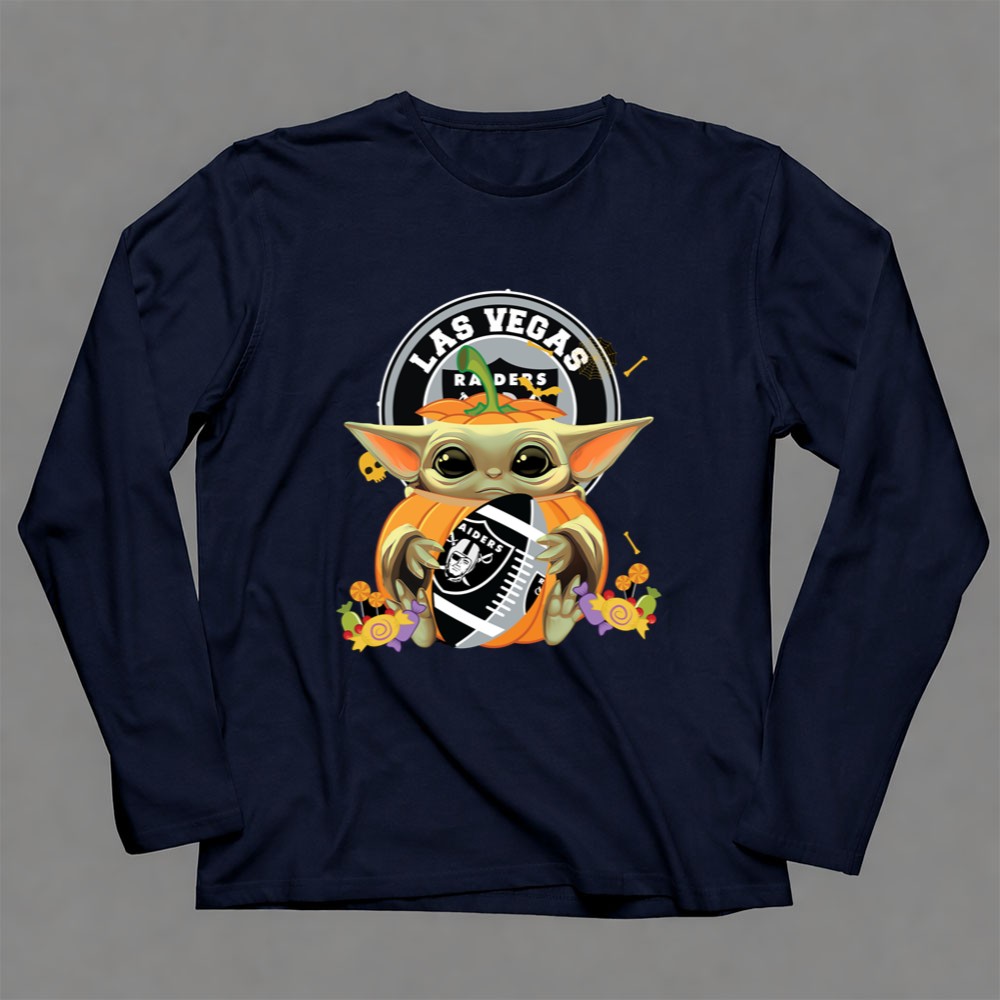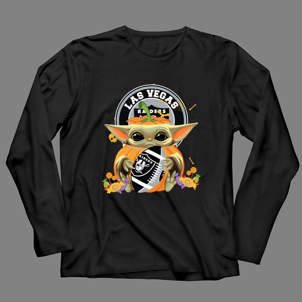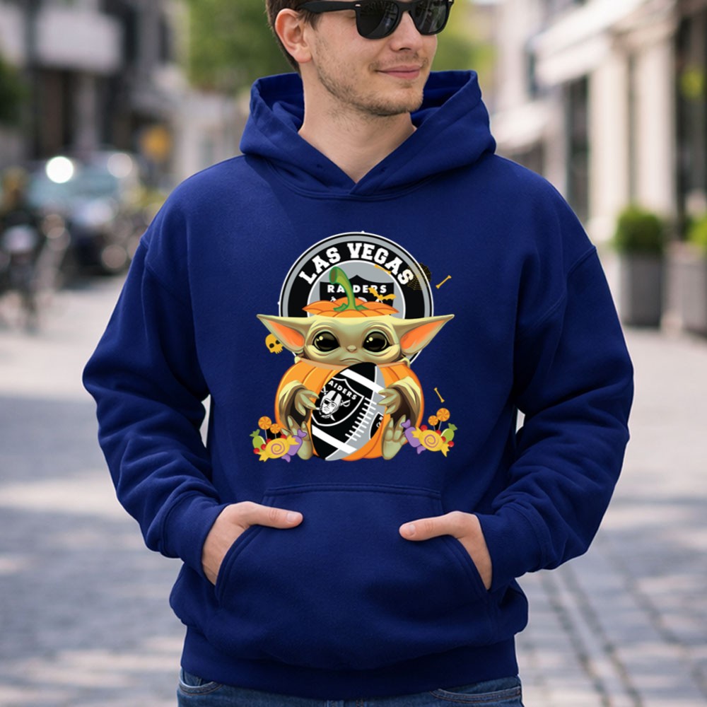 Las Vegas Raiders apparel, Baby Yoda fan gear, Halloween sports shirt, Raiders pumpkin design, Star Wars sports mashup, festive game day outfit, premium cotton t-shirt, Halloween party wear