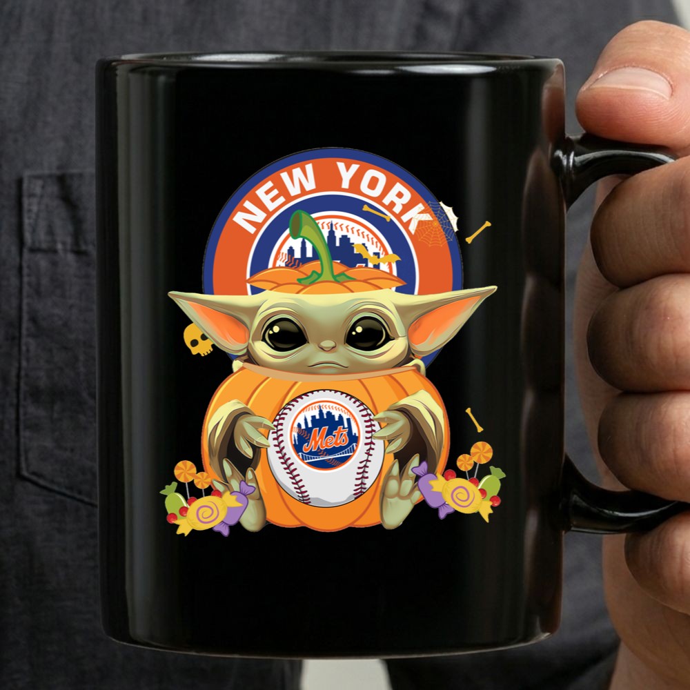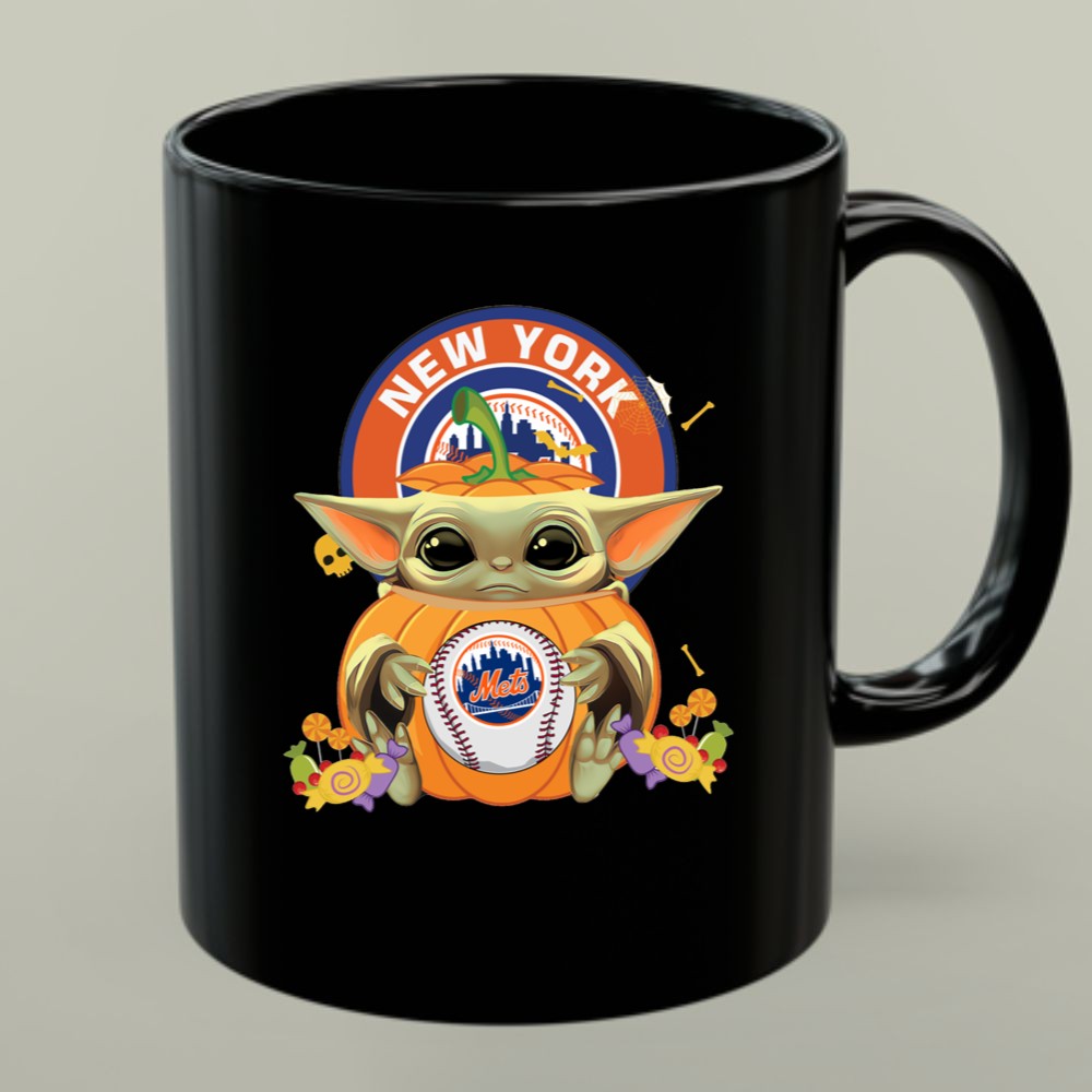 Halloween Pumpkin Baby Yoda Holding New York Mets Baseball with City Skyline Mug