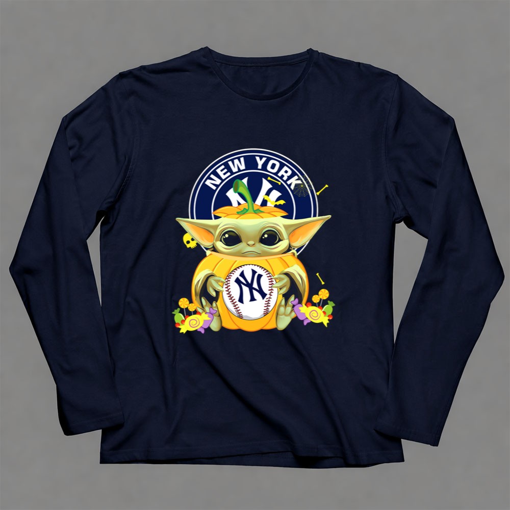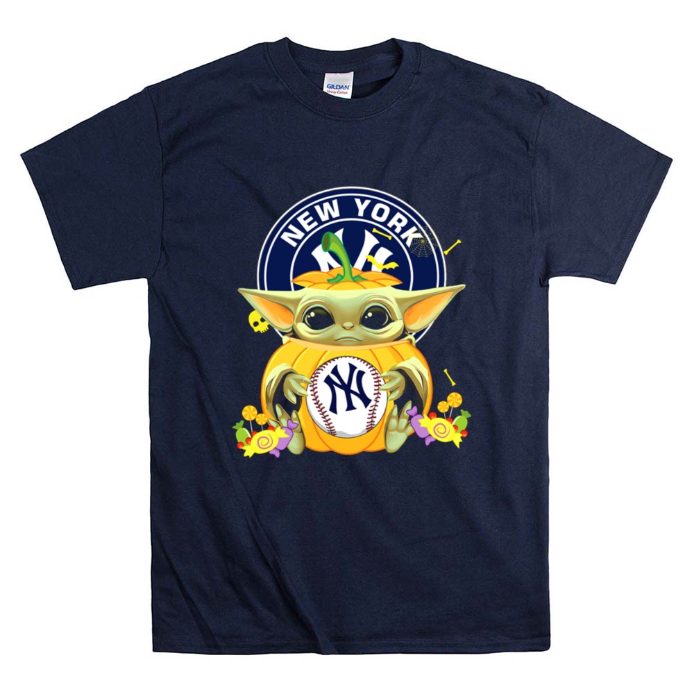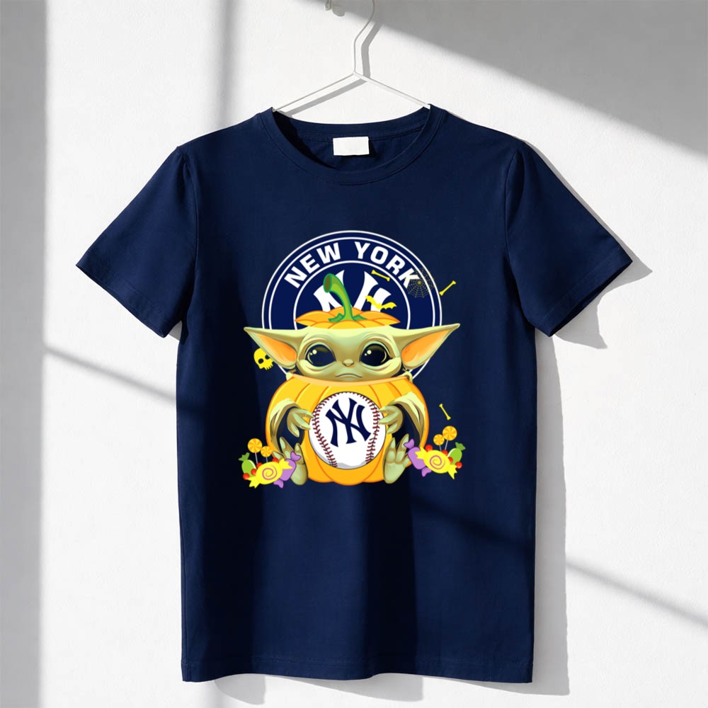 New York Yankees apparel, Baby Yoda merchandise, Halloween sports shirt, baseball fan gear, Star Wars collectibles, Yankees pride, cute Halloween tees, fall sportswear