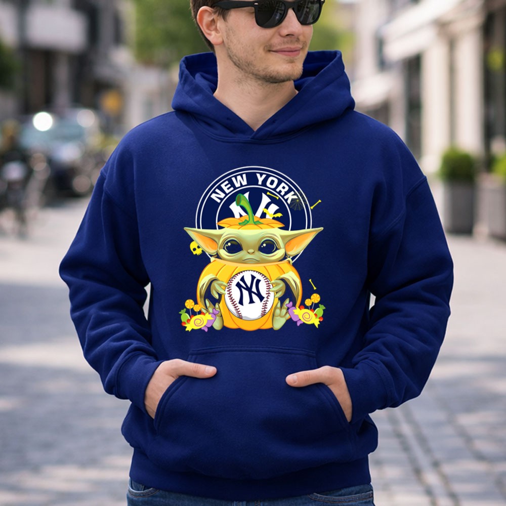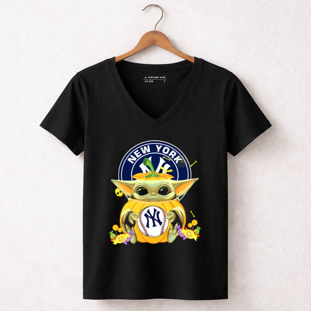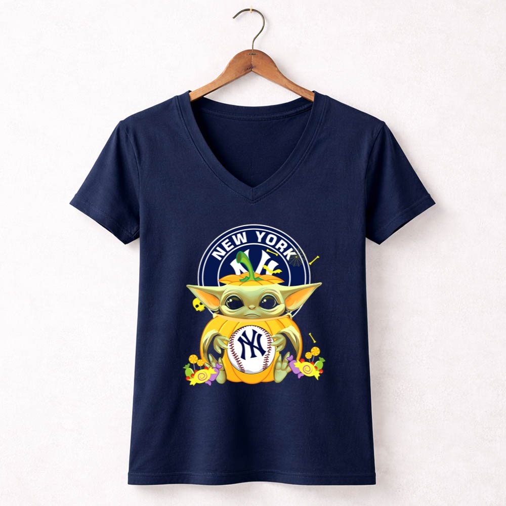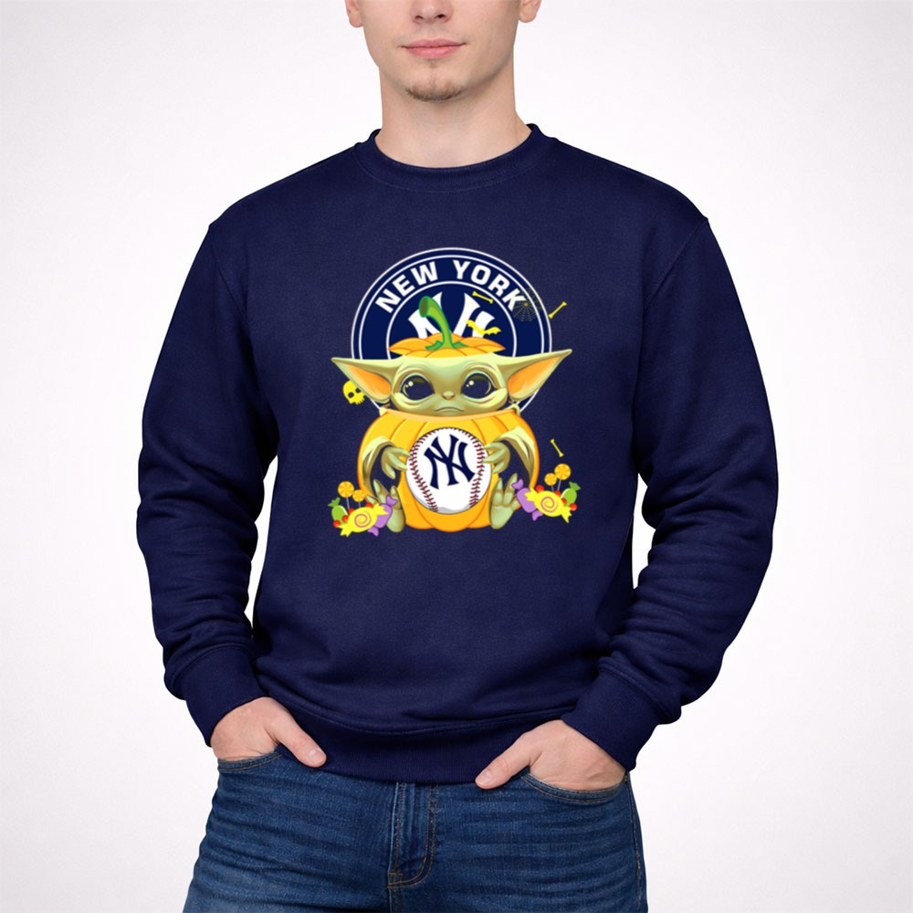 New York Yankees apparel, Baby Yoda merchandise, Halloween sports shirt, baseball fan gear, Star Wars collectibles, Yankees pride, cute Halloween tees, fall sportswear