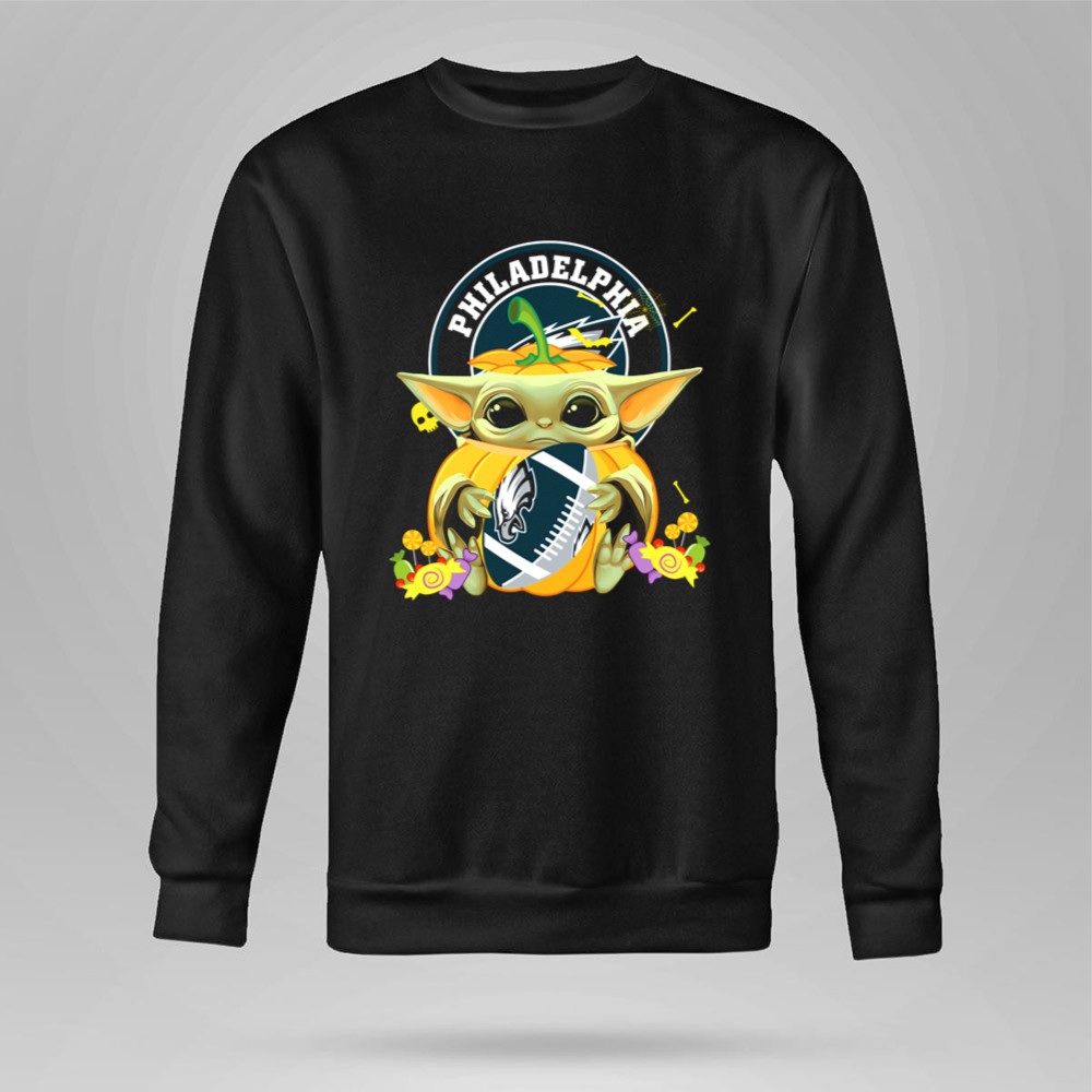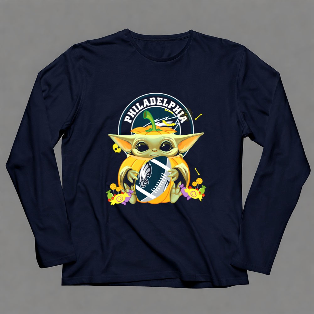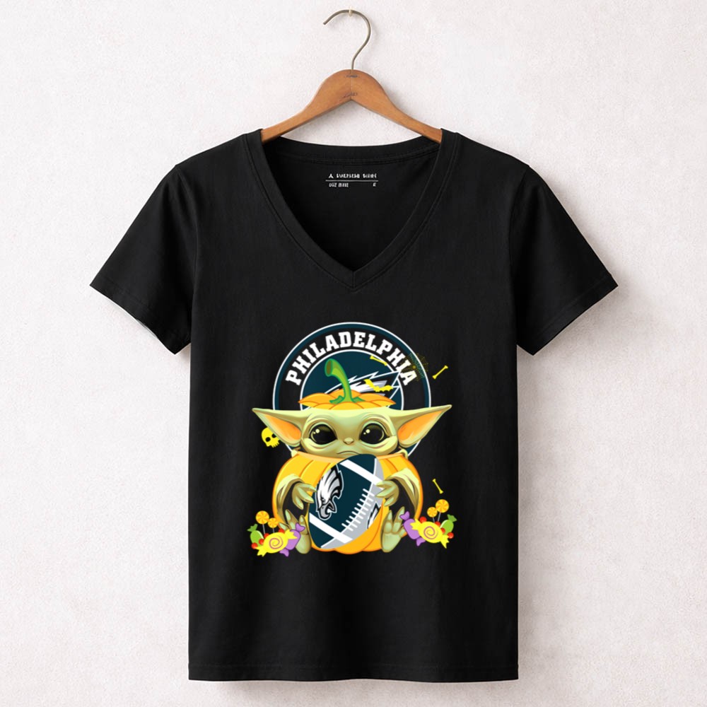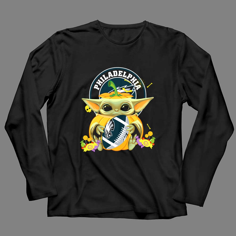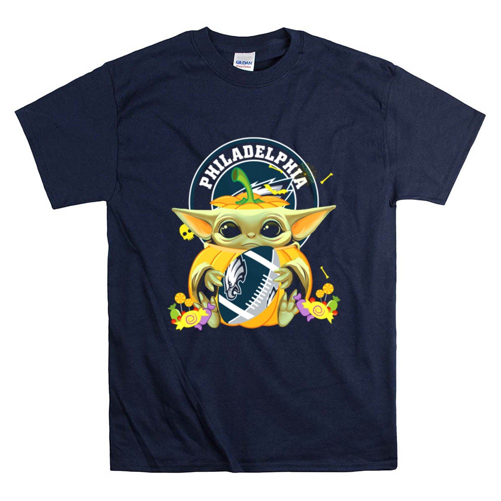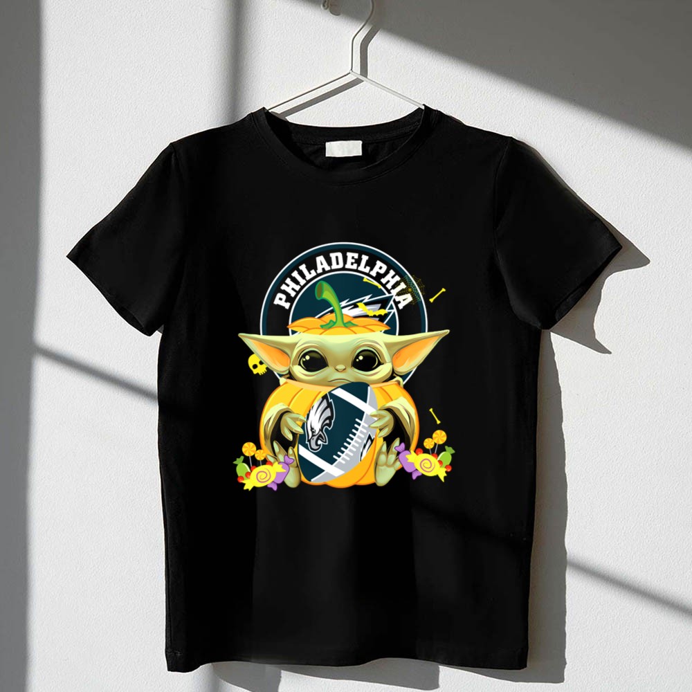Philadelphia Eagles fan gear, Halloween sports shirt, Baby Yoda NFL apparel, cute football T-shirt, Eagles pumpkin design, game day costume, Star Wars meets NFL, premium soft cotton tee