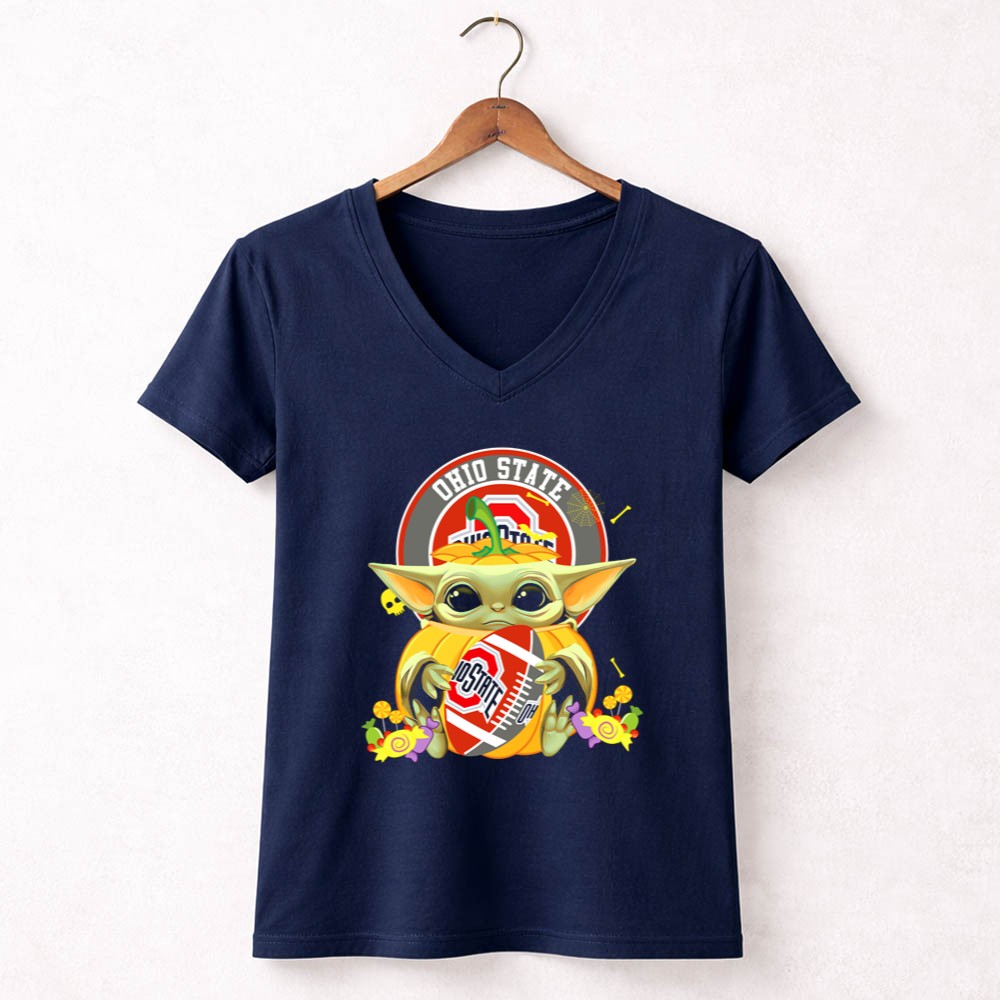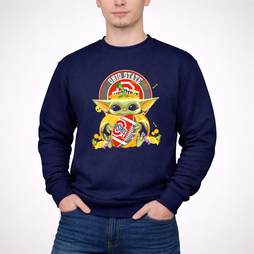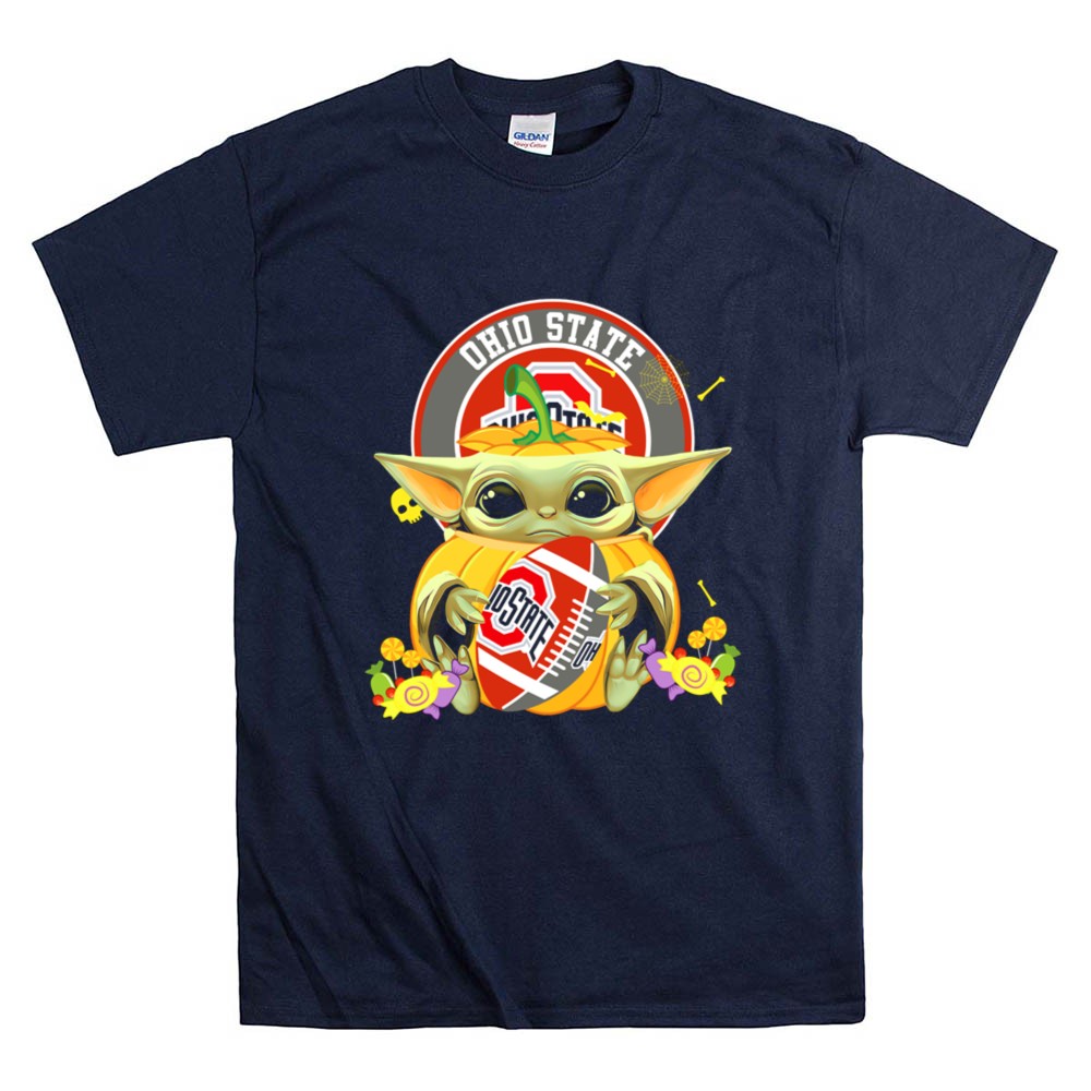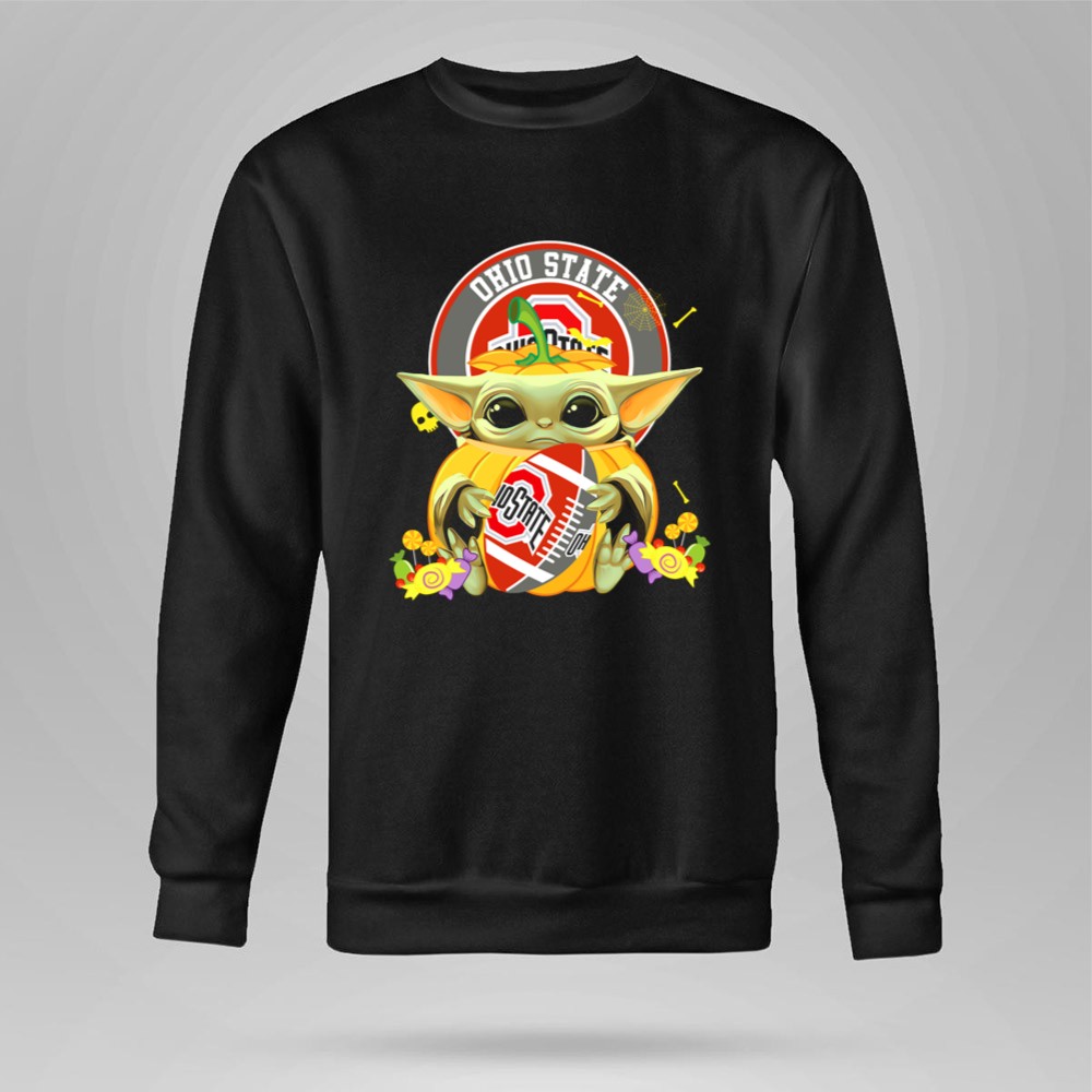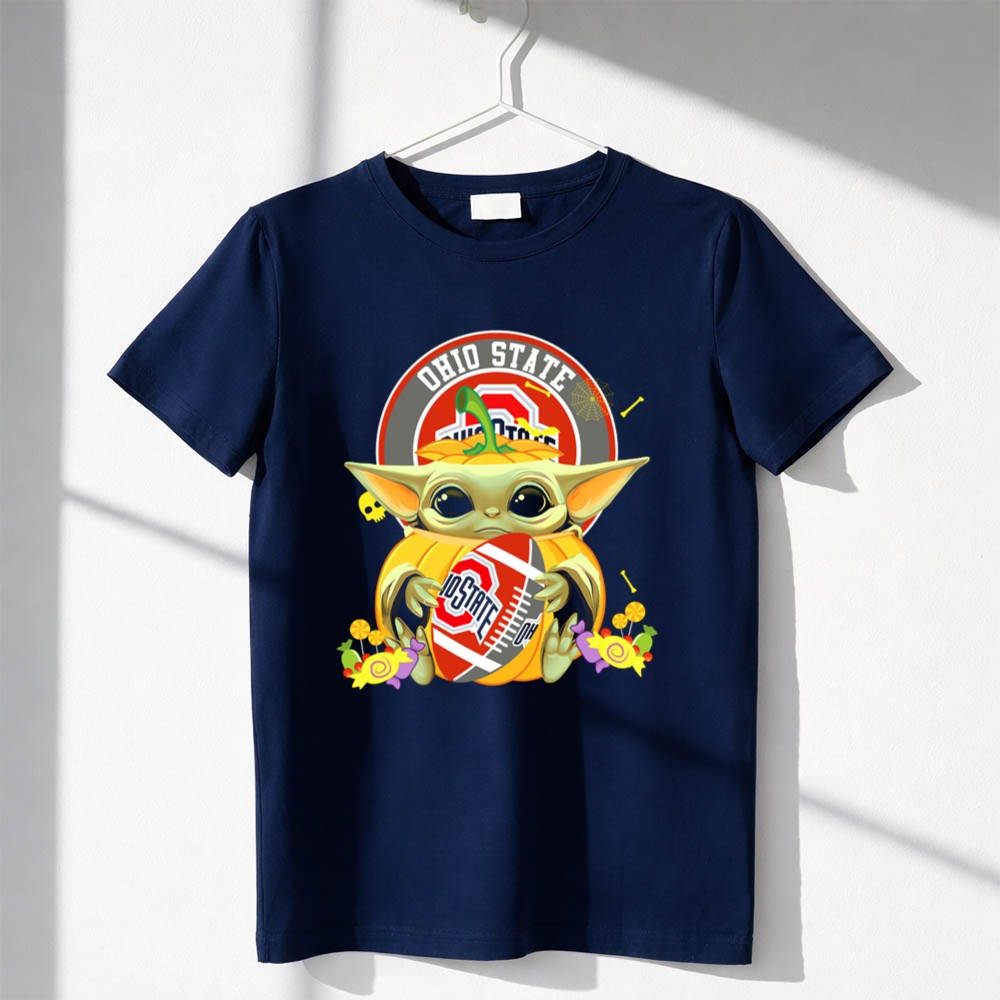 This design captures the essence of camaraderie and celebration during the Halloween season, featuring Baby Yoda cradling a pumpkin and football adorned with the Ohio State logo. It merges the joy of college football fandom with playful Halloween themes, inviting fans to celebrate their team spirit in a whimsical way. The vibrant colors and cartoon style evoke a sense of nostalgia, perfect for creating cherished memories with fellow supporters.