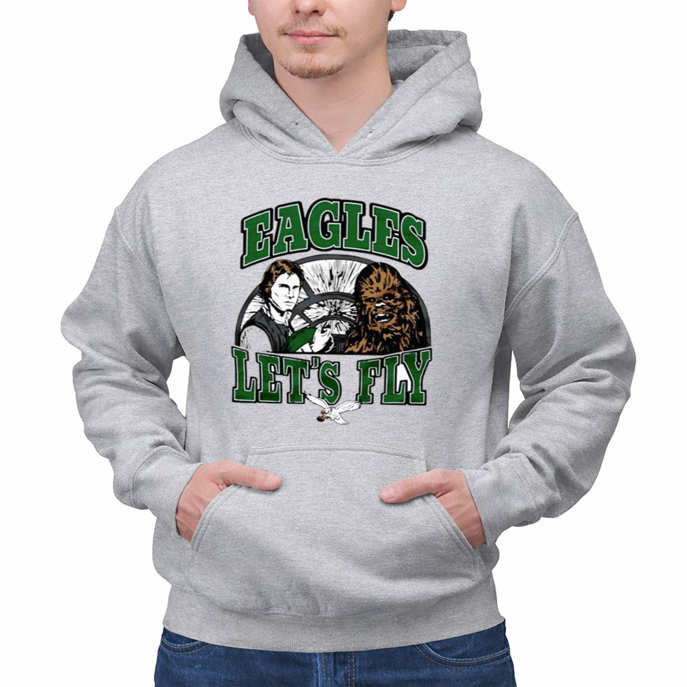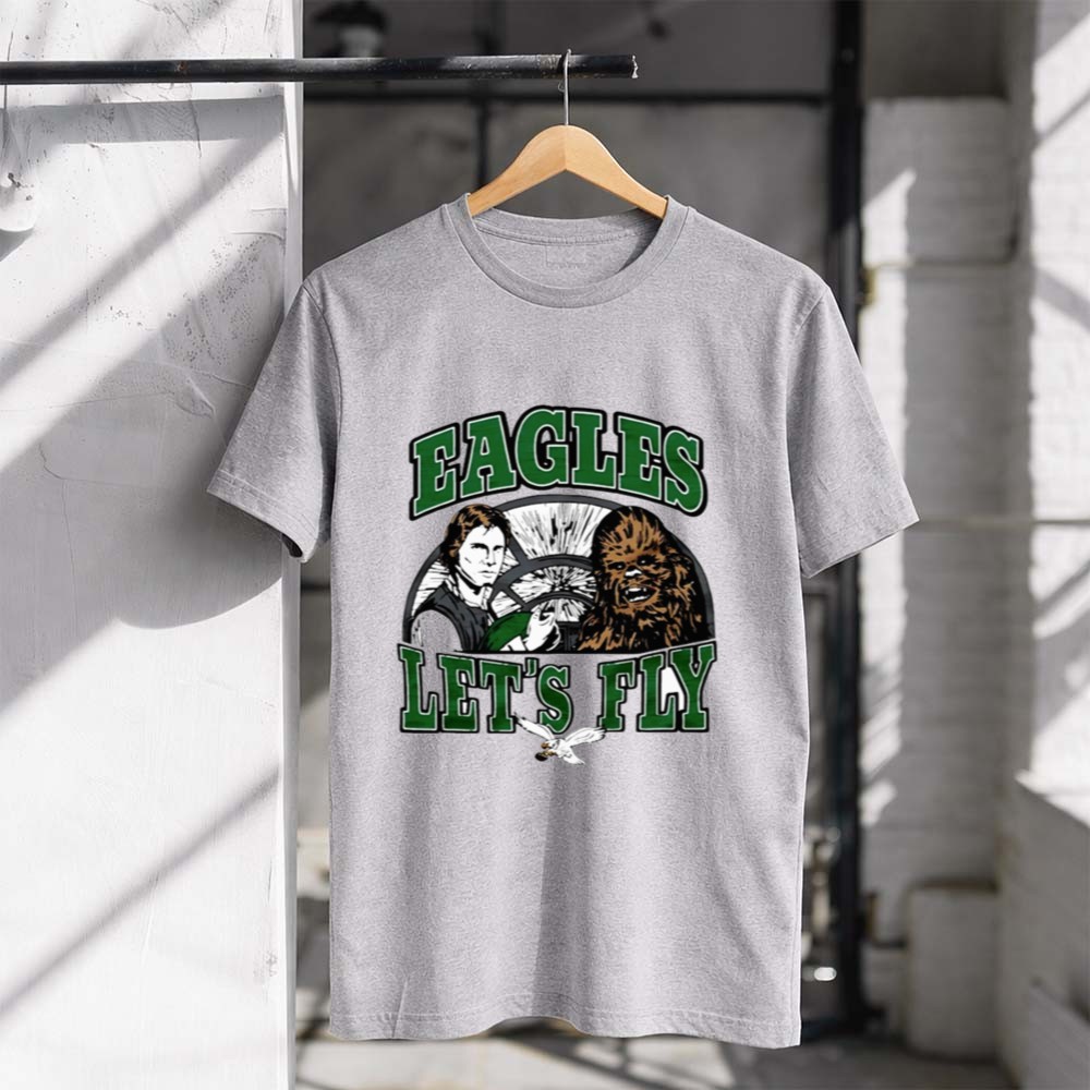 Philadelphia Eagles pride, Star Wars fandom, game day t-shirt, Han Solo, Chewbacca, NFL spirit, Eagles fans unite, Let's Fly slogan