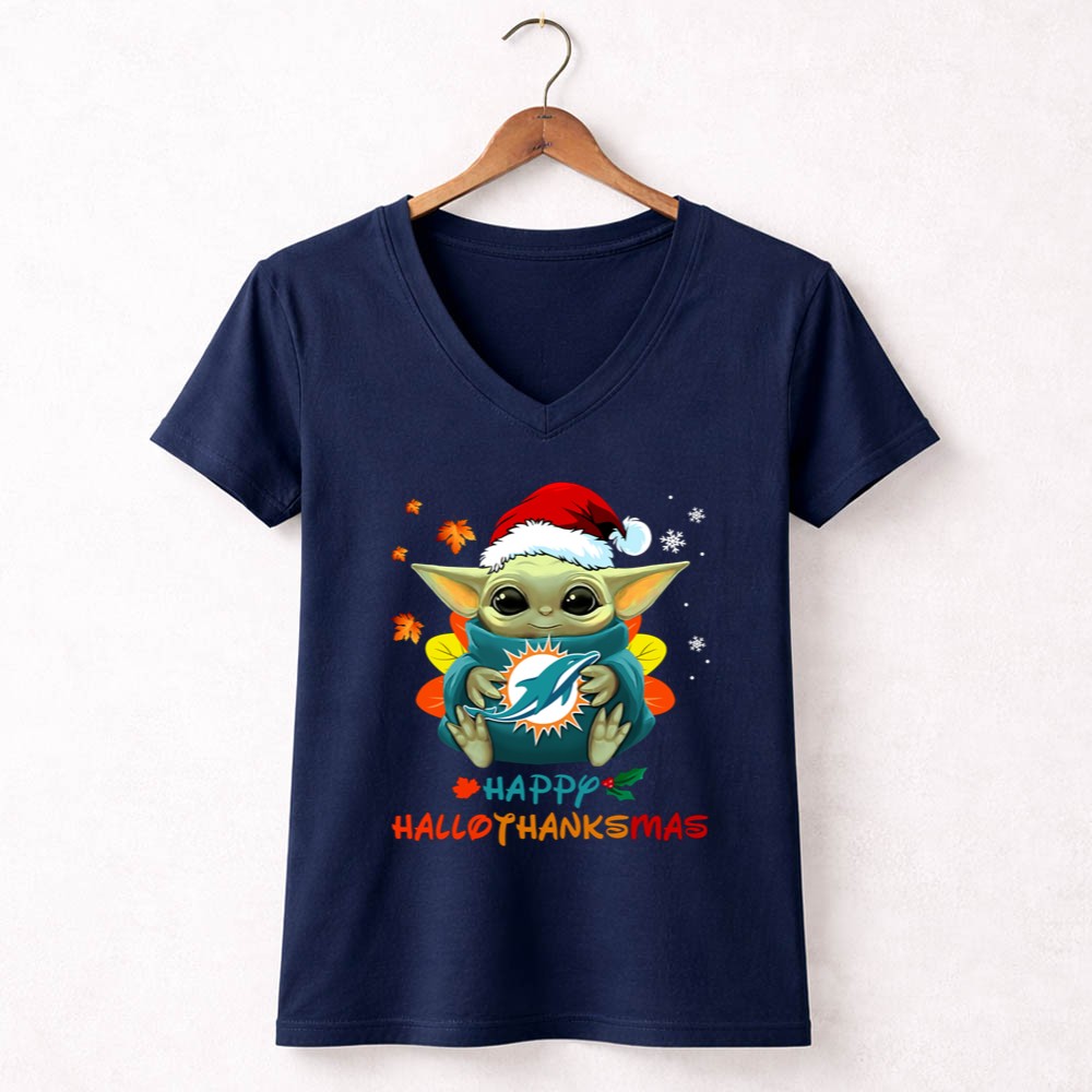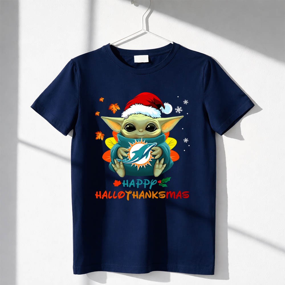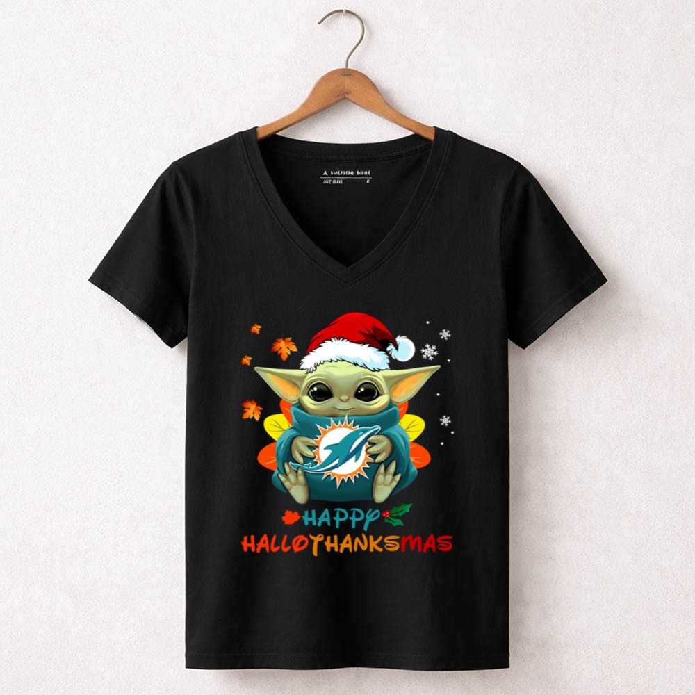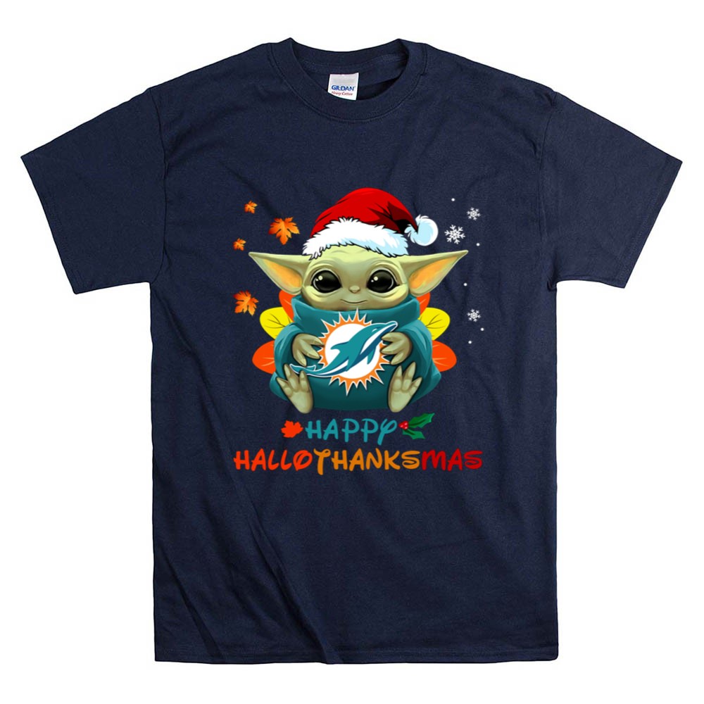 This design captures the heartwarming essence of the holidays by combining the beloved Baby Yoda with the Miami Dolphins spirit. The playful imagery evokes nostalgia and community pride, inviting fans to celebrate the season with joy and laughter. With its festive text, ‘HAPPY HALLTHANKSMAS,’ it embodies the warmth of family gatherings and the excitement of game day.