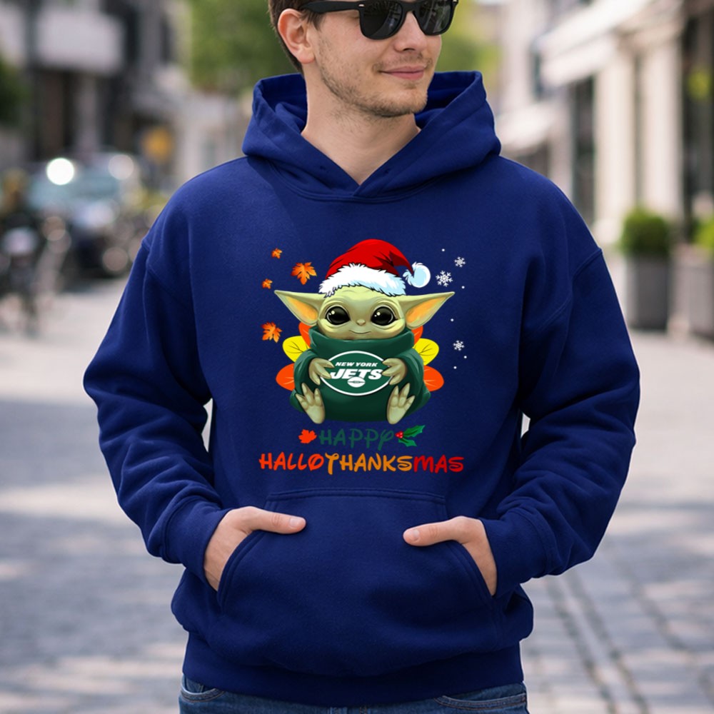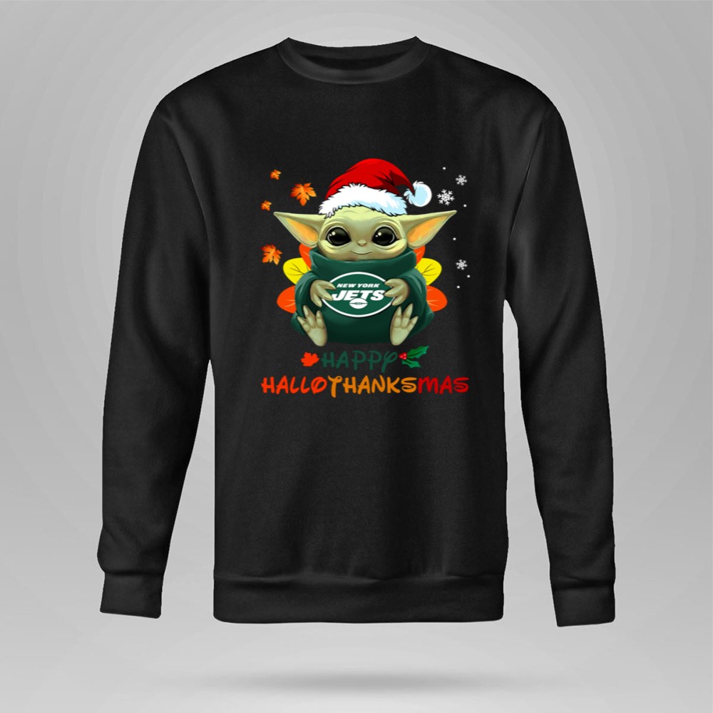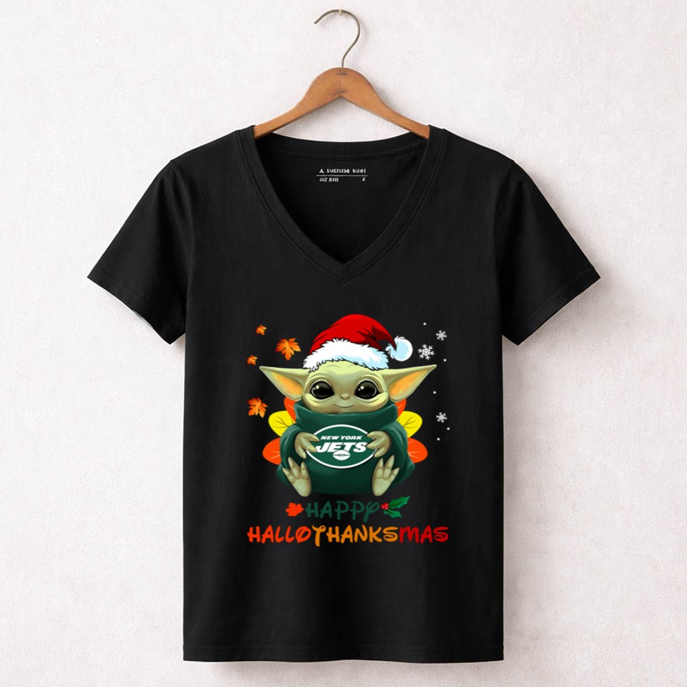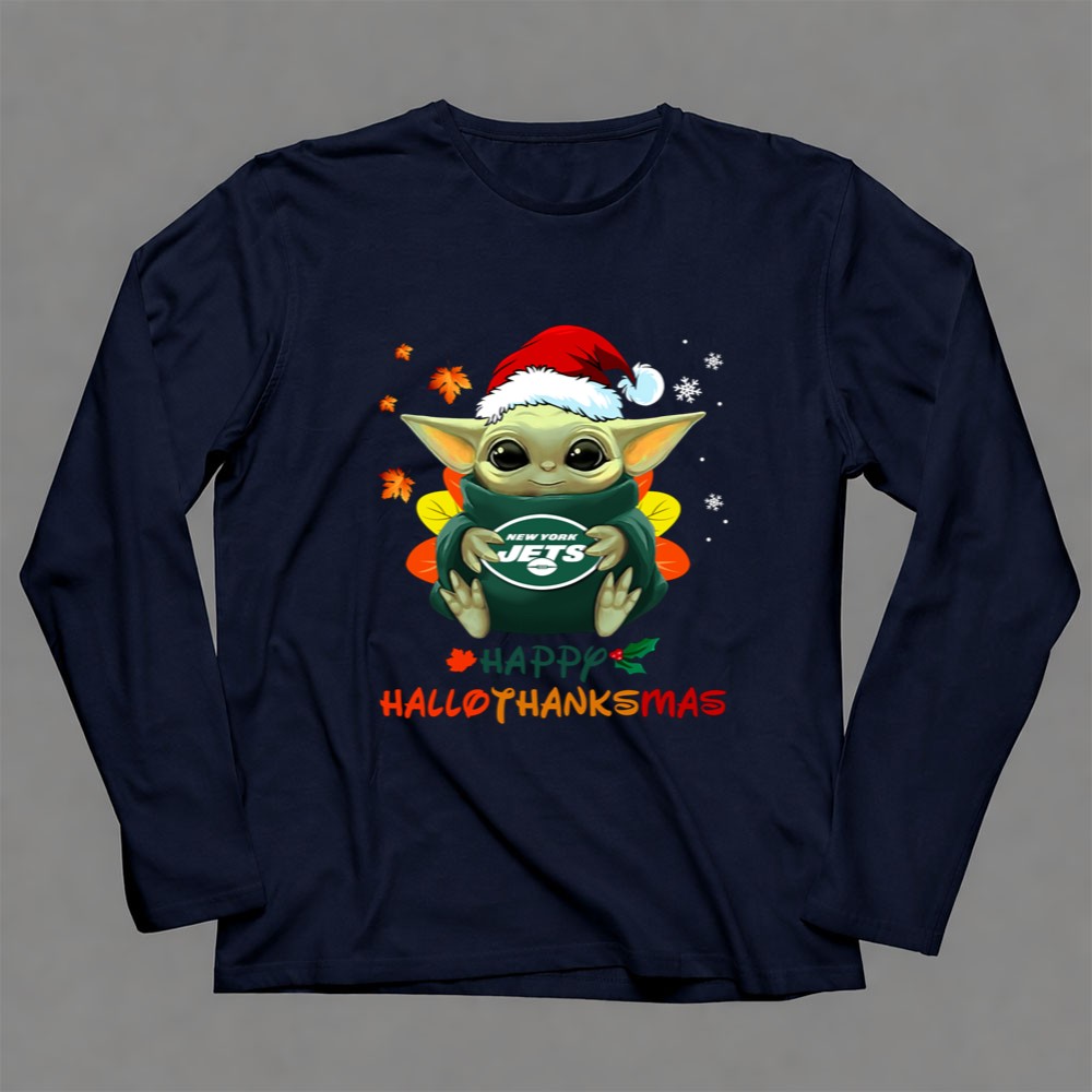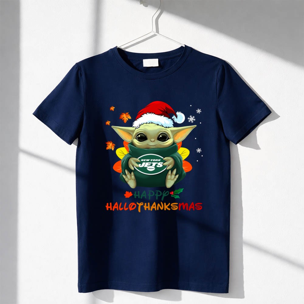 This design captures the whimsy of the holiday season, featuring Baby Yoda in a festive Santa hat, embodying the joy of family gatherings and the excitement of game day. With a New York Jets football in hand, it playfully combines fandom and holiday spirit, inviting fans to celebrate their team with a smile. The message ‘HAPPY HALLOTHANKSMAS’ encapsulates the warmth and togetherness of this special time of year.